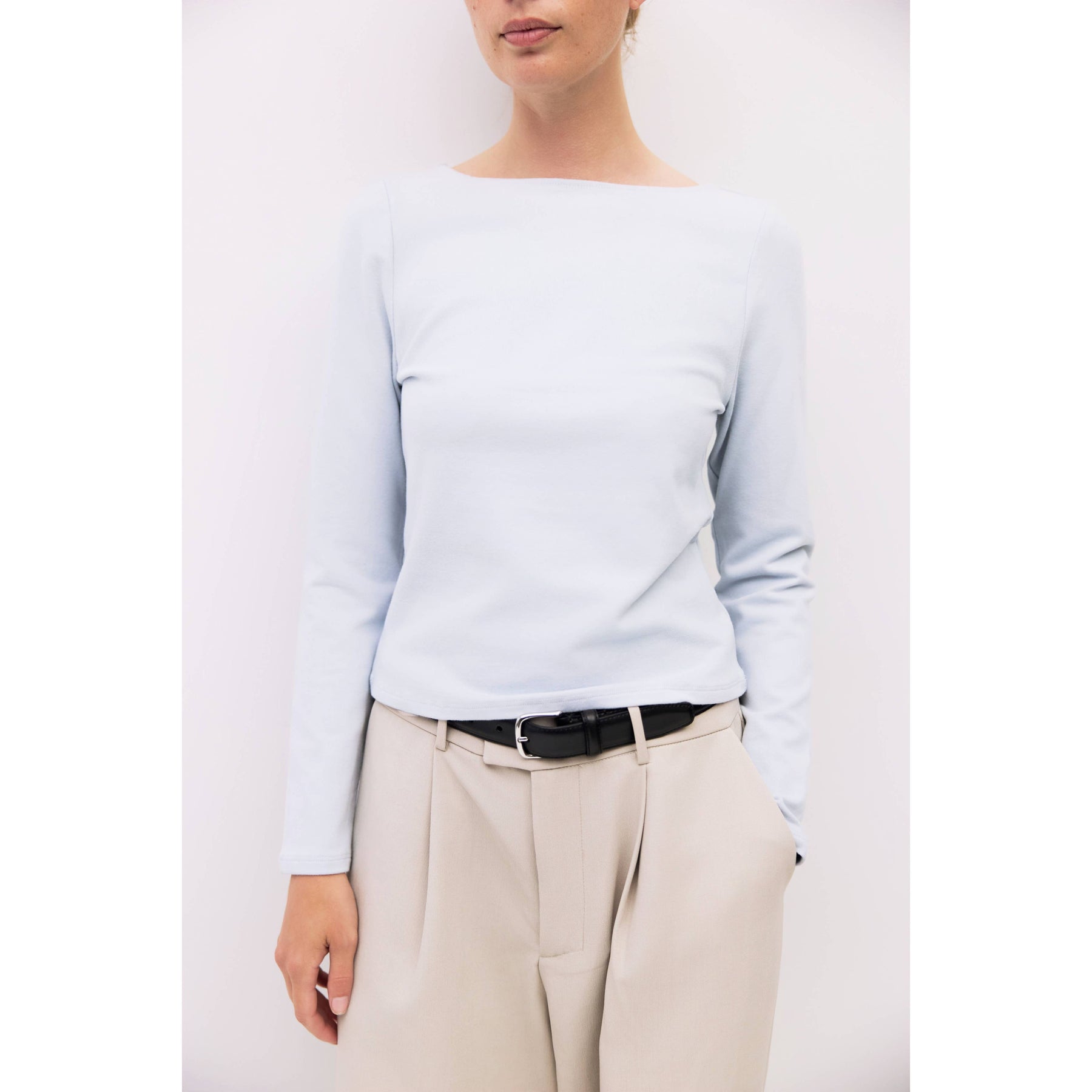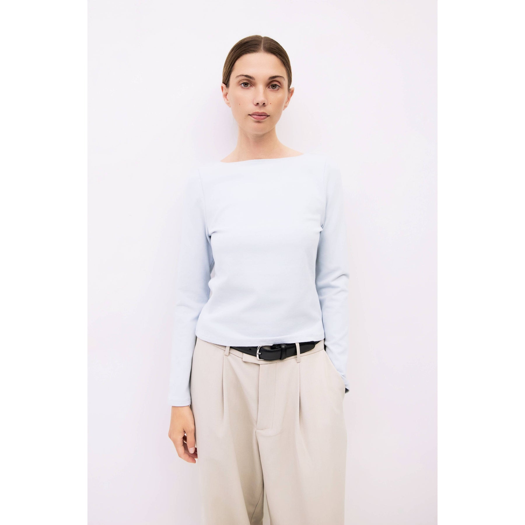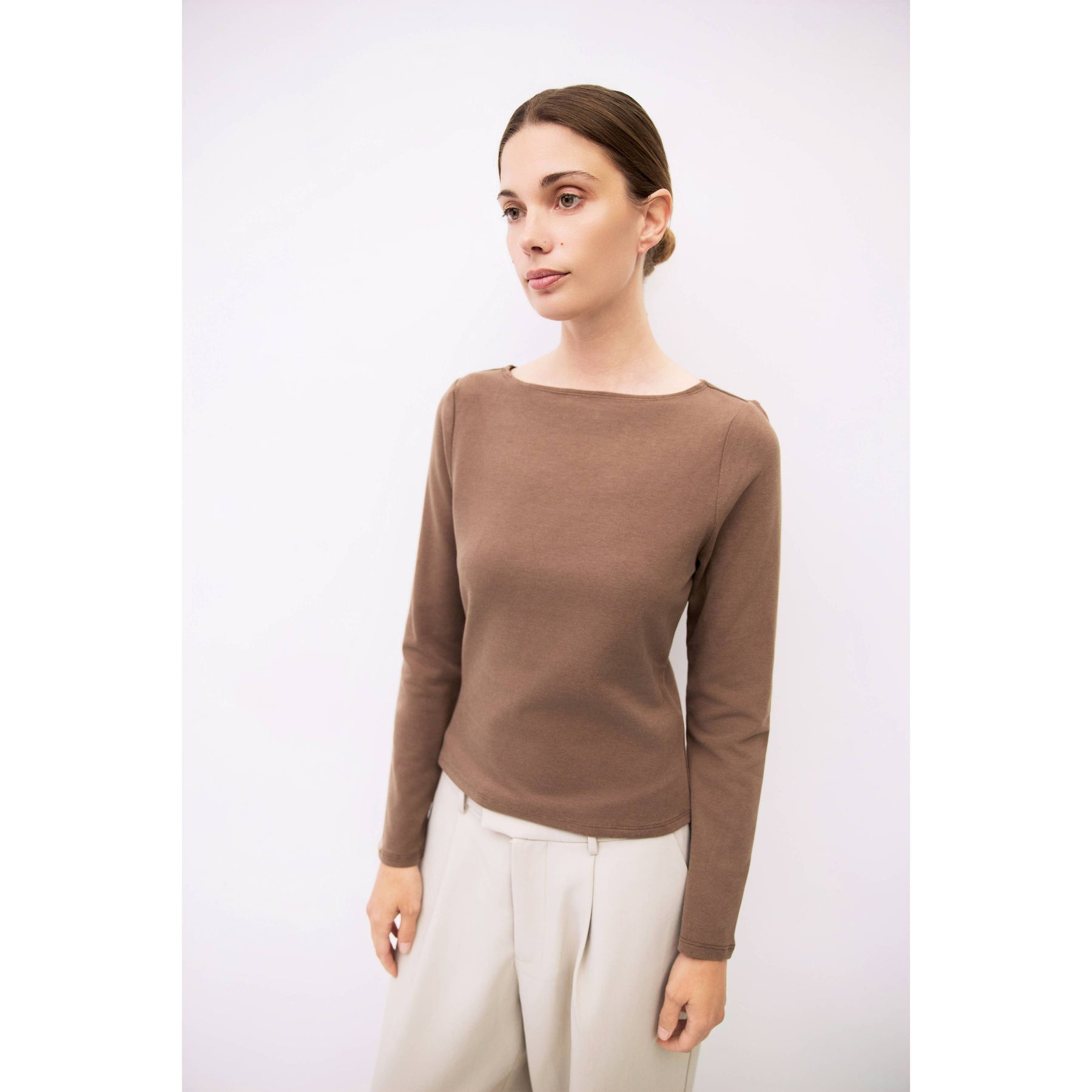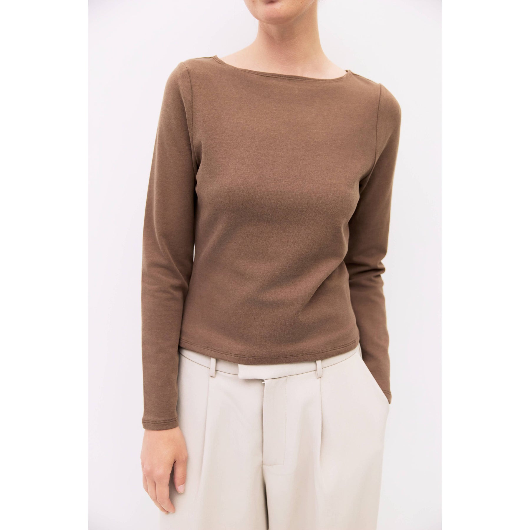The Martina Top is a fitted long-sleeved tee made from soft brushed jersey. It features a wide neckline and a sleek silhouette. Perfect for layering or wearing on its own with a comfortable, refined feel.