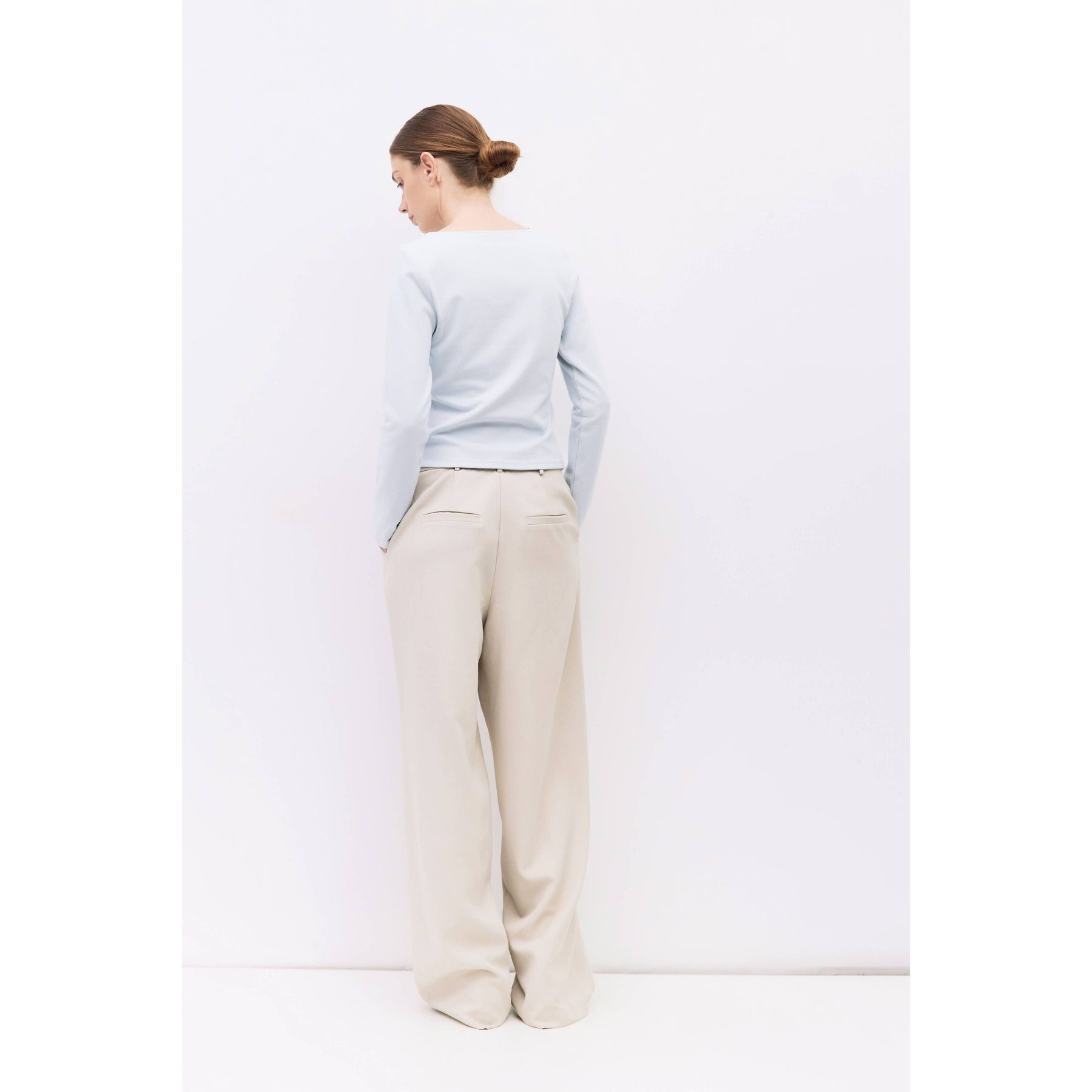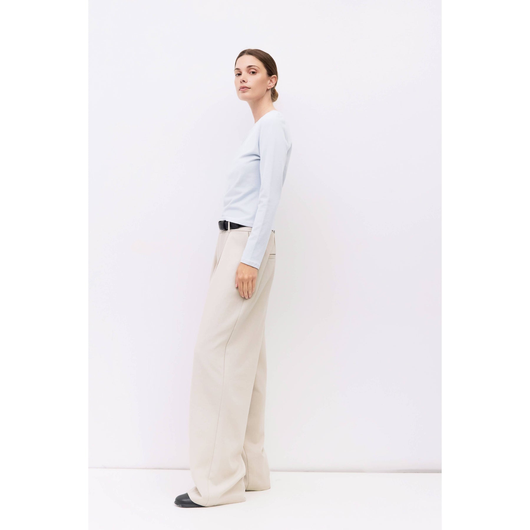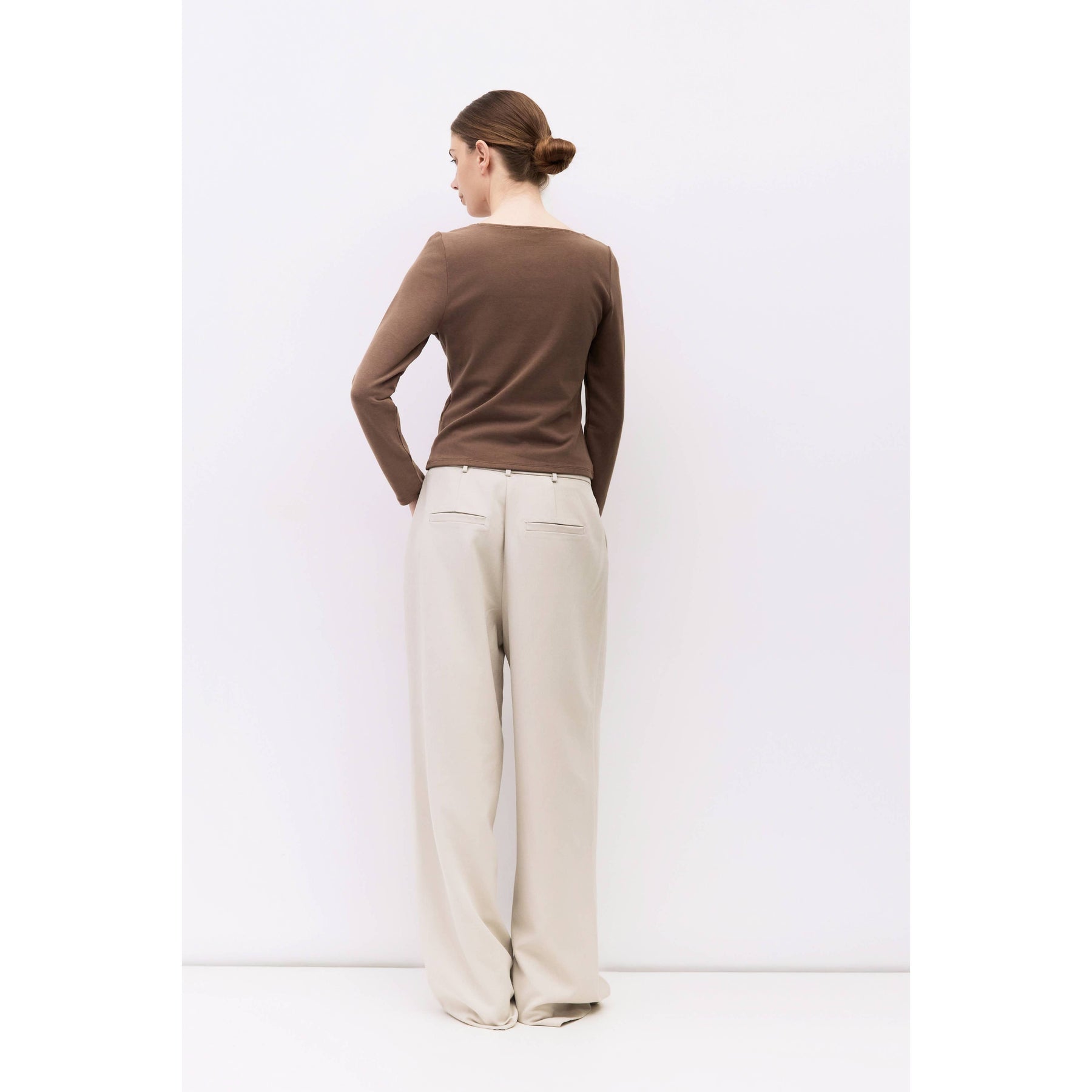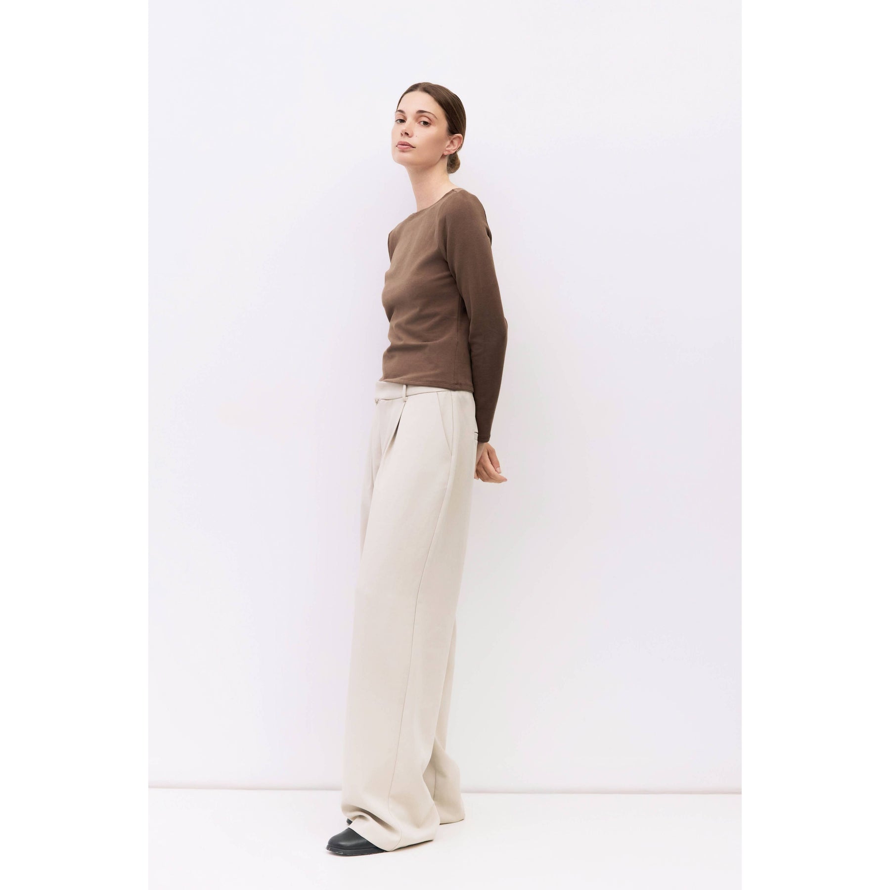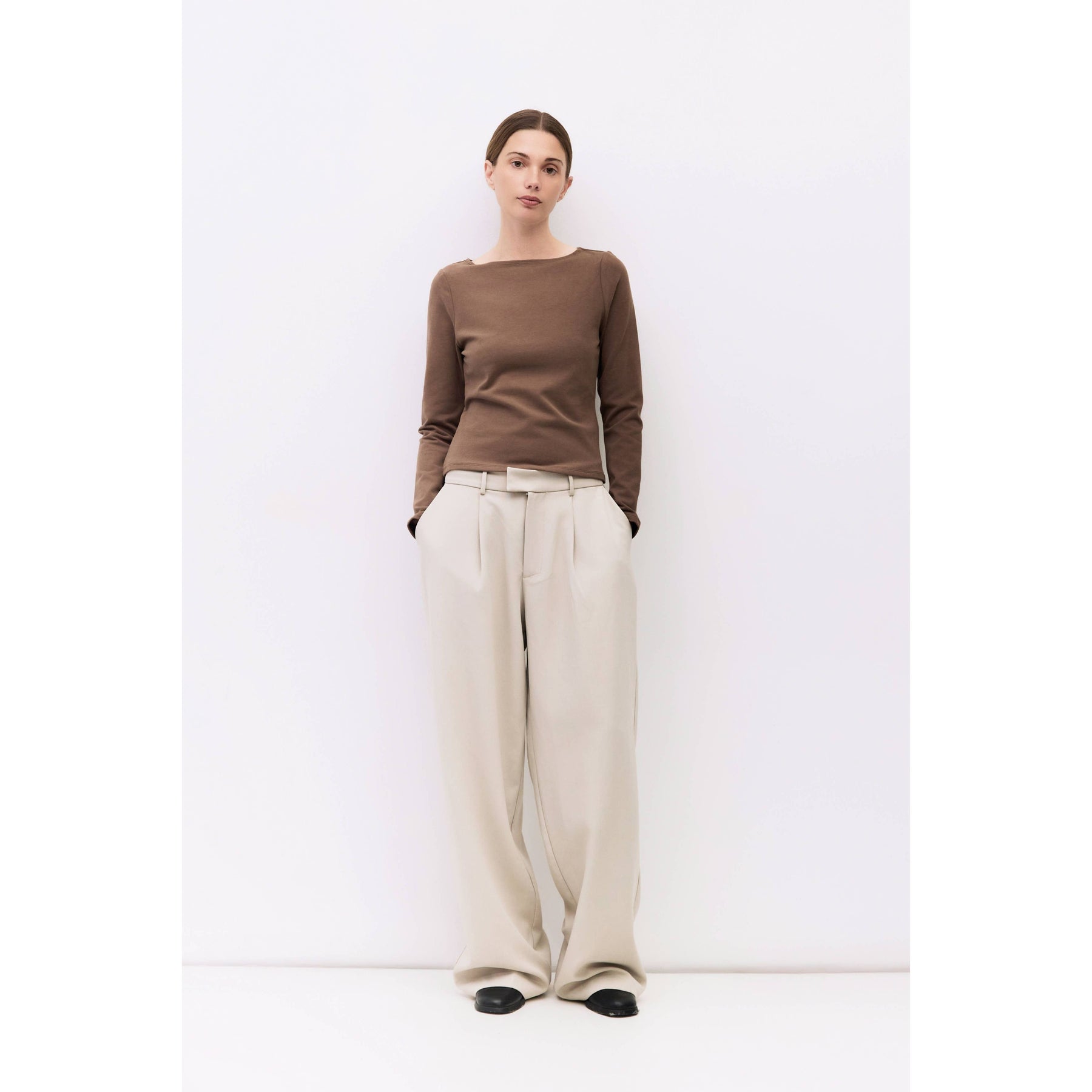 The Martina Top is a fitted long-sleeved tee made from soft brushed jersey. It features a wide neckline and a sleek silhouette. Perfect for layering or wearing on its own with a comfortable, refined feel.