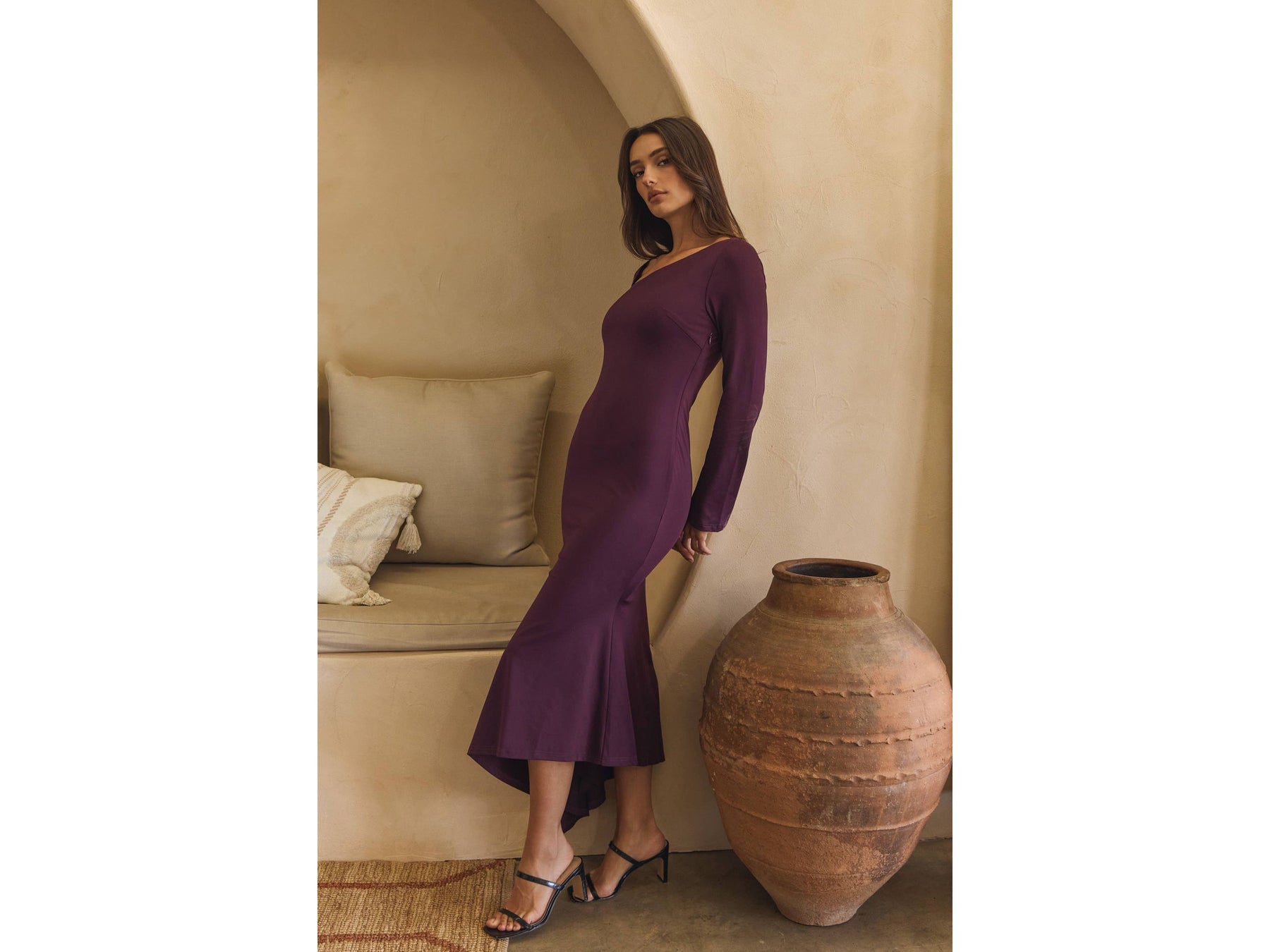 Meet your new go-to midi dress! This midi dress features a plum-coloured jersey fabric with long sleeves and an unexpected asymmetric twist. The playful ruffle skirt brings just the right amount of personality to your wardrobe.