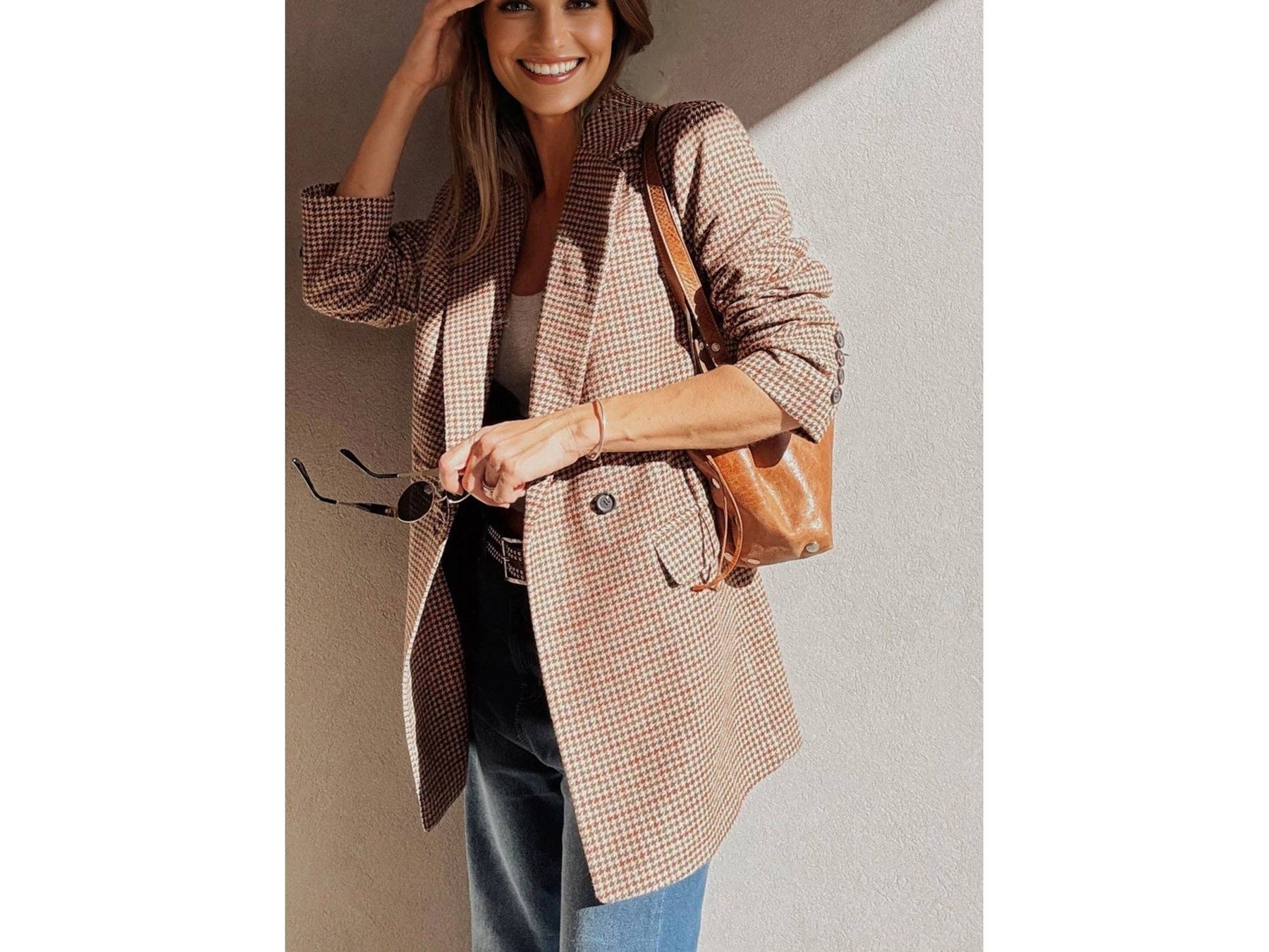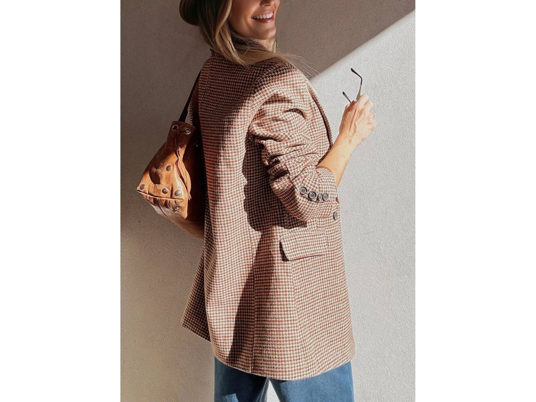 A refined addition to any wardrobe, this brown houndstooth blazer embodies understated elegance. The precisely tailored construction flatters a variety of body types with its impeccable fit, while the distinguished lapel collar and double-breasted silhouette convey quiet confidence. Faux-wood button details at the cuffs introduce subtle texture and warmth. Practical front pockets complete the design, offering both aesthetic appeal and everyday functionality. An investment piece that transcends seasons and occasions.