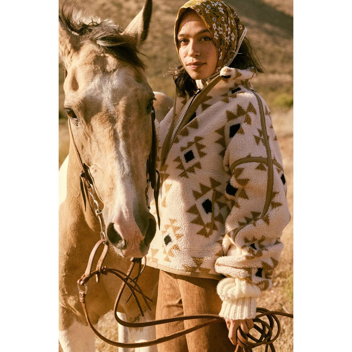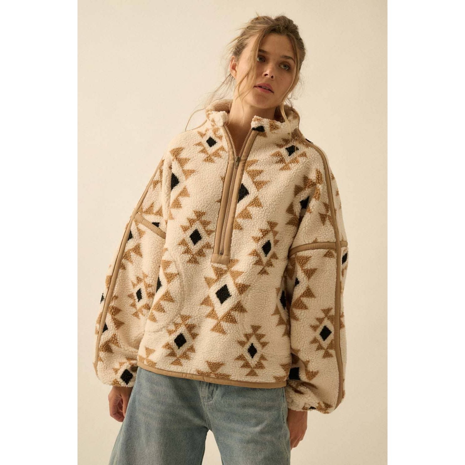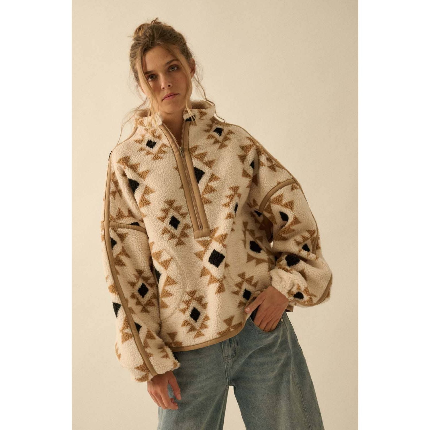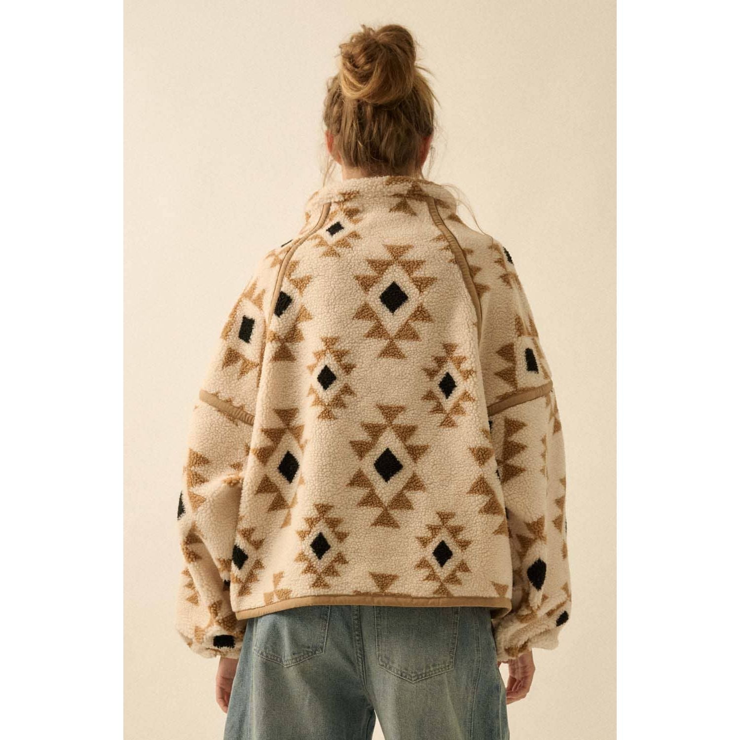 Cozy up in this sherpa fleece pullover jacket featuring a funky geometric print. It has a snug high collar, a fun half-zip front, and handy side pockets for your essentials. With long sleeves finished off by elastic cuffs and a relaxed drop shoulder fit, plus eye-catching contrast trim all around, it’s the perfect blend of comfort and style.