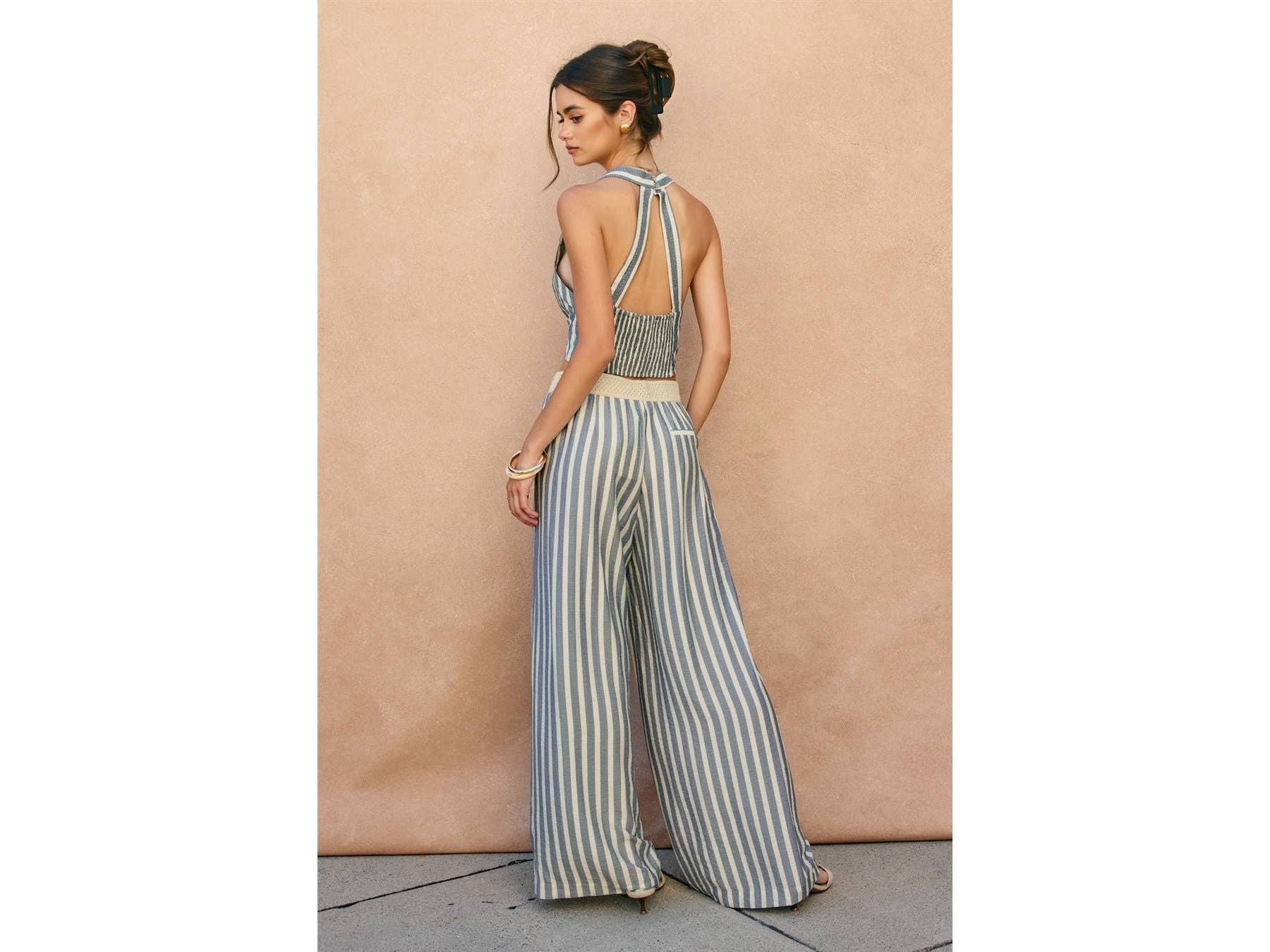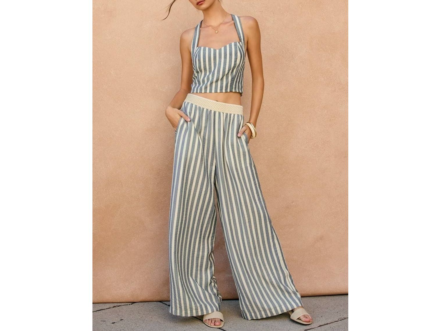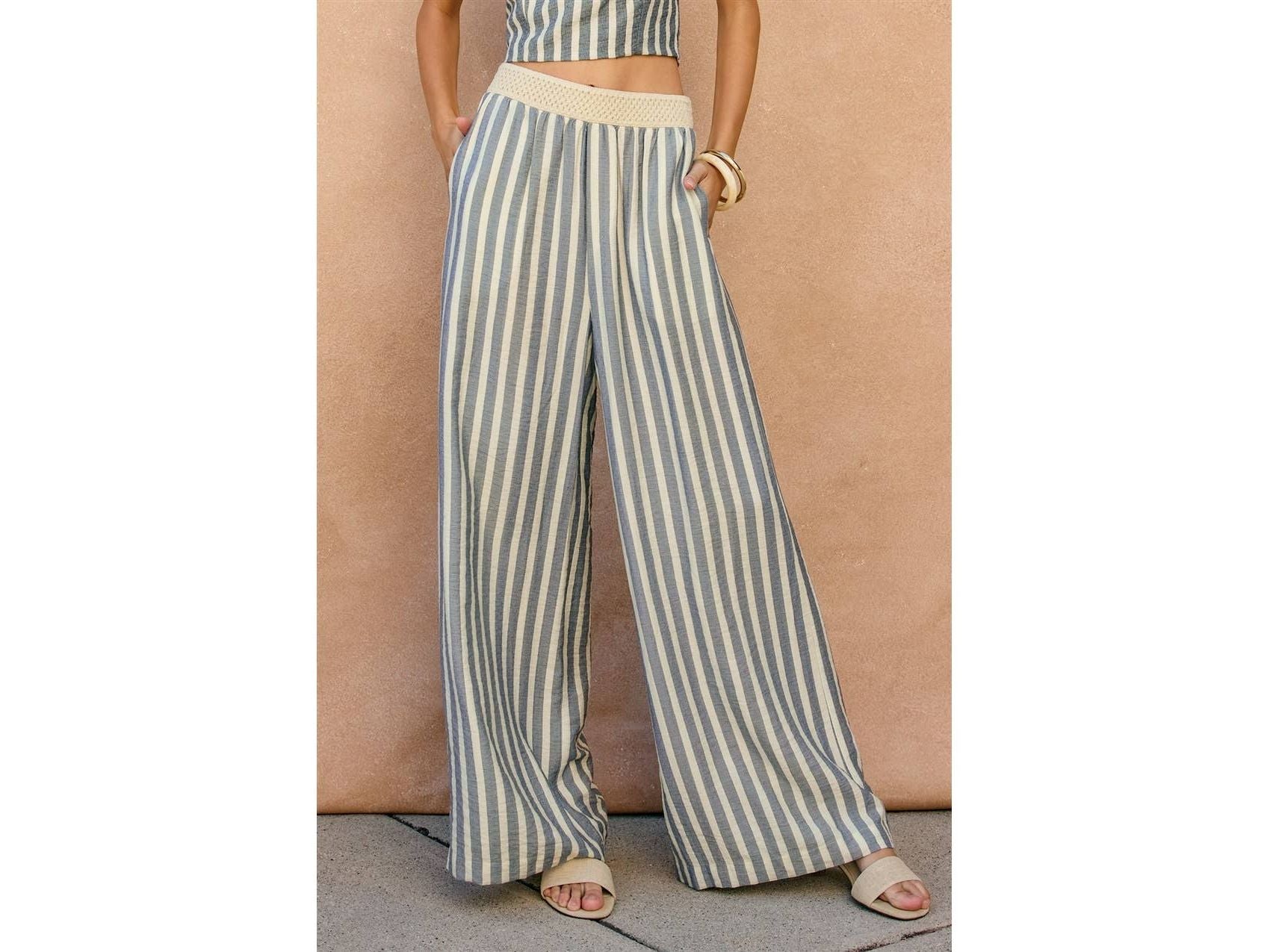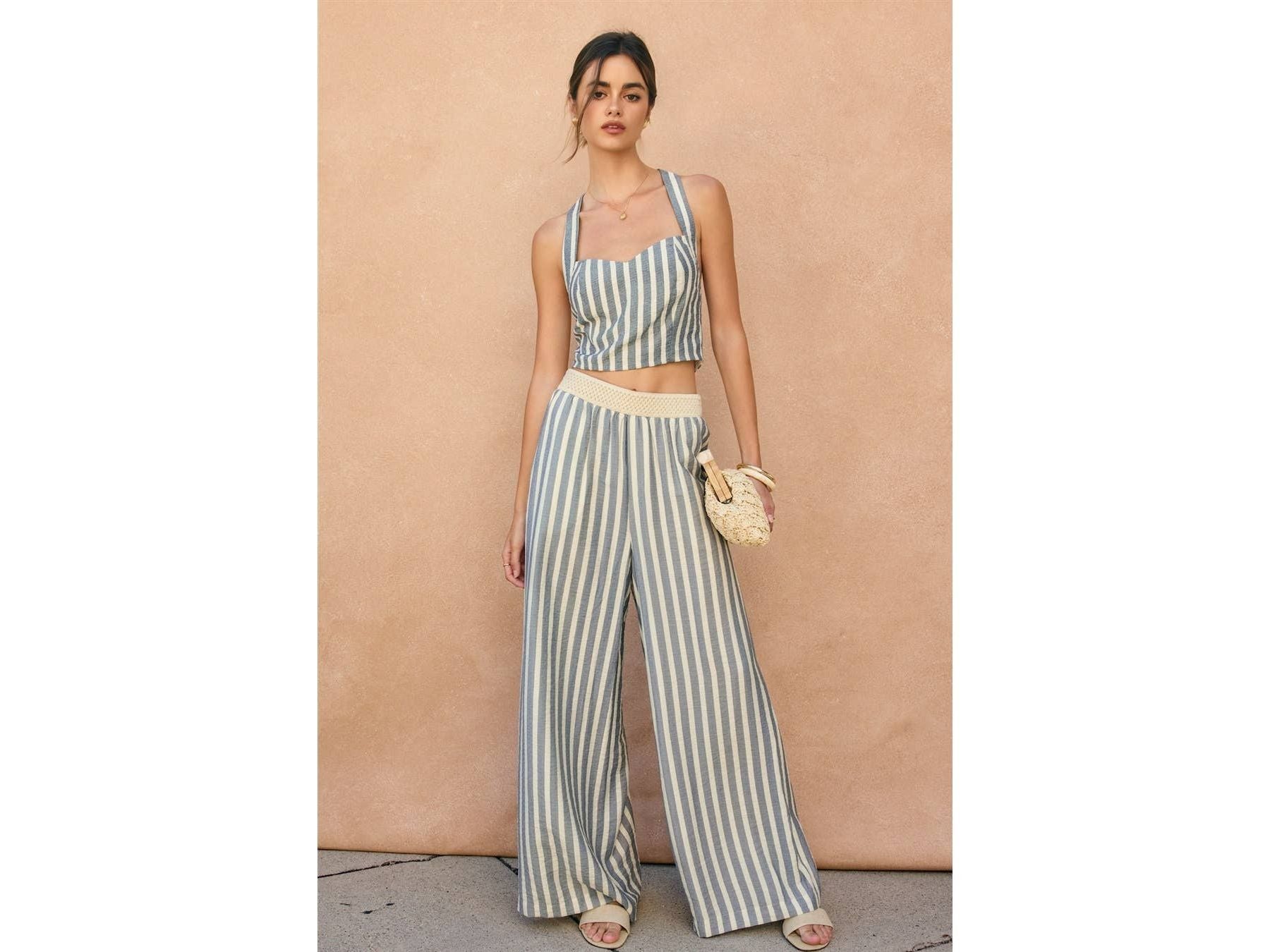FP13374-CP672_1 Stripe print breezy rayon linen pull on pants featuring a decorative knitted elastic waistband. Model is 5'9" and wearing size Small. - Pull on design - Relaxed fit - Knit pattern on top of elastic waistband - Side pockets - Right side faux welt pocket - 29 inch inseam - Shorts lining Matching tops: FT13399-CP672, FT13789-CP672, FT12472-CP672 Shell: 80% Rayon, 20% Nylon Lining: None