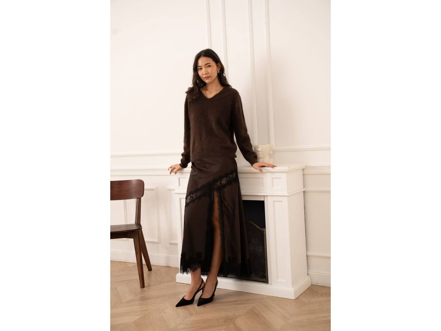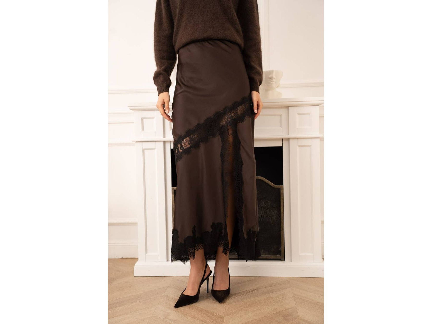 Discover the chicest skirt of the season! This satin maxi skirt features an asymmetrical lace design. The elastic waistband allows for comfort while still providing a touch of elegance. Pair with a sweater to make it casual or with your favourite blouse for any night out!