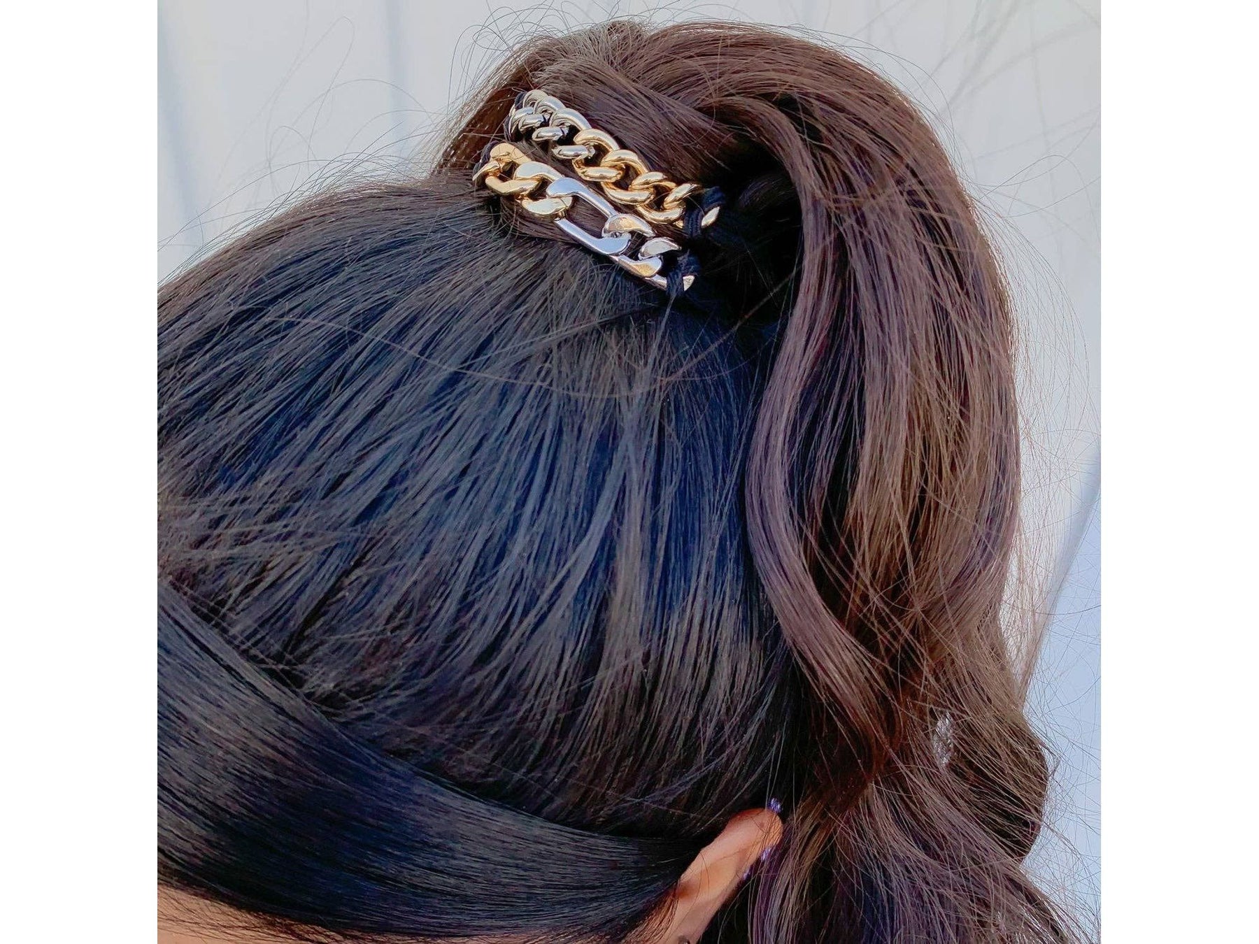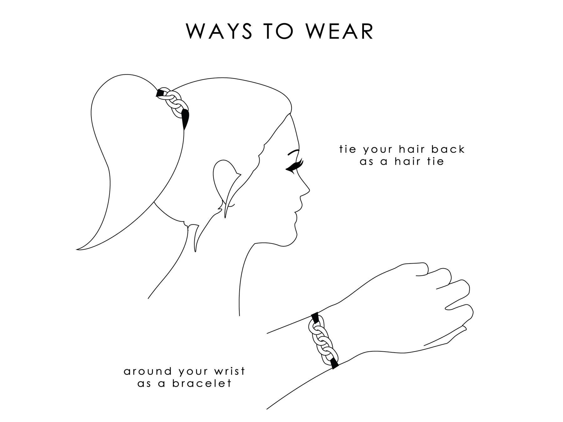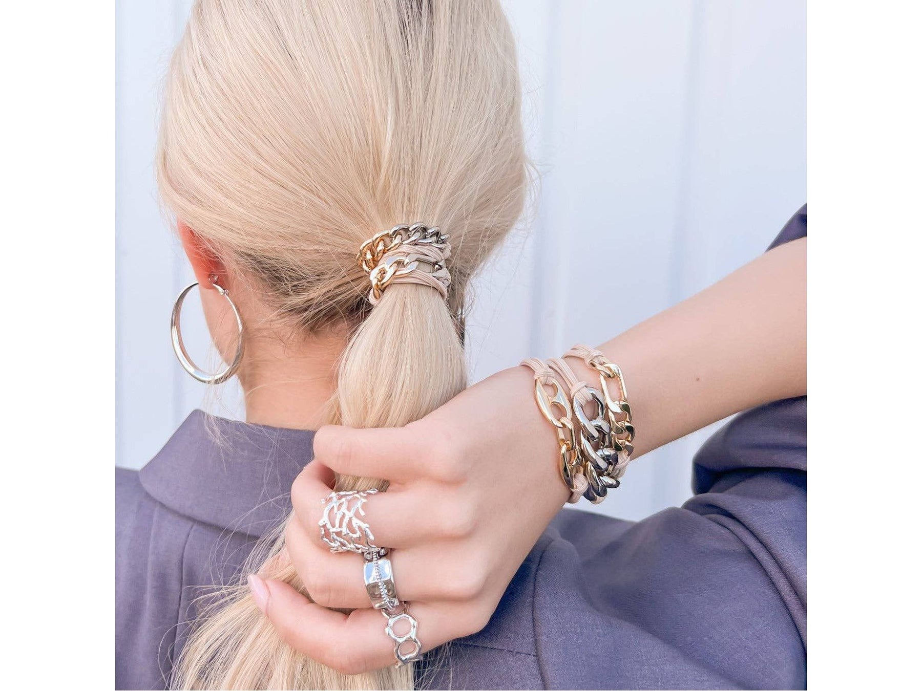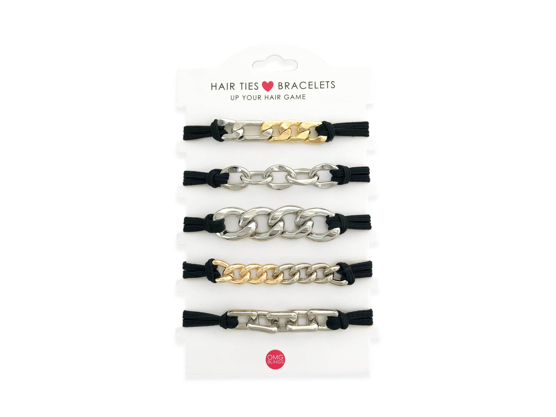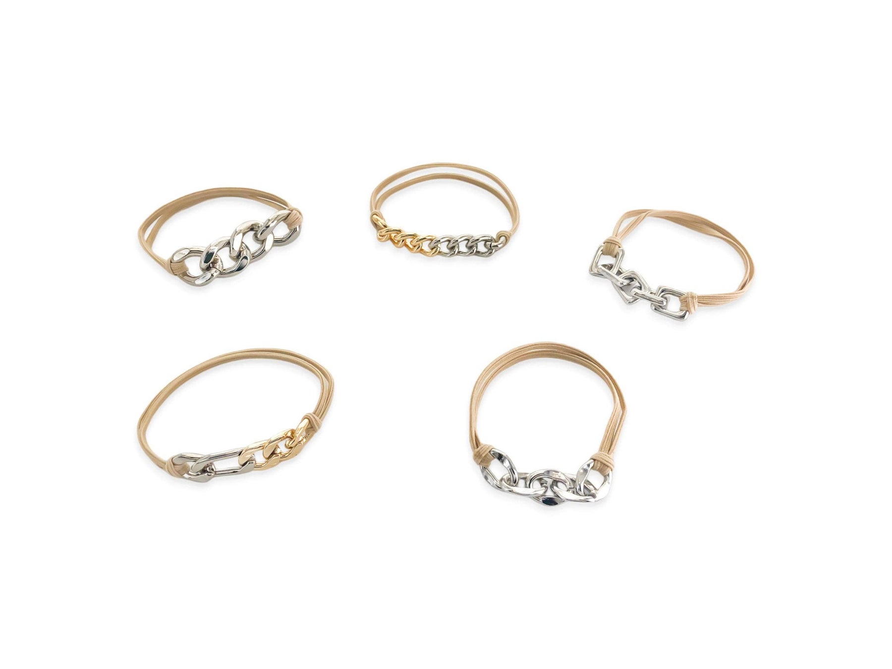 Add a touch of flair to your everyday look with this versatile 5-piece hair tie and bracelet set. Featuring five unique chain styles: a two-tone alt chain, an 'O' chain, a thick curb chain, a two-tone curb chain, and a square chain. Each piece is crafted with 14k gold on rhodium (silver) triple plating with an elastic band for durability and comfort. Designed to be worn in your hair or on your wrist, these stylish accessories blend fashion and function effortlessly.