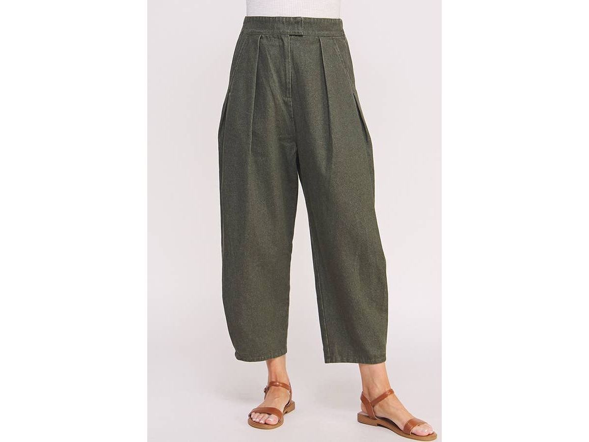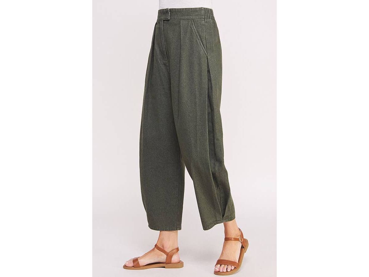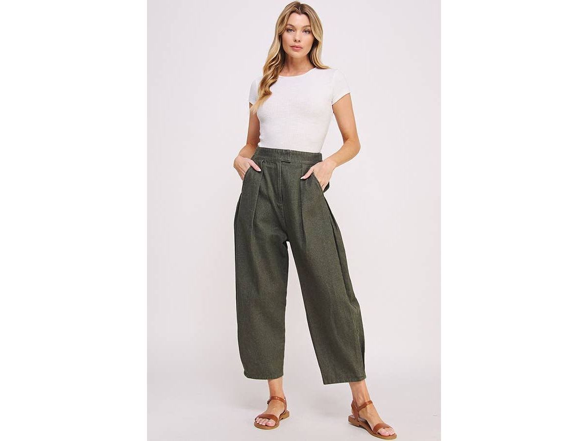 These high-waisted trousers feature playful pleats and a relaxed, baggy fit that hits just above the ankle. They come with convenient side hip pockets, a comfy elastic waistband at the back, and a hook & eye with zipper closure to keep things secure and stylish.