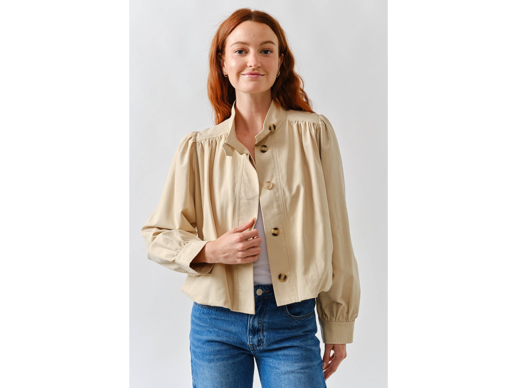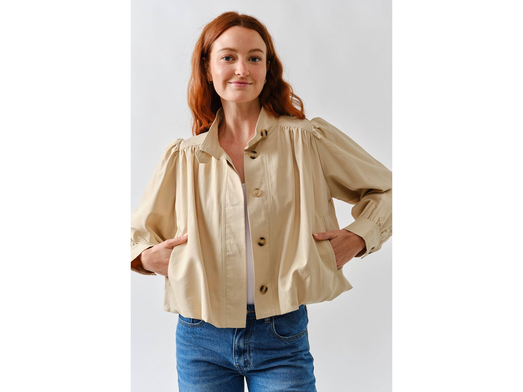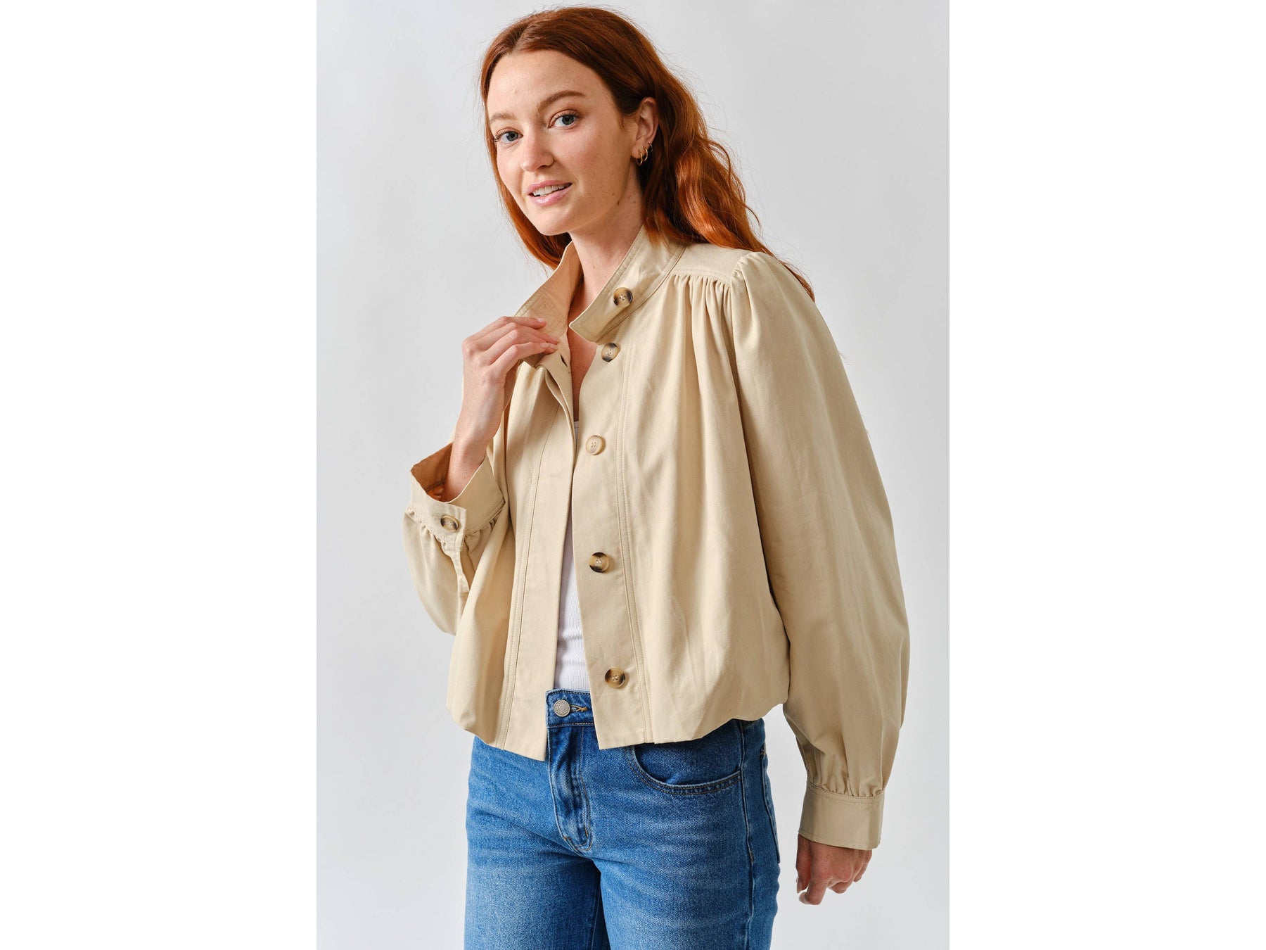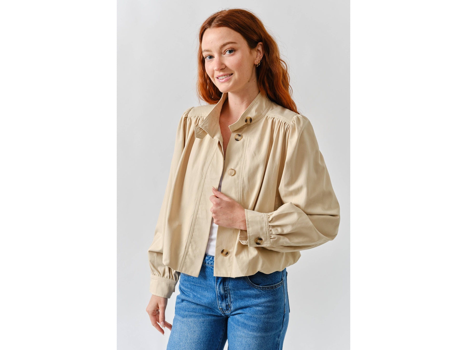 Meet your new jacket obsession. This short trench combines a chic high neckline with statement puff sleeves that demand attention. Pleated details at the shoulders and cuffs create unexpected texture and movement, while the button-front keeps things versatile - dress it up or down depending on your mood.
