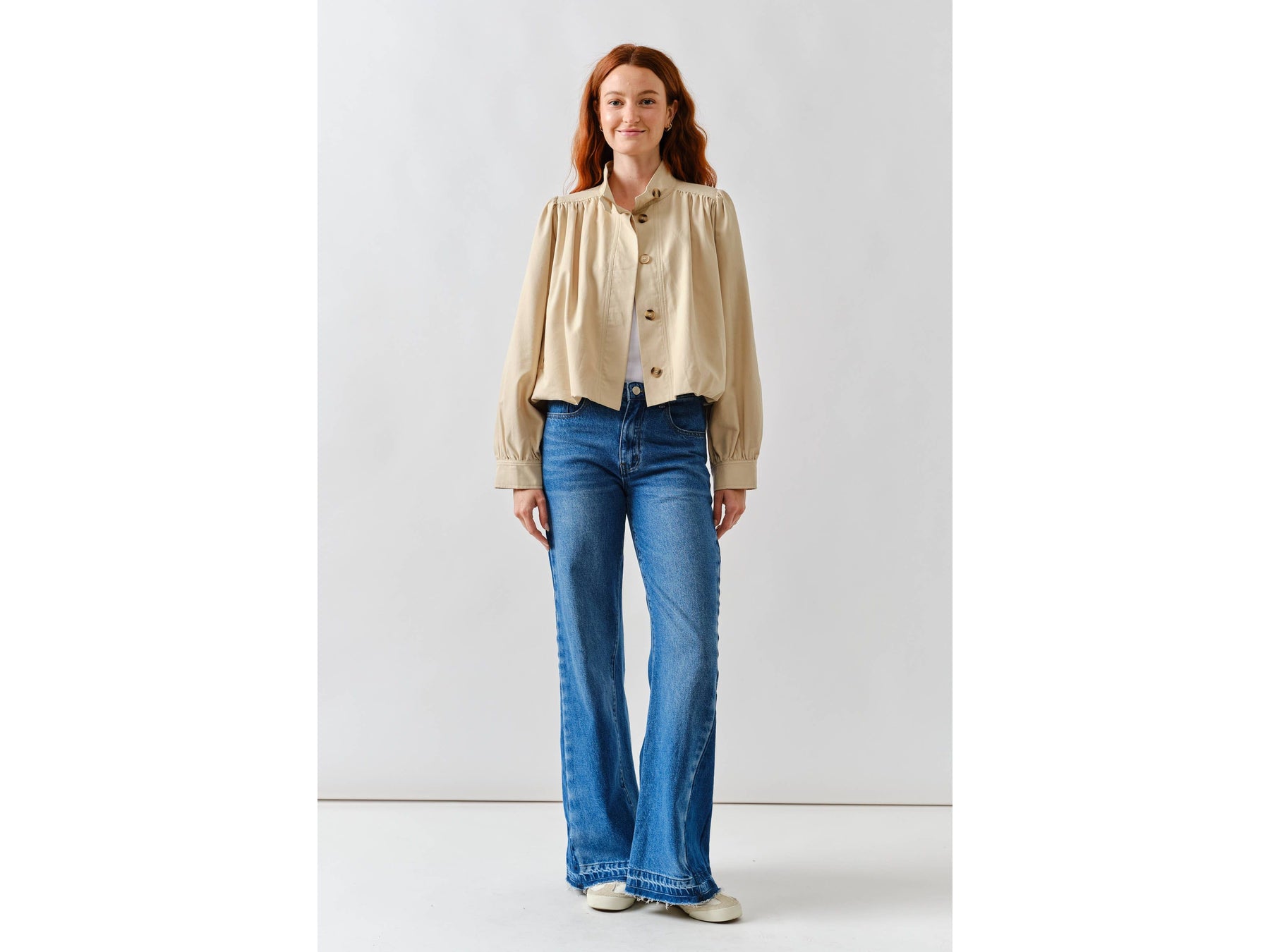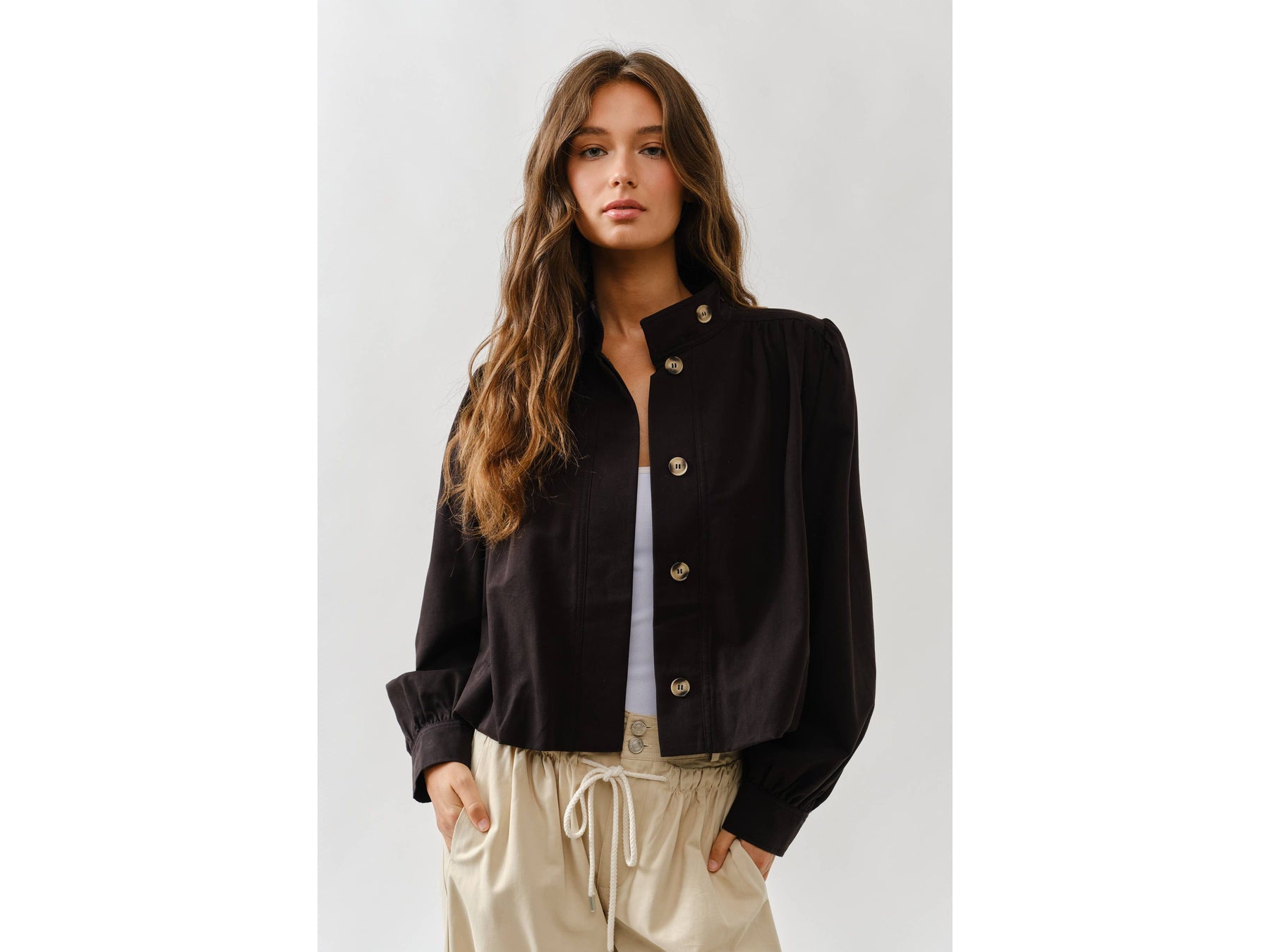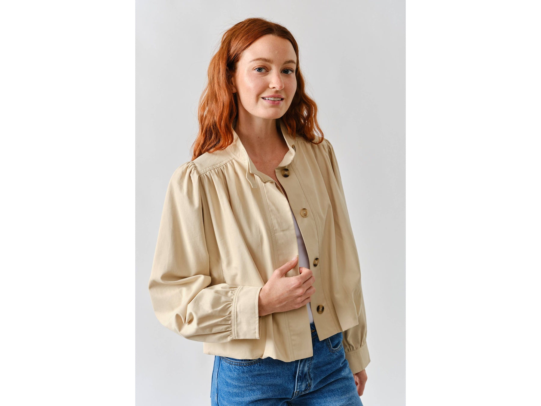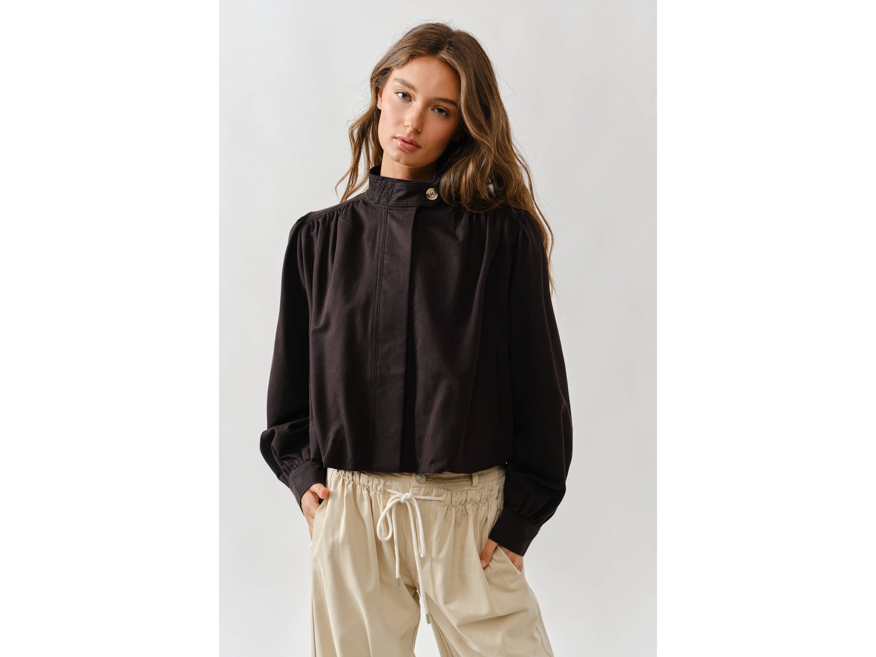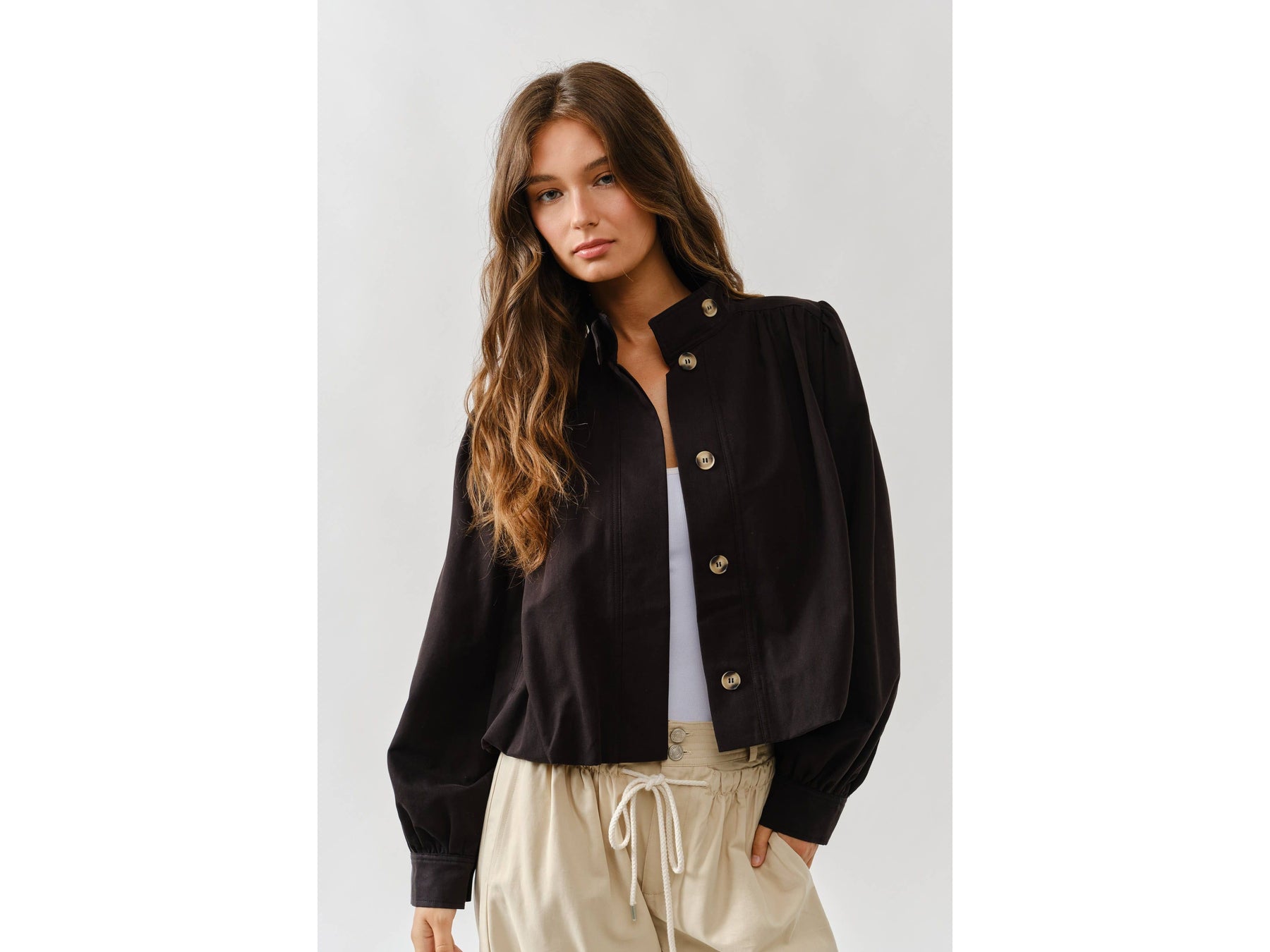 Meet your new jacket obsession. This short trench combines a chic high neckline with statement puff sleeves that demand attention. Pleated details at the shoulders and cuffs create unexpected texture and movement, while the button-front keeps things versatile - dress it up or down depending on your mood.