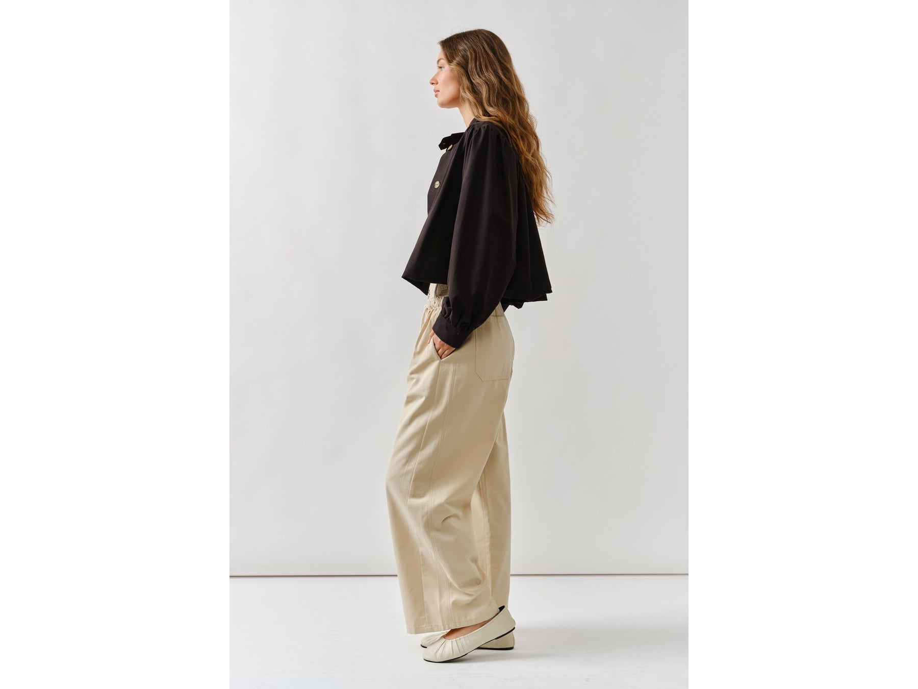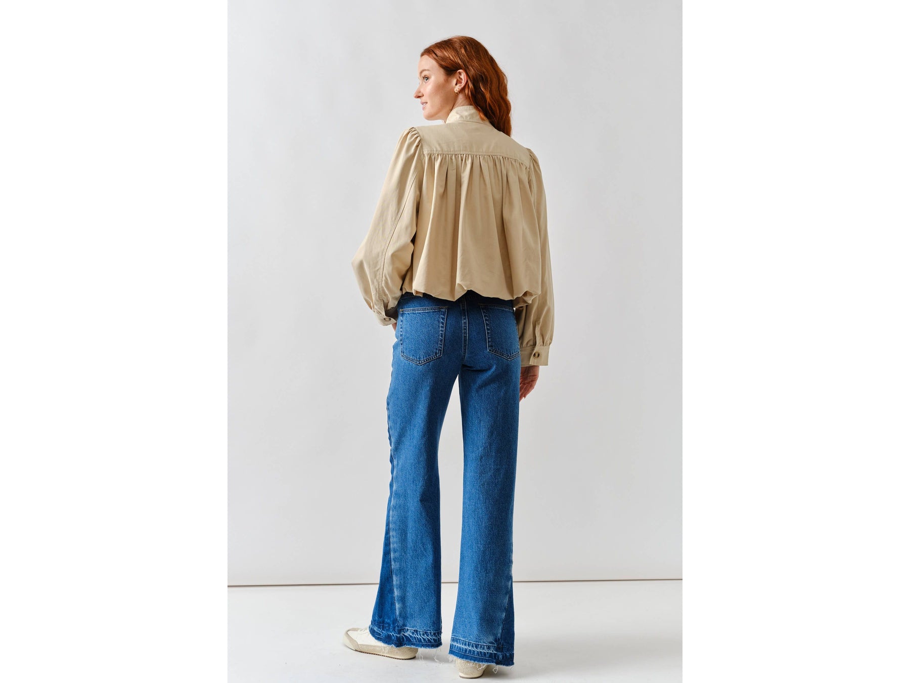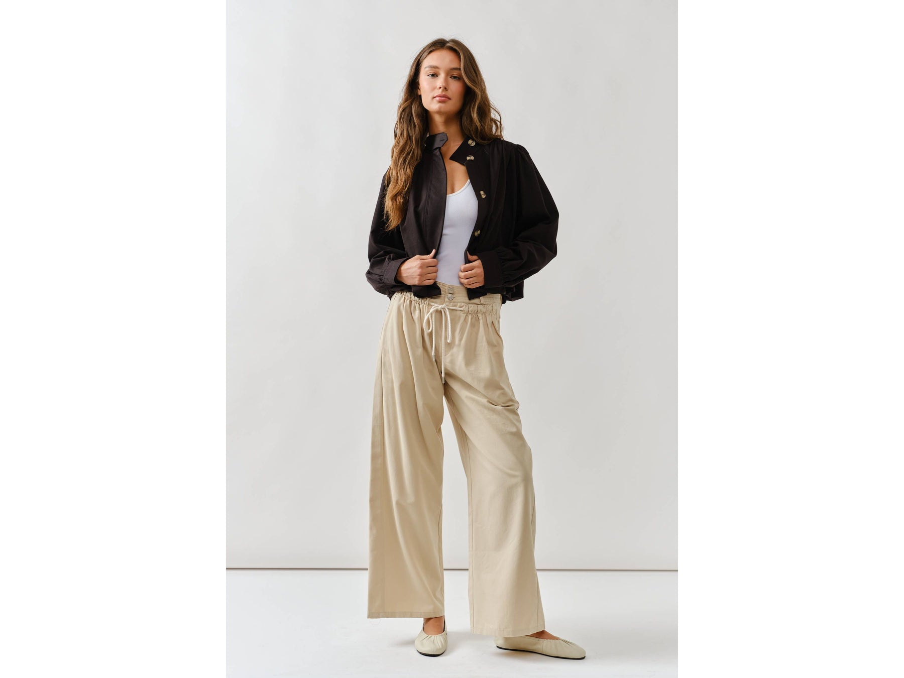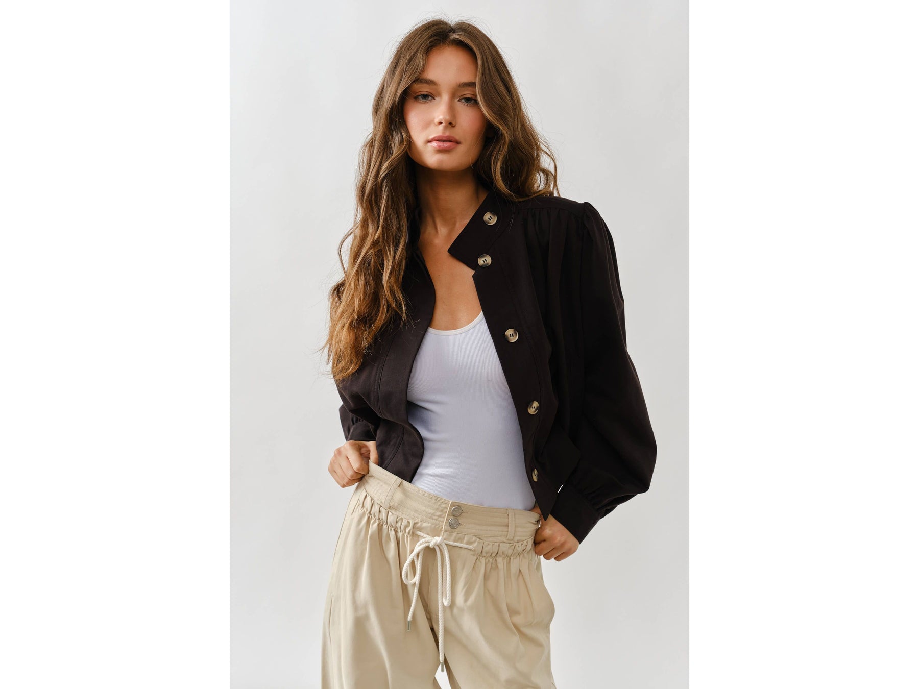 Meet your new jacket obsession. This short trench combines a chic high neckline with statement puff sleeves that demand attention. Pleated details at the shoulders and cuffs create unexpected texture and movement, while the button-front keeps things versatile - dress it up or down depending on your mood.