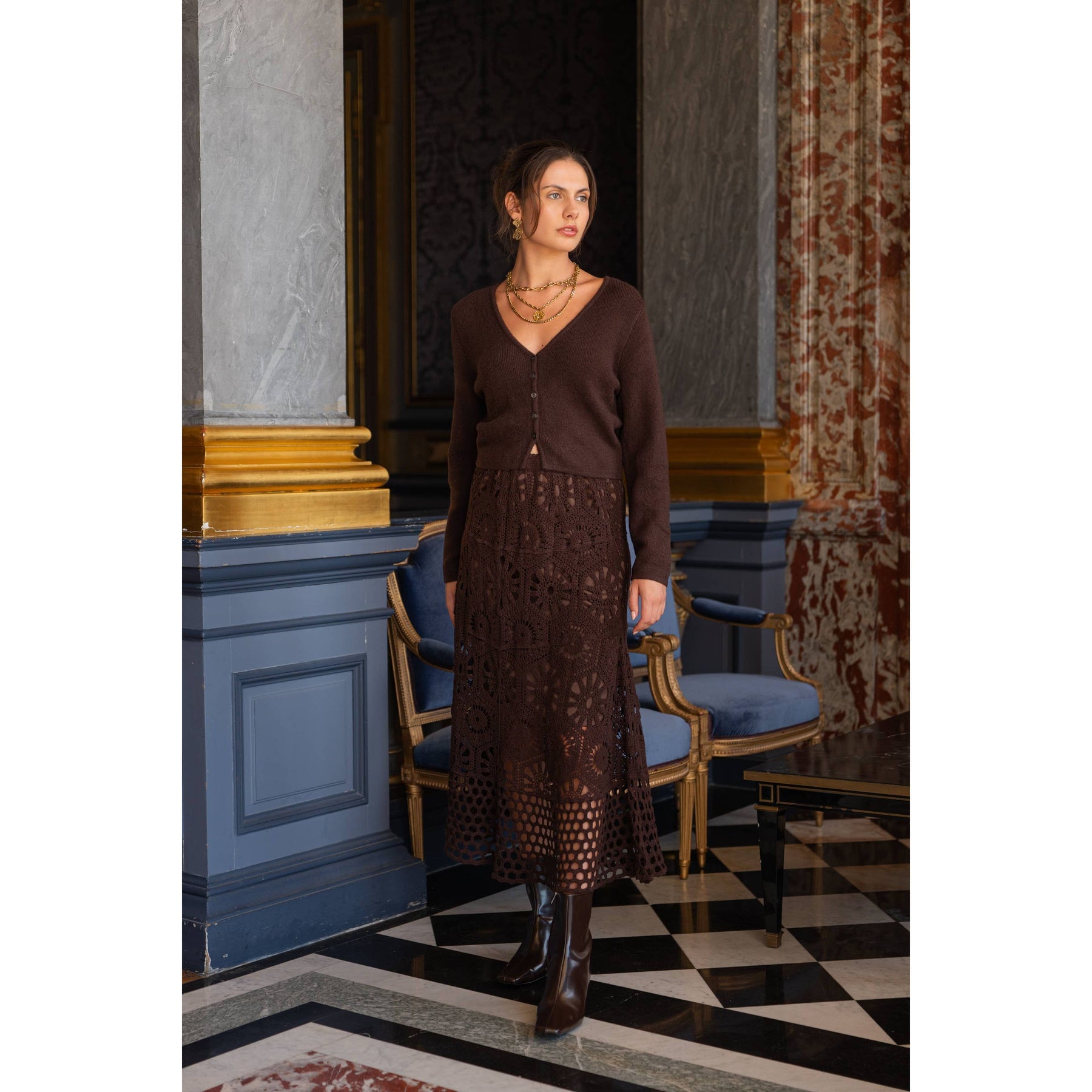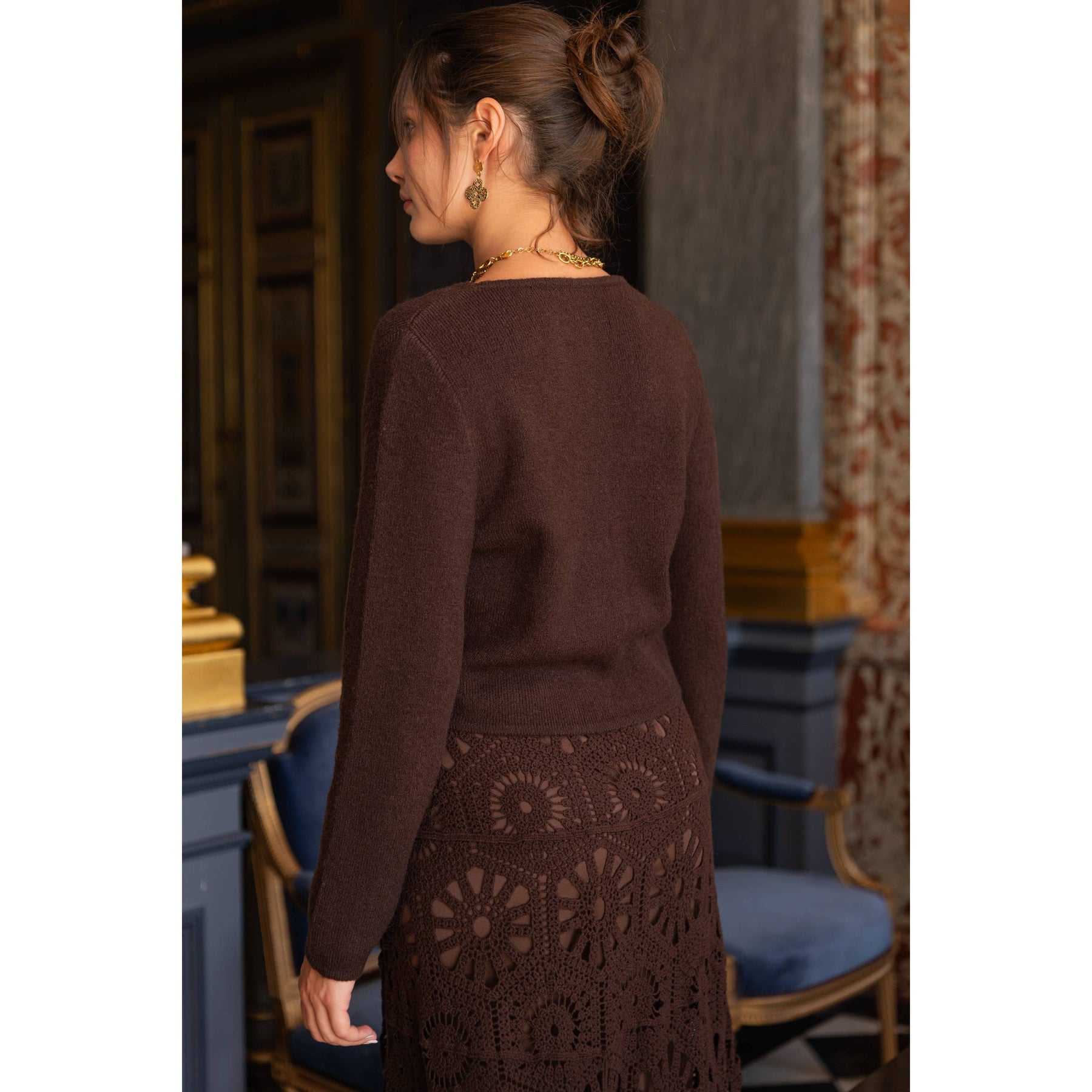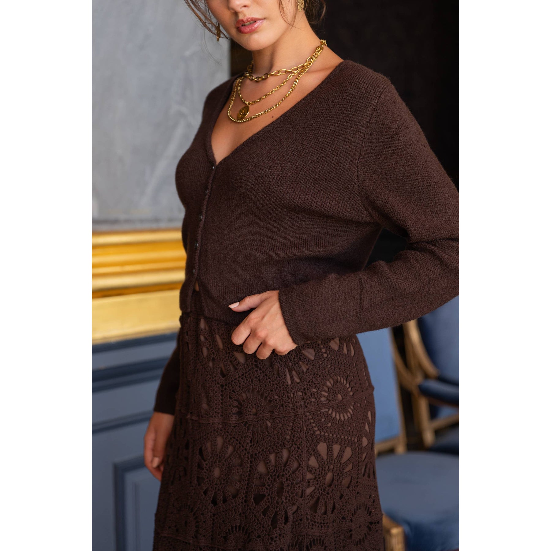 This cropped cardigan features long sleeves and a deep V-neckline, highlighted by a button placket embellished with mother-of-pearl buttons. Made from a soft, plush knit, it has a straight cut gently cinched at the hem for a relaxed yet feminine vibe. This piece brings a fresh twist to minimalist style. One size: fits S/M.