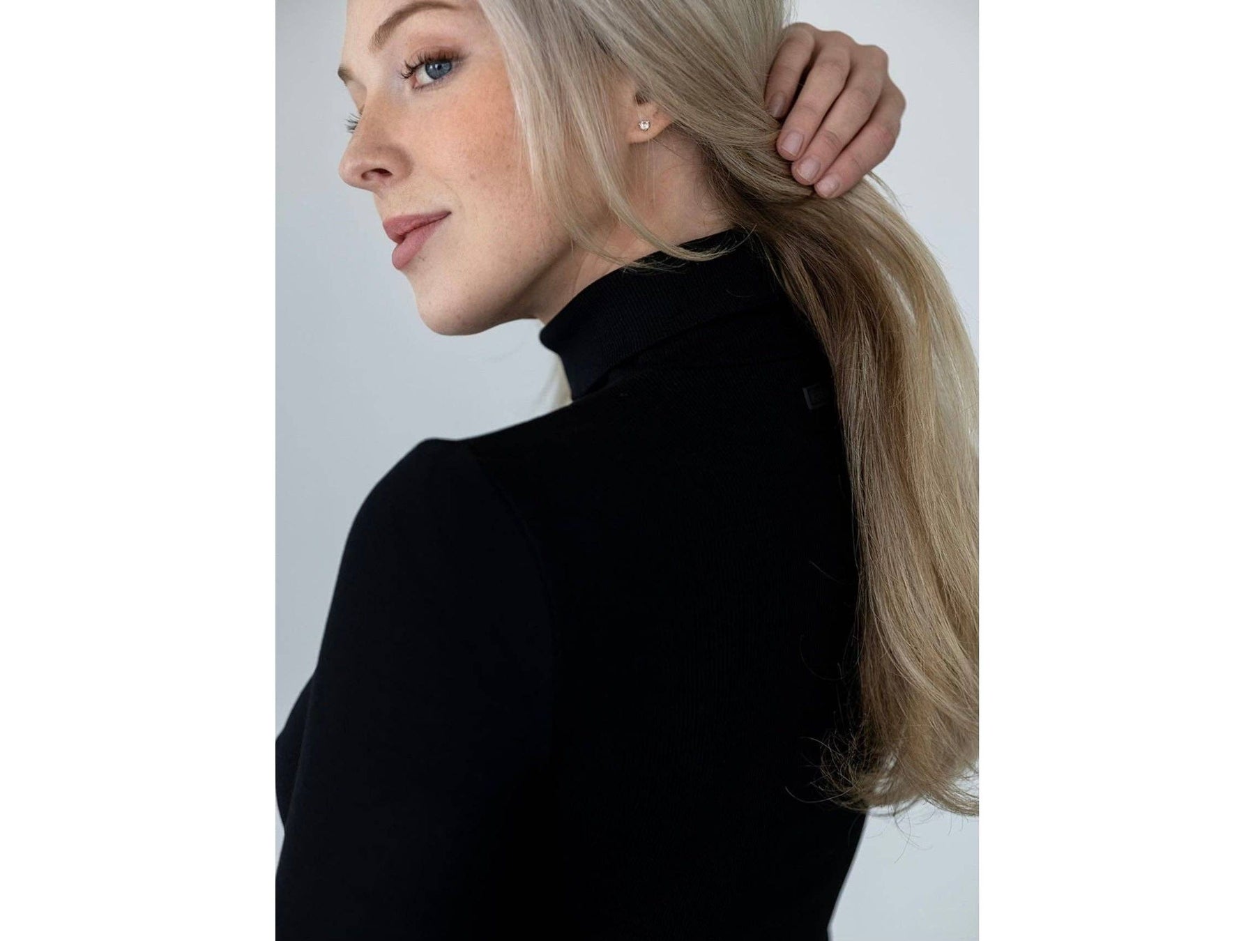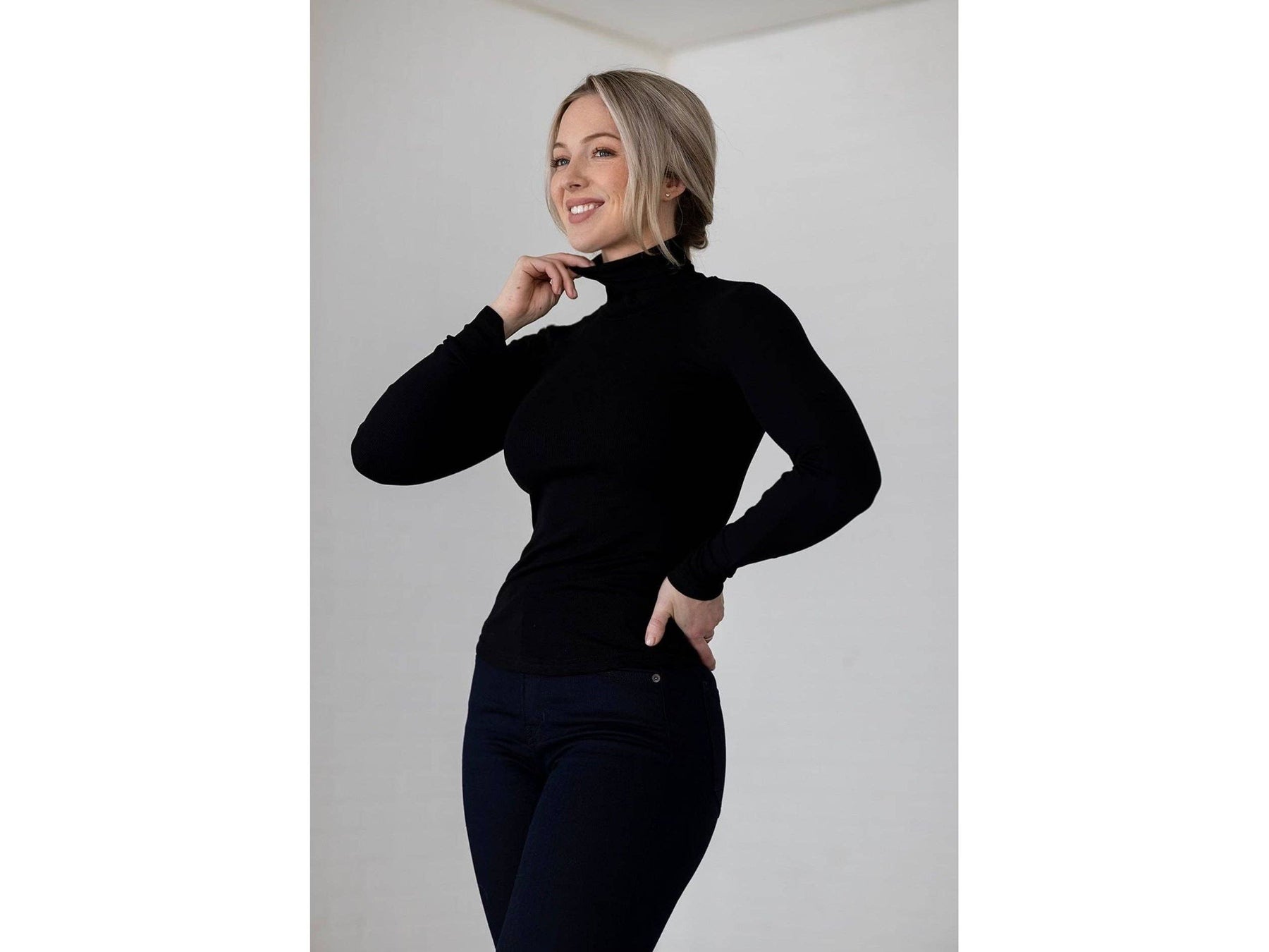 Meet your new closet essential—a ribbed turtleneck that's equal parts cozy and chic. Crafted from a luxuriously soft Rayon/Spandex blend, this piece hugs your curves in all the right ways with just enough stretch to move with you. The slim fit keeps things streamlined and polished, while the timeless black hue pairs with literally everything. Delicate, easy-care fabric means you'll be reaching for this one again and again.