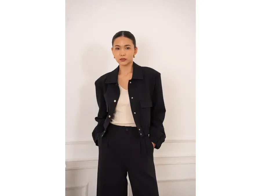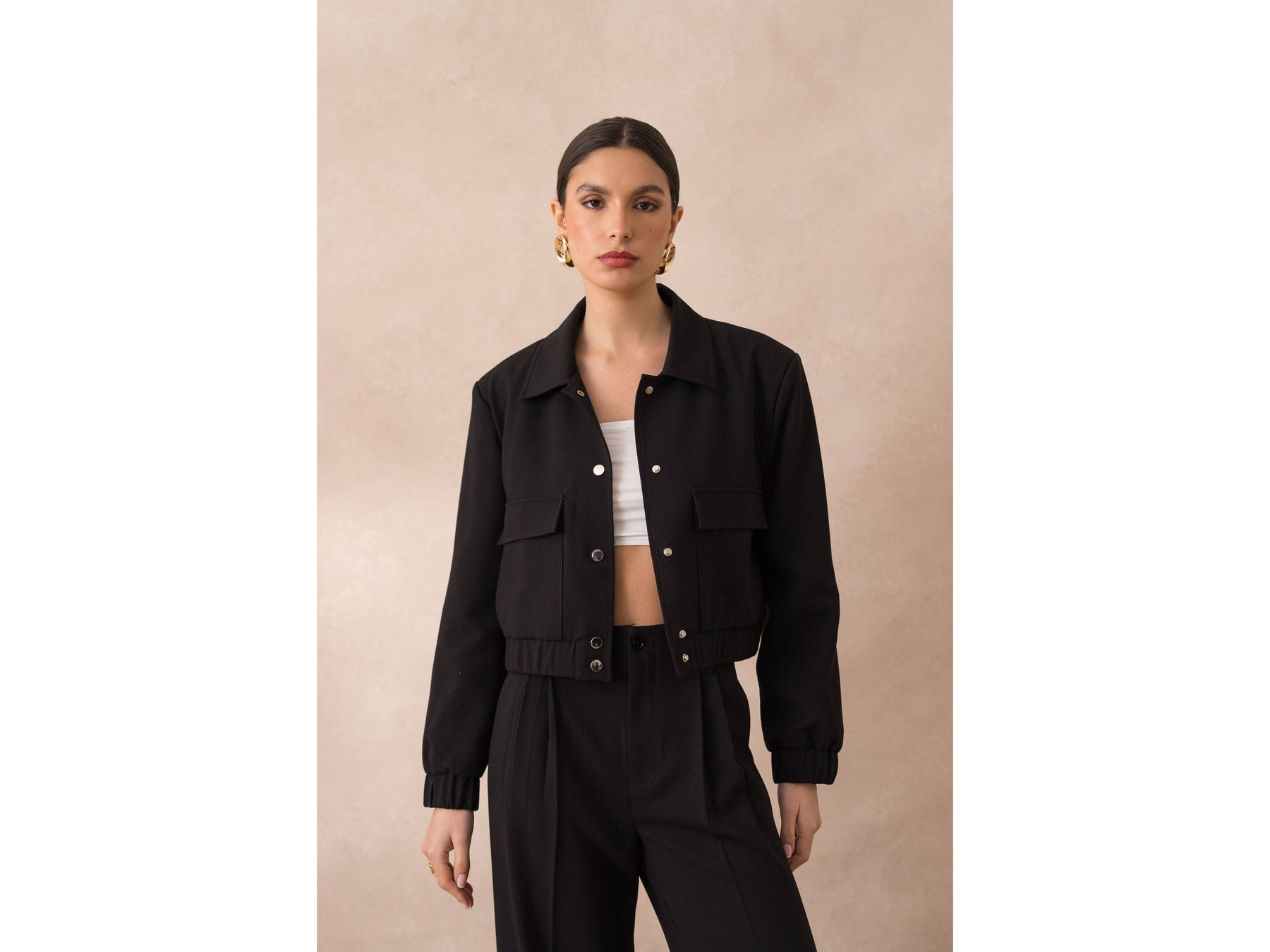 Meet our trendy and versatile short bomber, ideal for a casual chic look. Features a modern and structured fit with front metal snap buttons. Elasticated waist and cuffs for fitted adjustments.