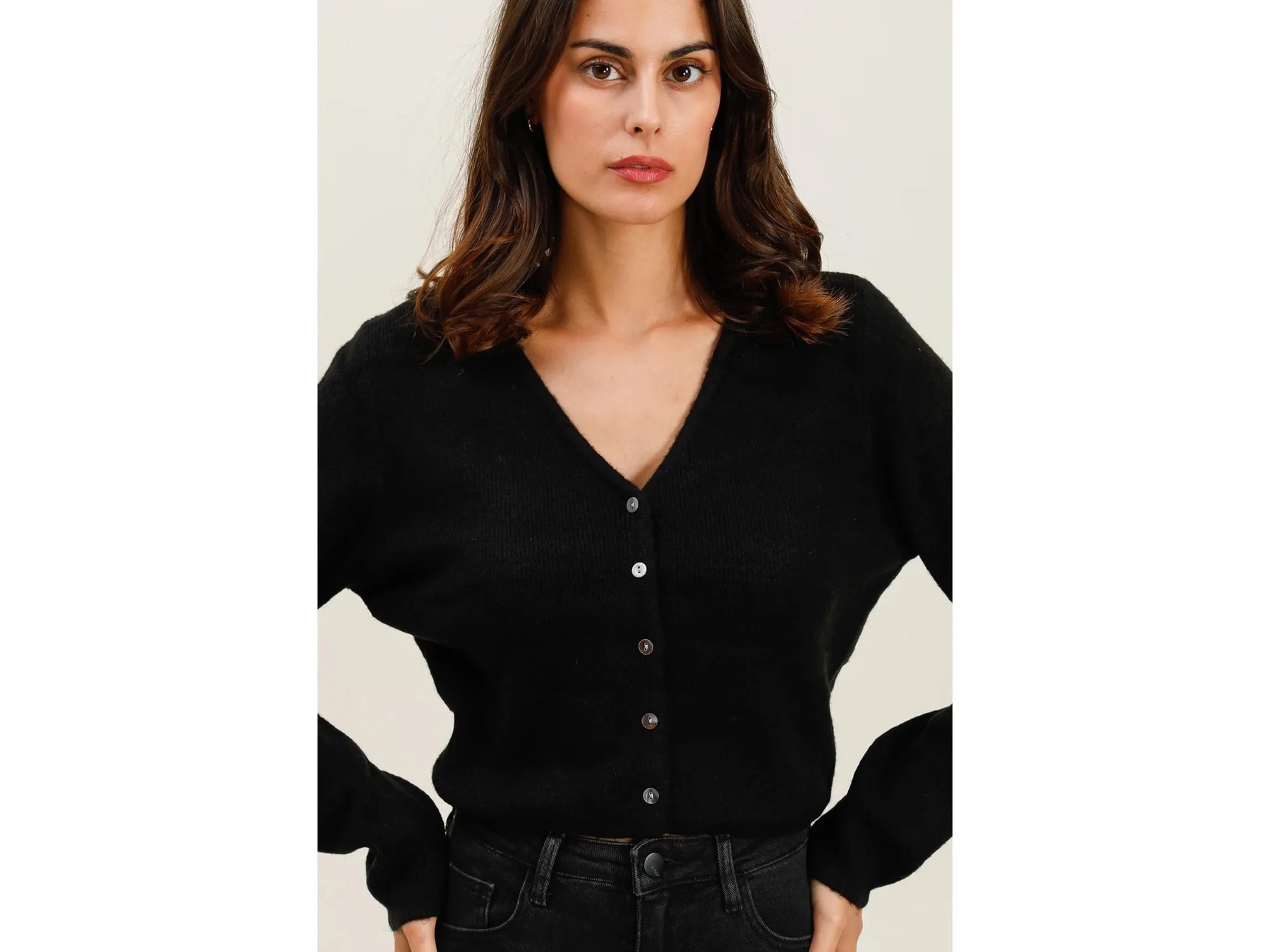 This cropped cardigan features long sleeves and a deep V-neckline, highlighted by a button placket embellished with mother-of-pearl buttons. Made from a soft, plush knit, it has a straight cut gently cinched at the hem for a relaxed yet feminine vibe. This piece brings a fresh twist to minimalist style. One size: fits S/M.