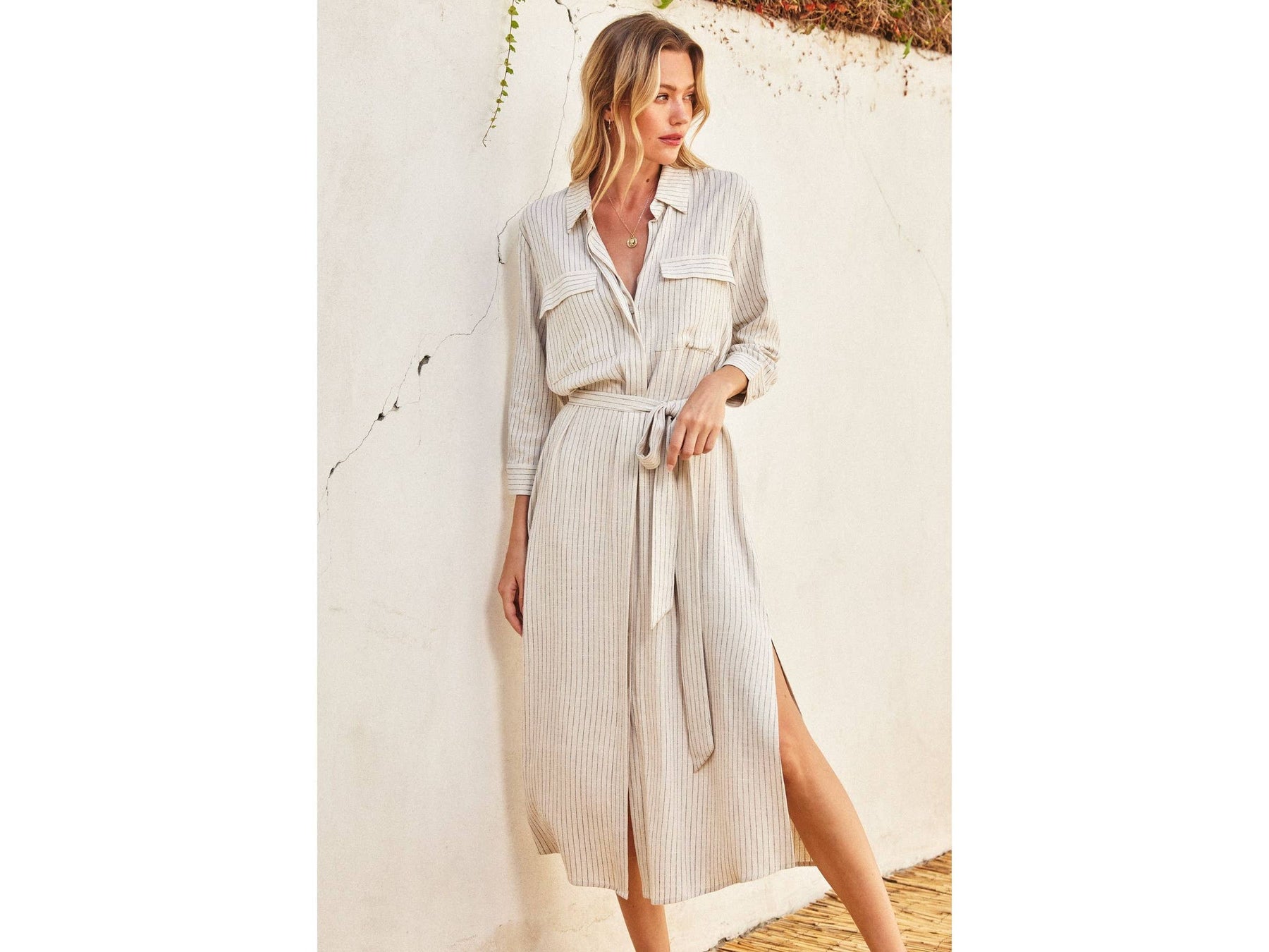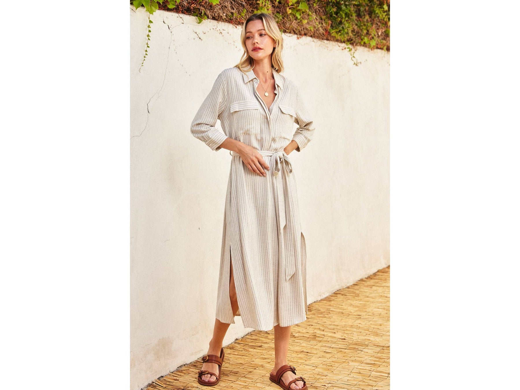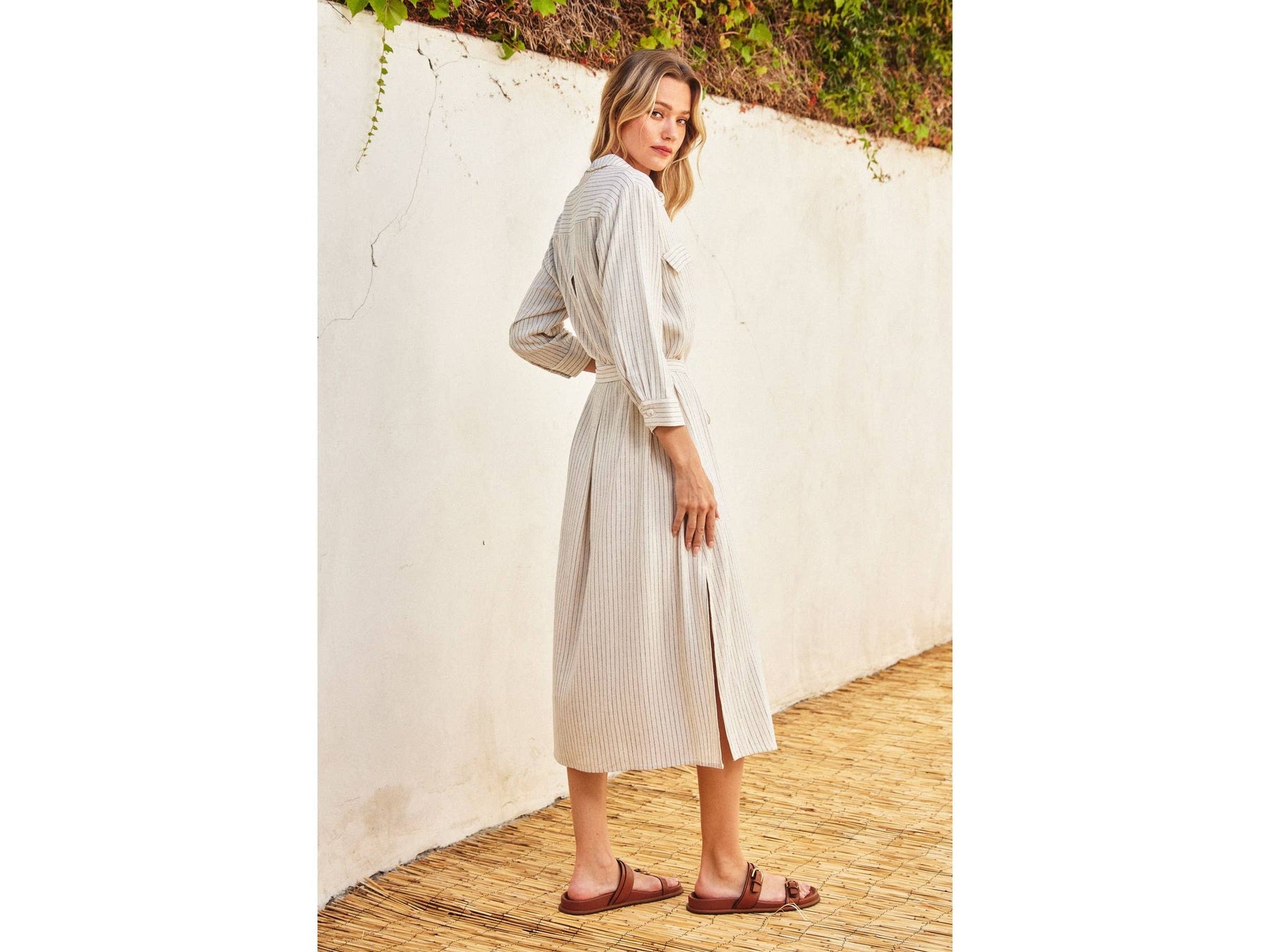 Effortlessly chic meets undeniably practical in this pinstriped shirt dress that refuses to choose between polished and playful. The crisp collar and hidden button front create a refined silhouette, while the removable sash belt lets you cinch, tie, or skip it entirely - because versatility is everything. Functional front flap pockets keep your essentials close without sacrificing style. Layer it, belt it, or wear it solo: this maxi is your new go-to for looking put-together without trying too hard.