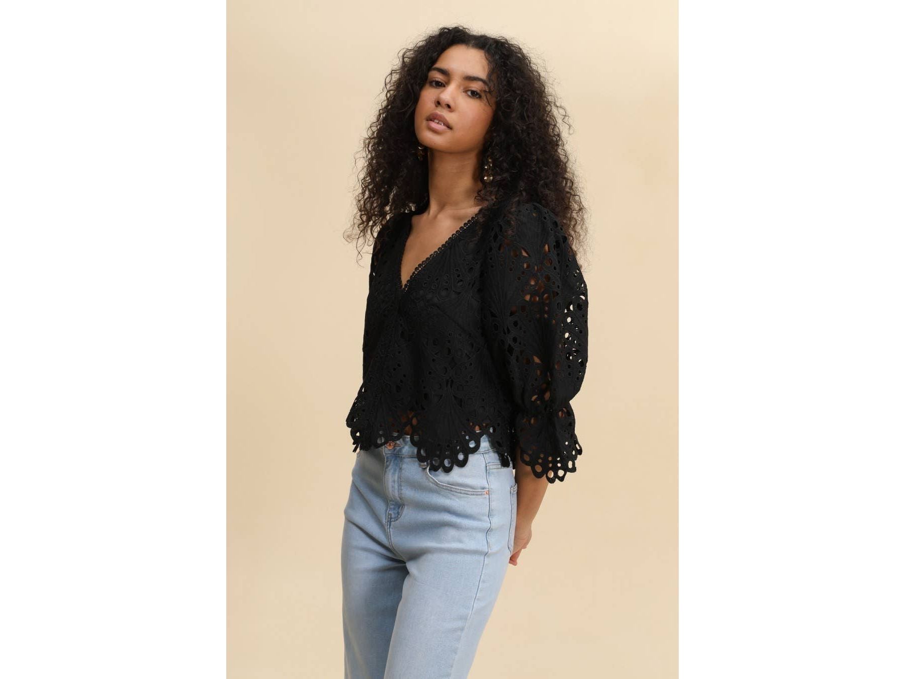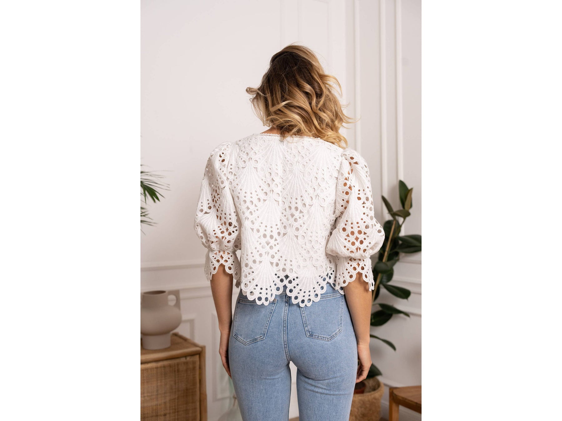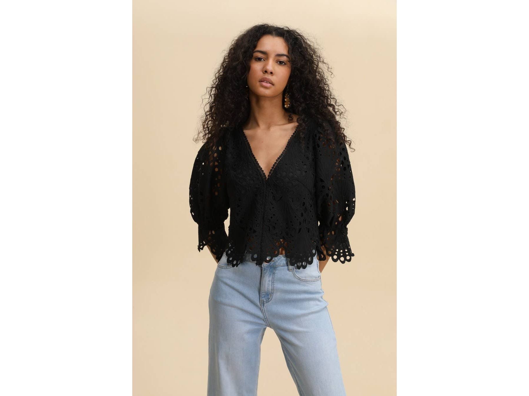 Elevate your wardrobe with the Selena guipure lace blouse, a sophisticated piece that balances elegance with everyday wearability. Crafted from delicate guipure lace, this blouse features three-quarter puffed and elasticated sleeves that create a flattering silhouette while allowing comfortable movement. Cut to a cropped length, it pairs effortlessly with high-waisted bottoms for a modern, intentional look.