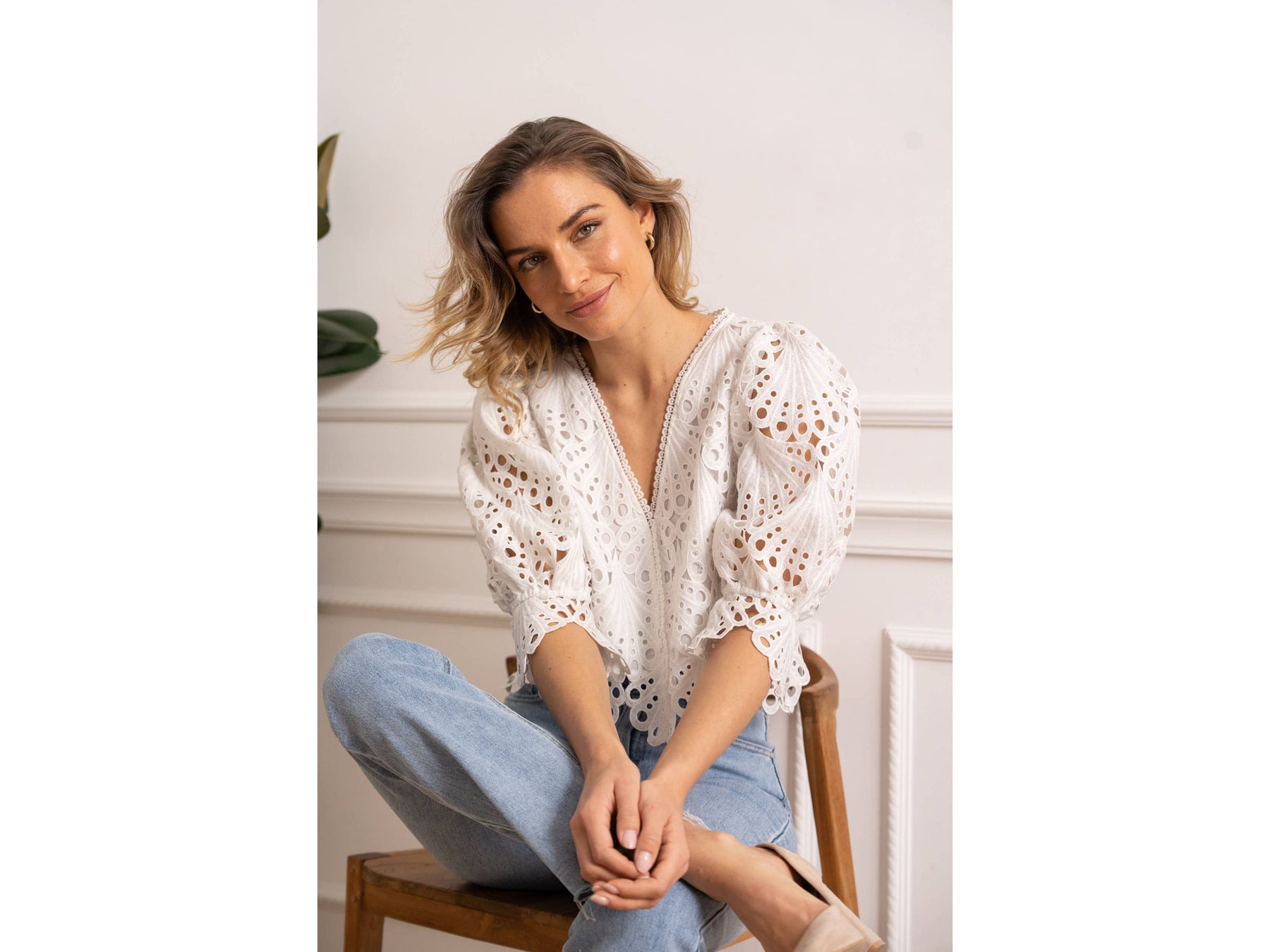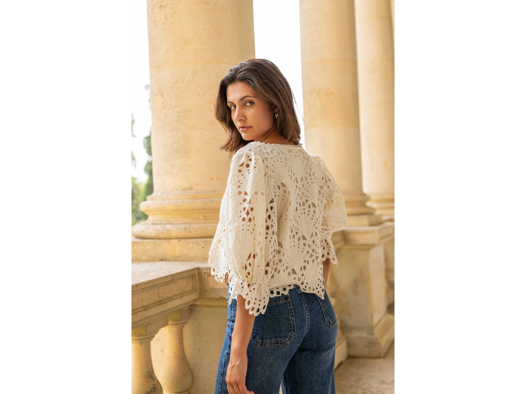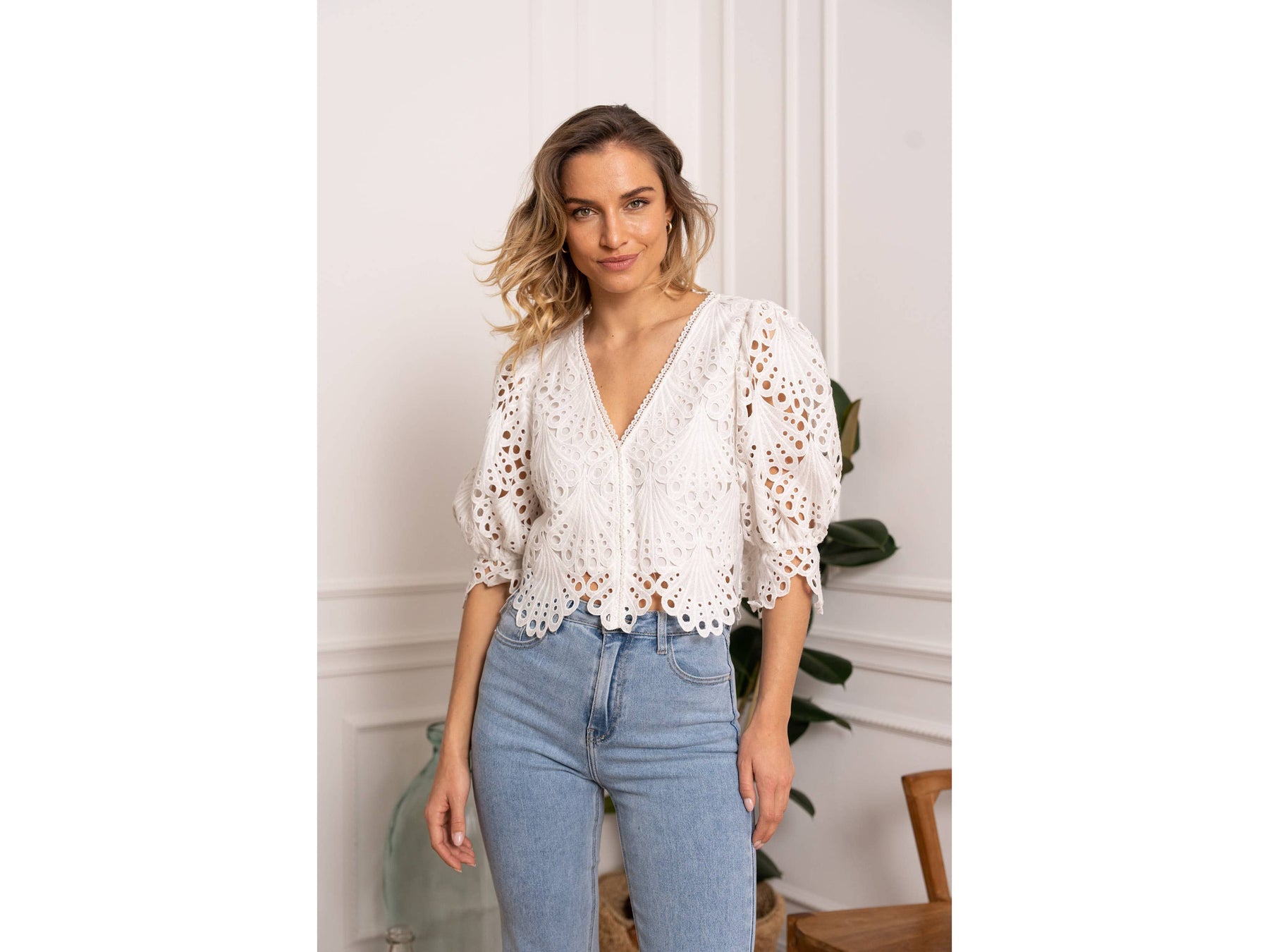 Elevate your wardrobe with the Selena guipure lace blouse, a sophisticated piece that balances elegance with everyday wearability. Crafted from delicate guipure lace, this blouse features three-quarter puffed and elasticated sleeves that create a flattering silhouette while allowing comfortable movement. Cut to a cropped length, it pairs effortlessly with high-waisted bottoms for a modern, intentional look.