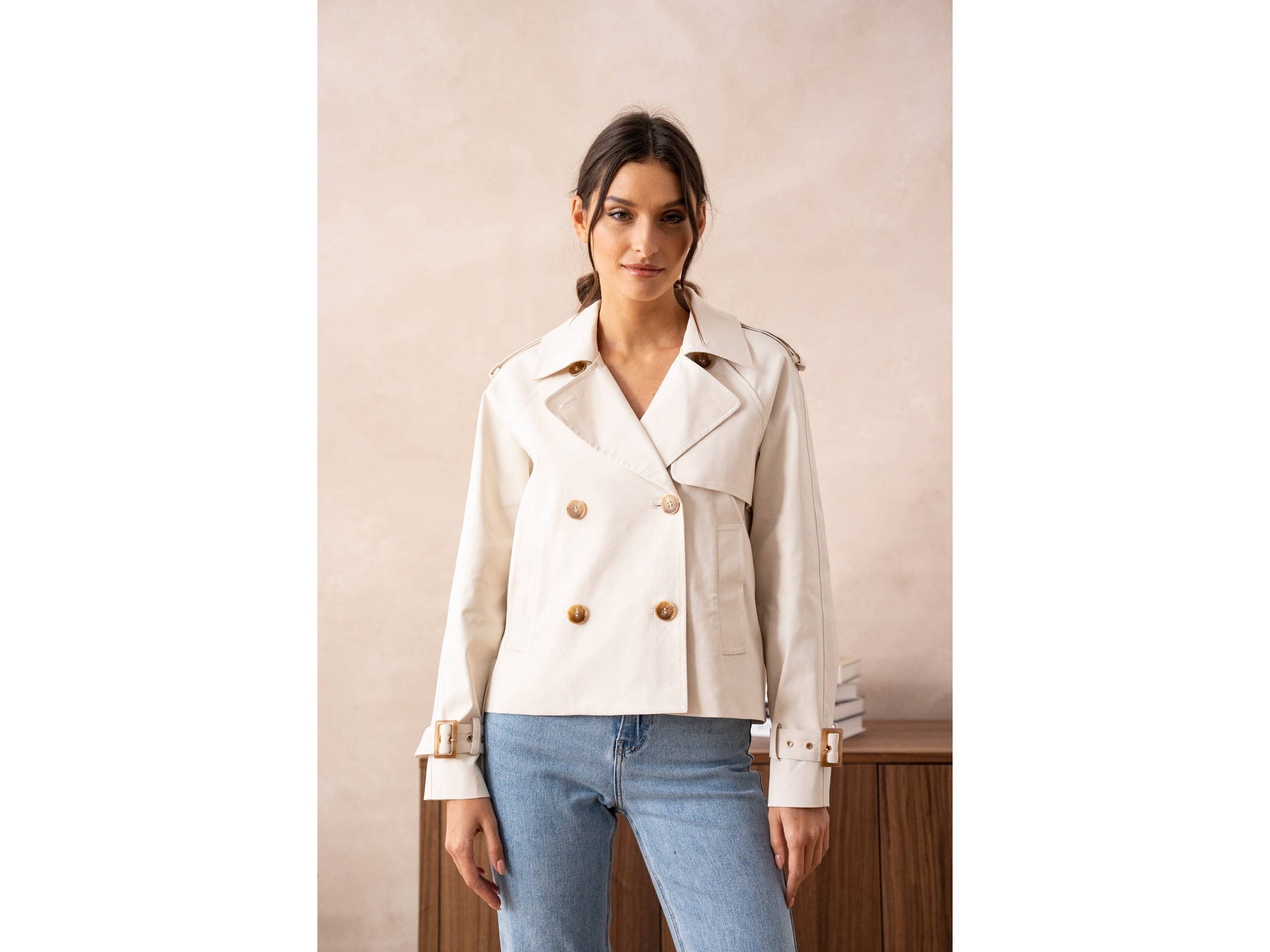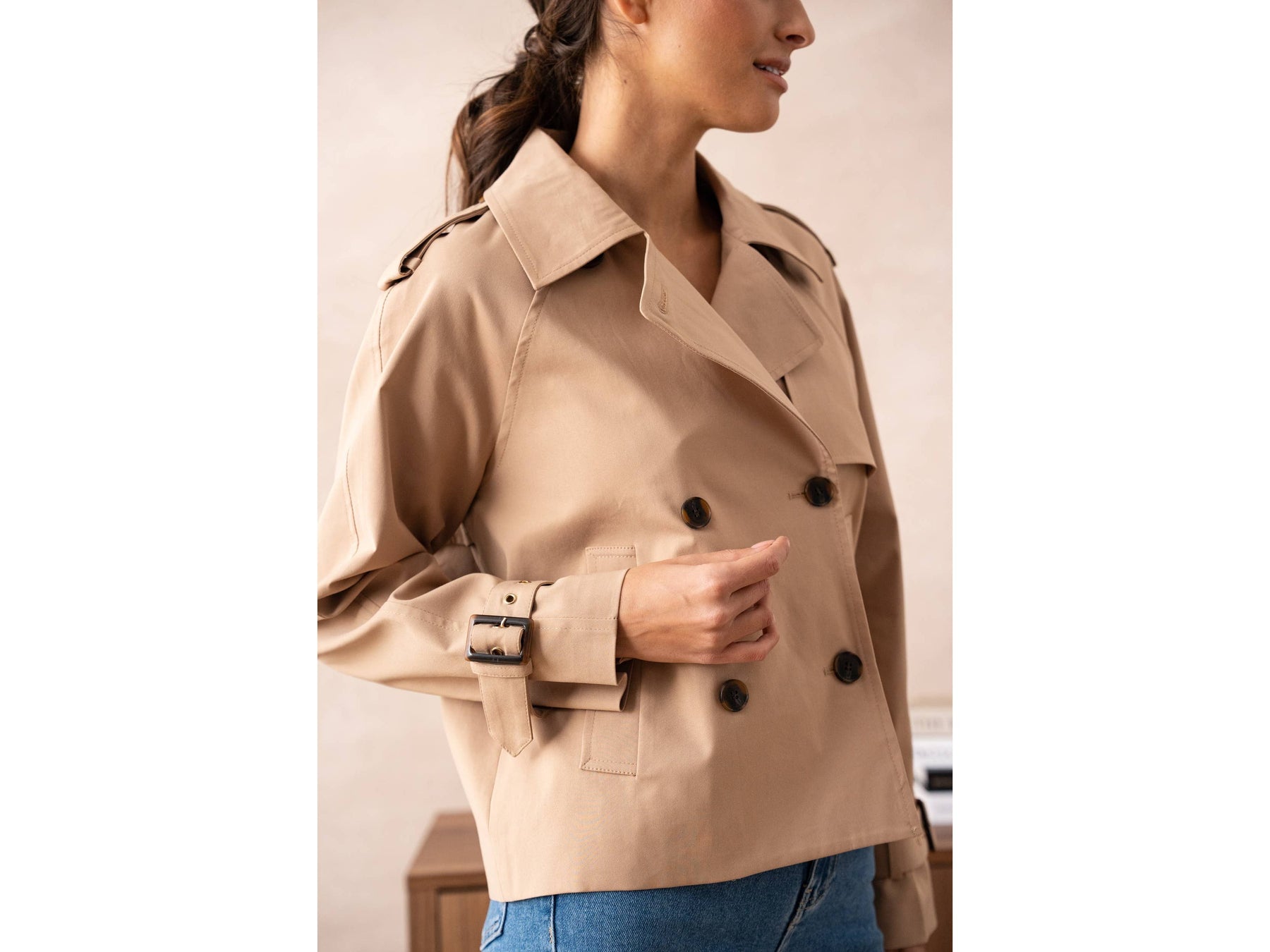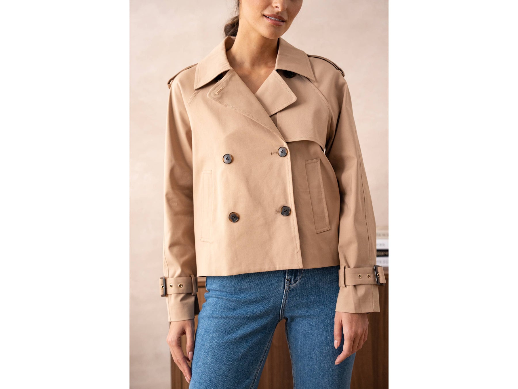 A cropped take on the classic trench - tailored in a breathable cotton blend that moves with you. Perfect for layering over everything from dresses to denim, this shortened silhouette brings modern edge to timeless style.