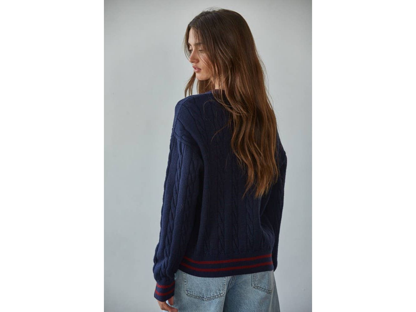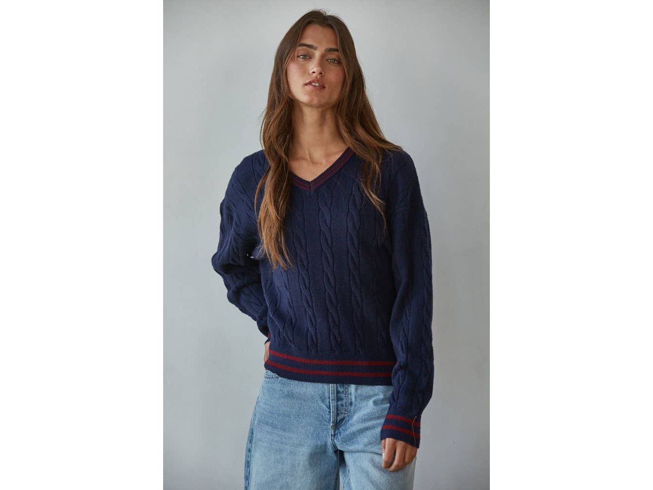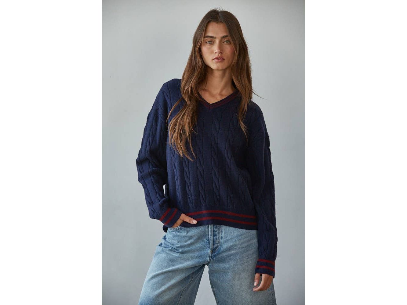 Elevate your everyday rotation with this charming cable knit pullover. The classic V-neck and long sleeves deliver timeless appeal, while playful contrast stripes add just the right amount of personality. Cozy, versatile, and effortlessly chic - your new go-to layer for everything from coffee dates to casual Fridays.