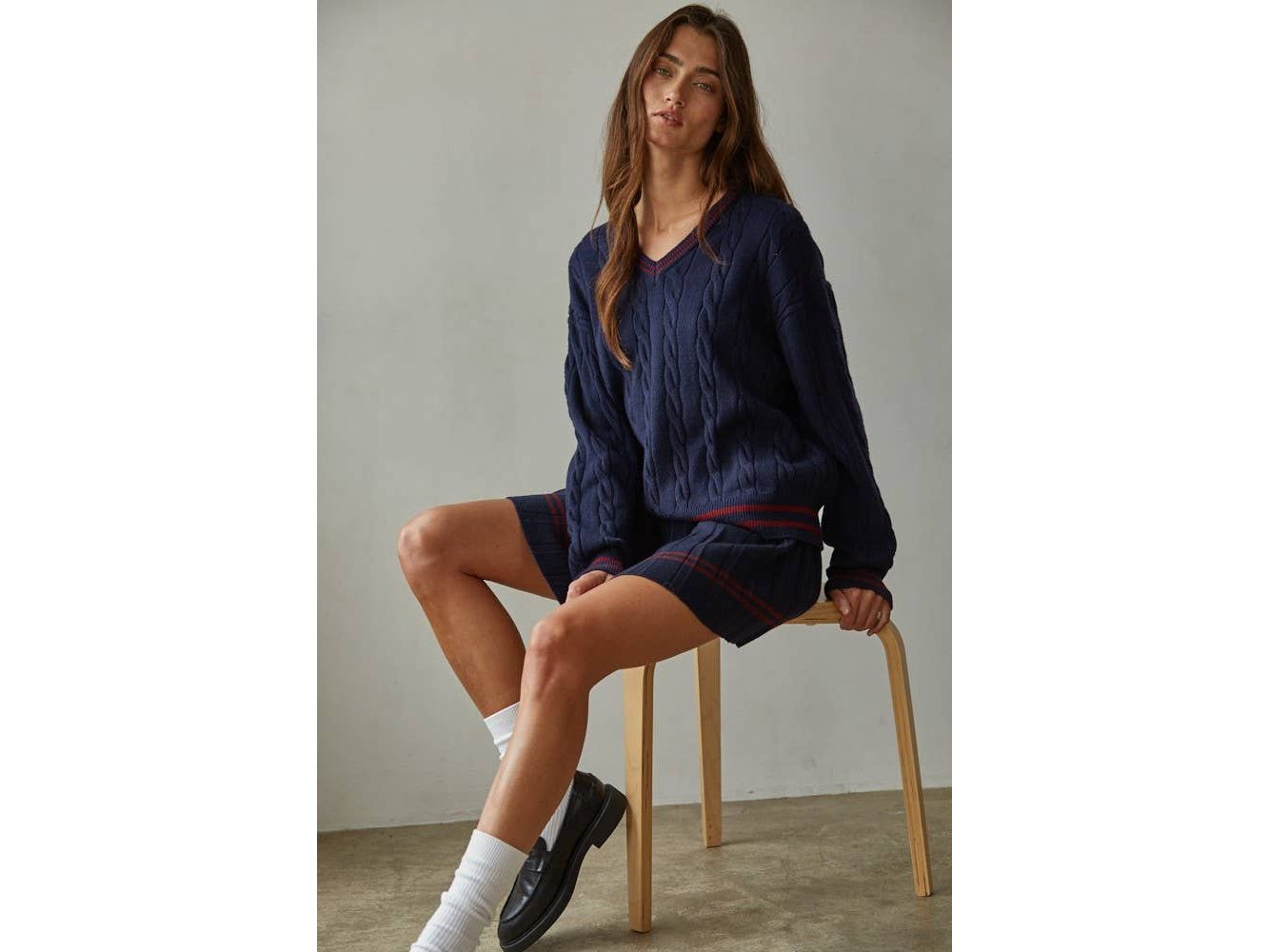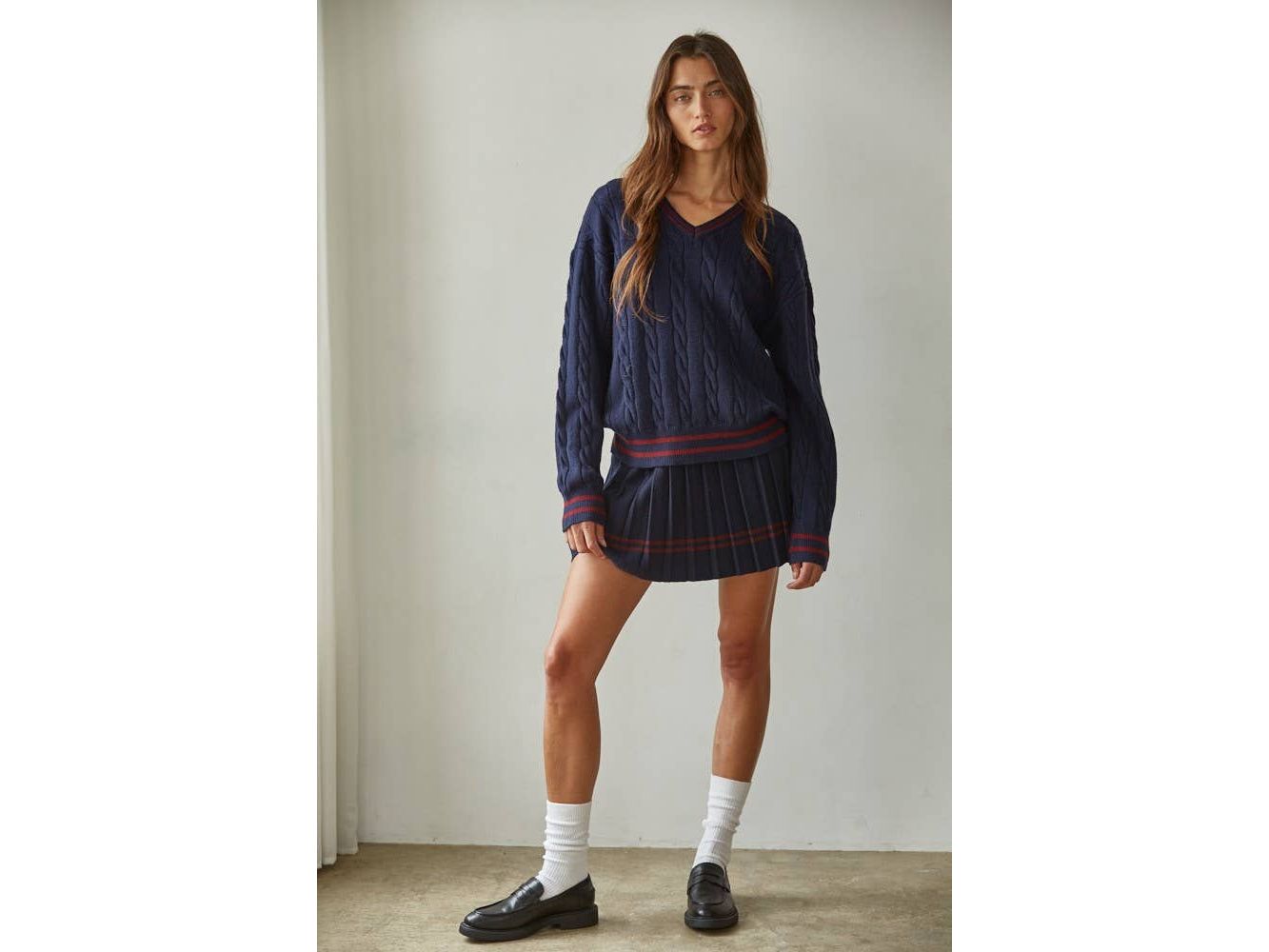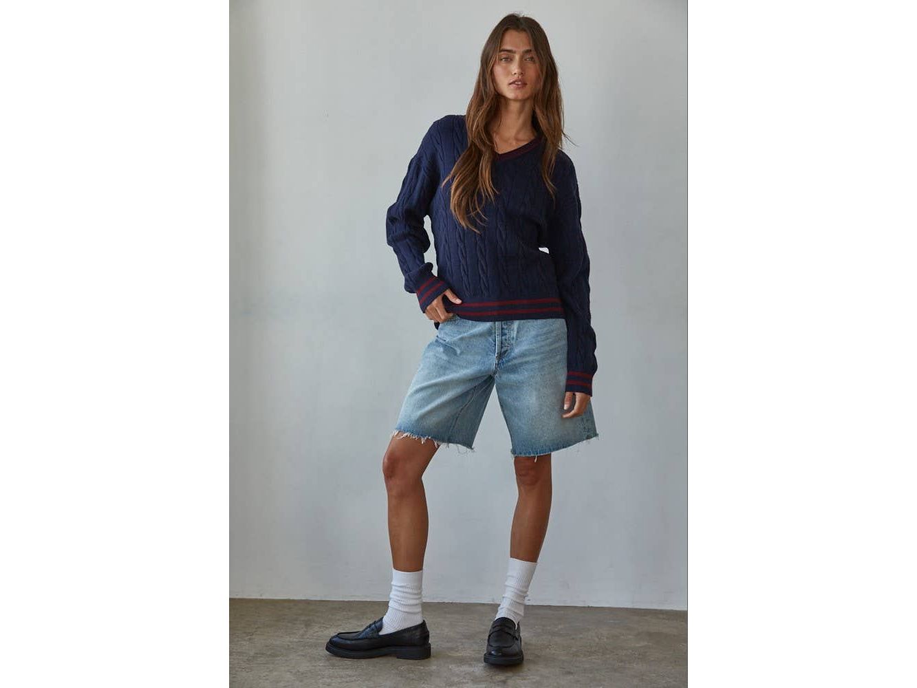 Elevate your everyday rotation with this charming cable knit pullover. The classic V-neck and long sleeves deliver timeless appeal, while playful contrast stripes add just the right amount of personality. Cozy, versatile, and effortlessly chic - your new go-to layer for everything from coffee dates to casual Fridays.