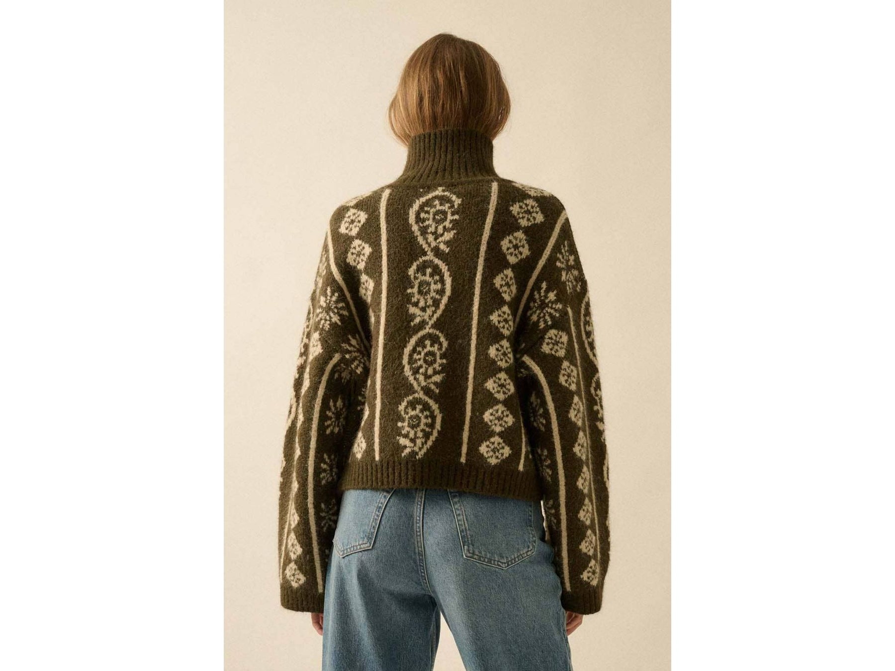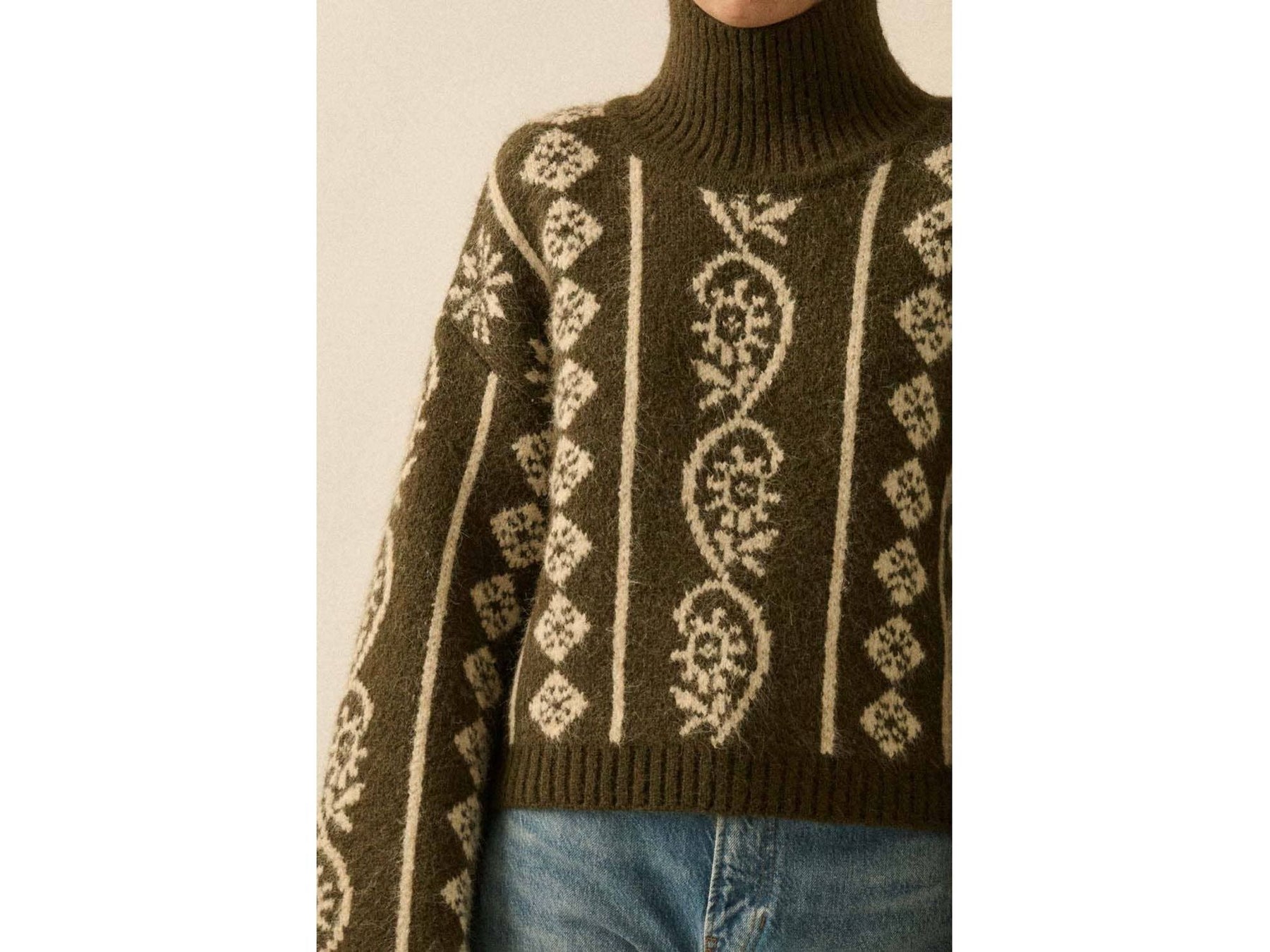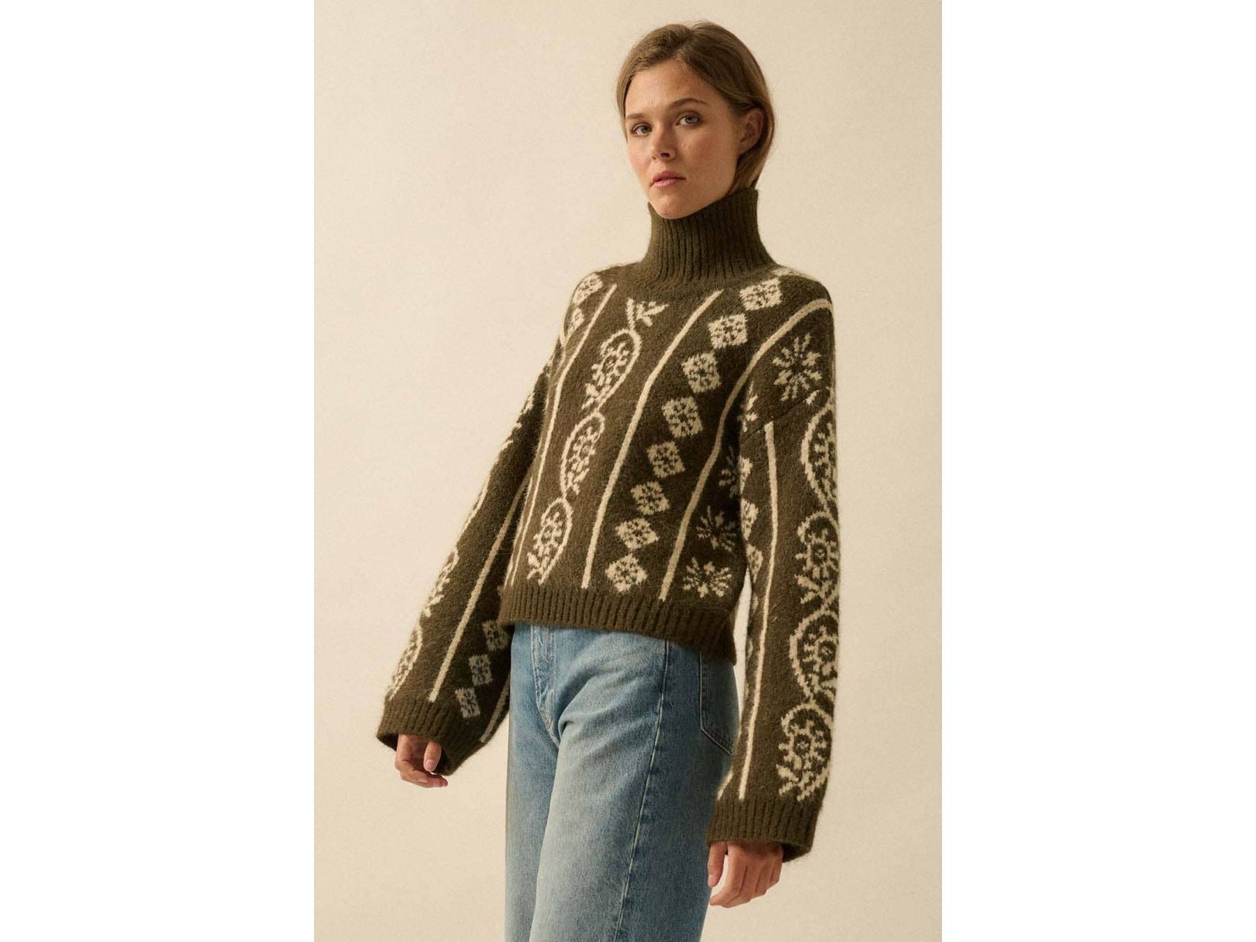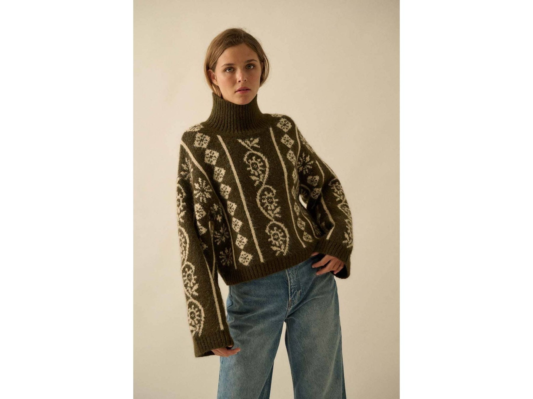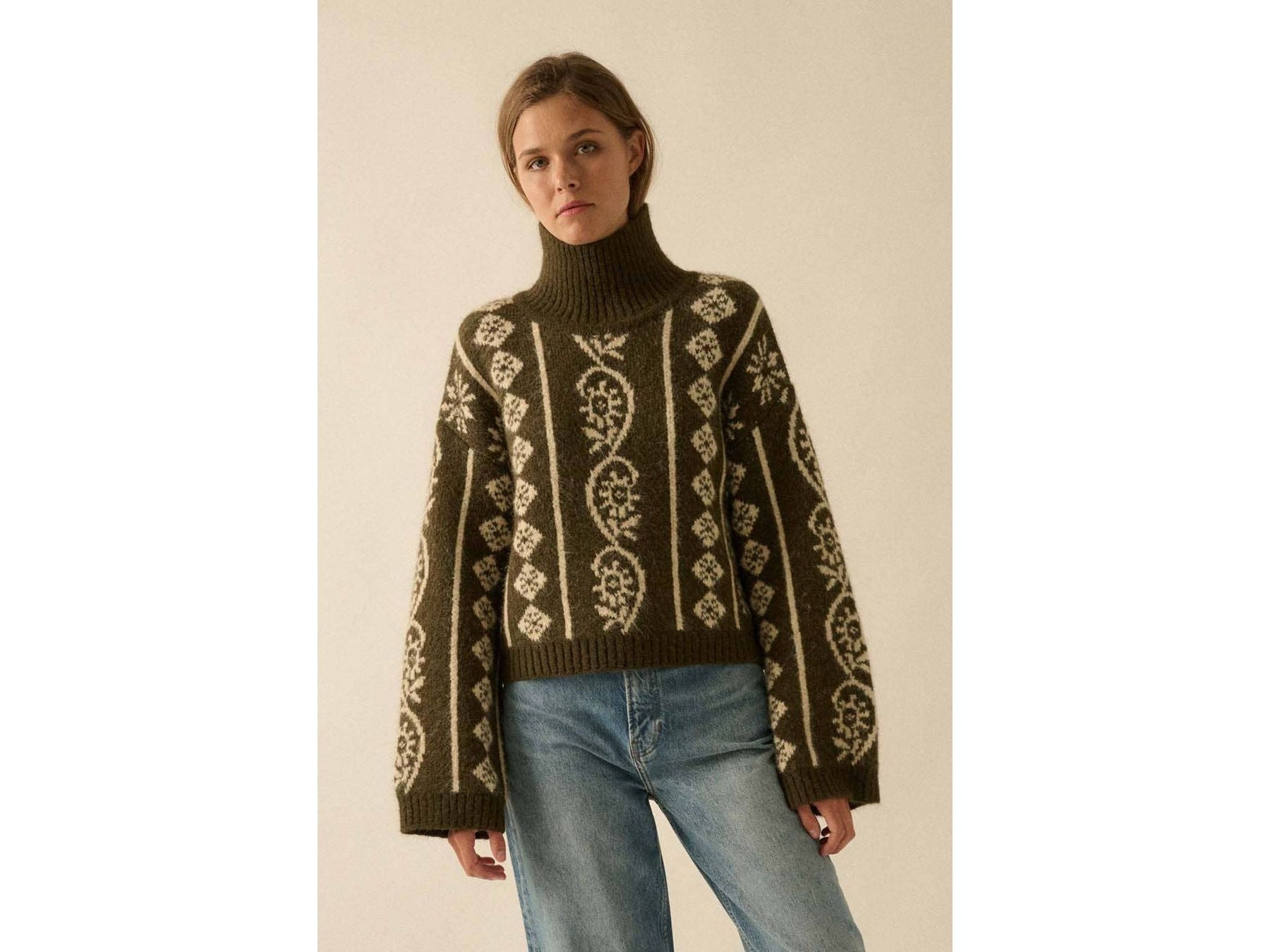This snuggly jacquard-knit sweater is sprinkled with abstract floral and snowflake designs. It sports a tall mock neck, roomy wide sleeves with a drop shoulder, and ribbed trims on the collar, cuffs, and hem. All wrapped up in a relaxed, easygoing fit perfect for cozy vibes.