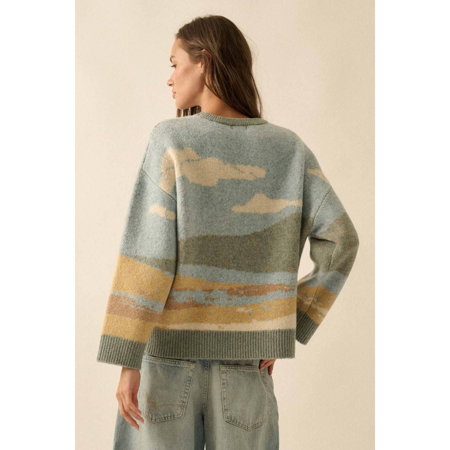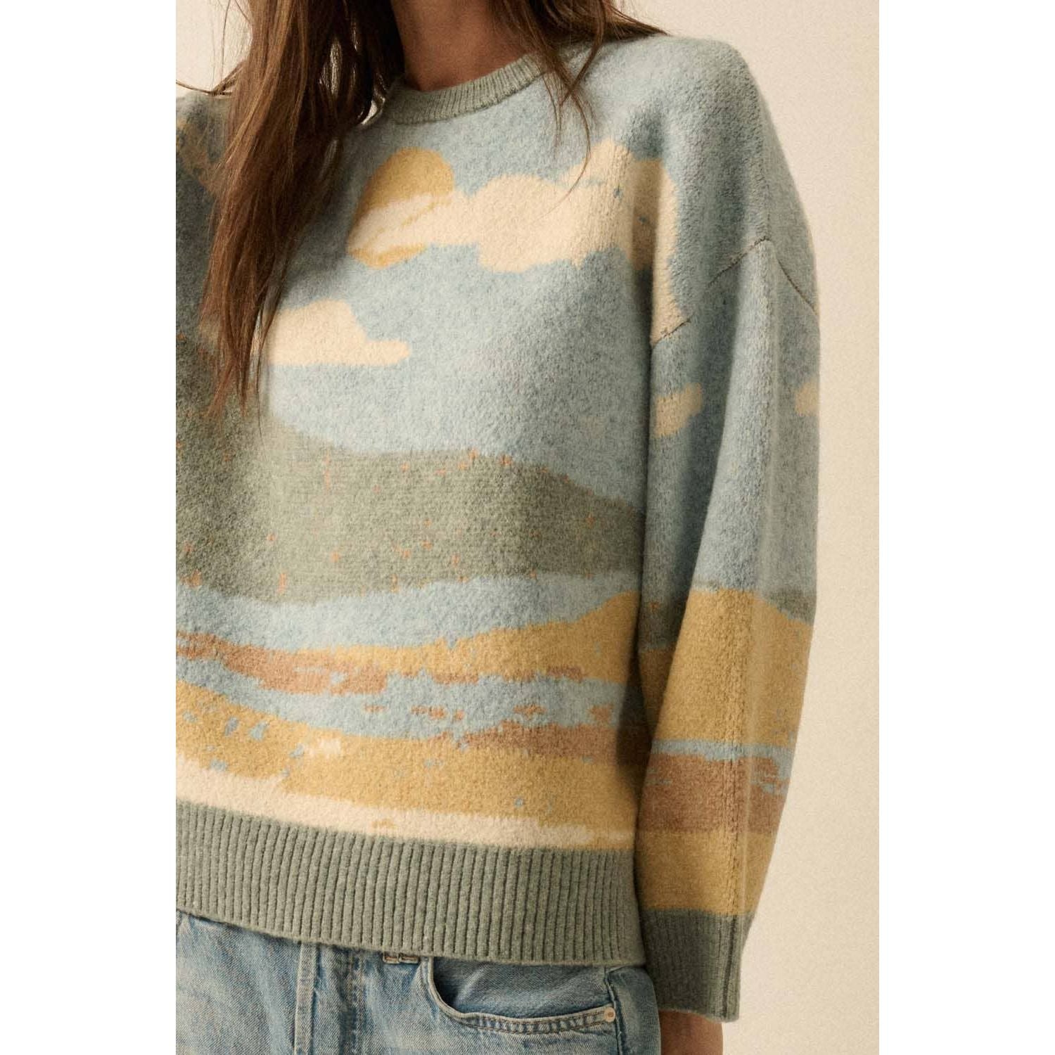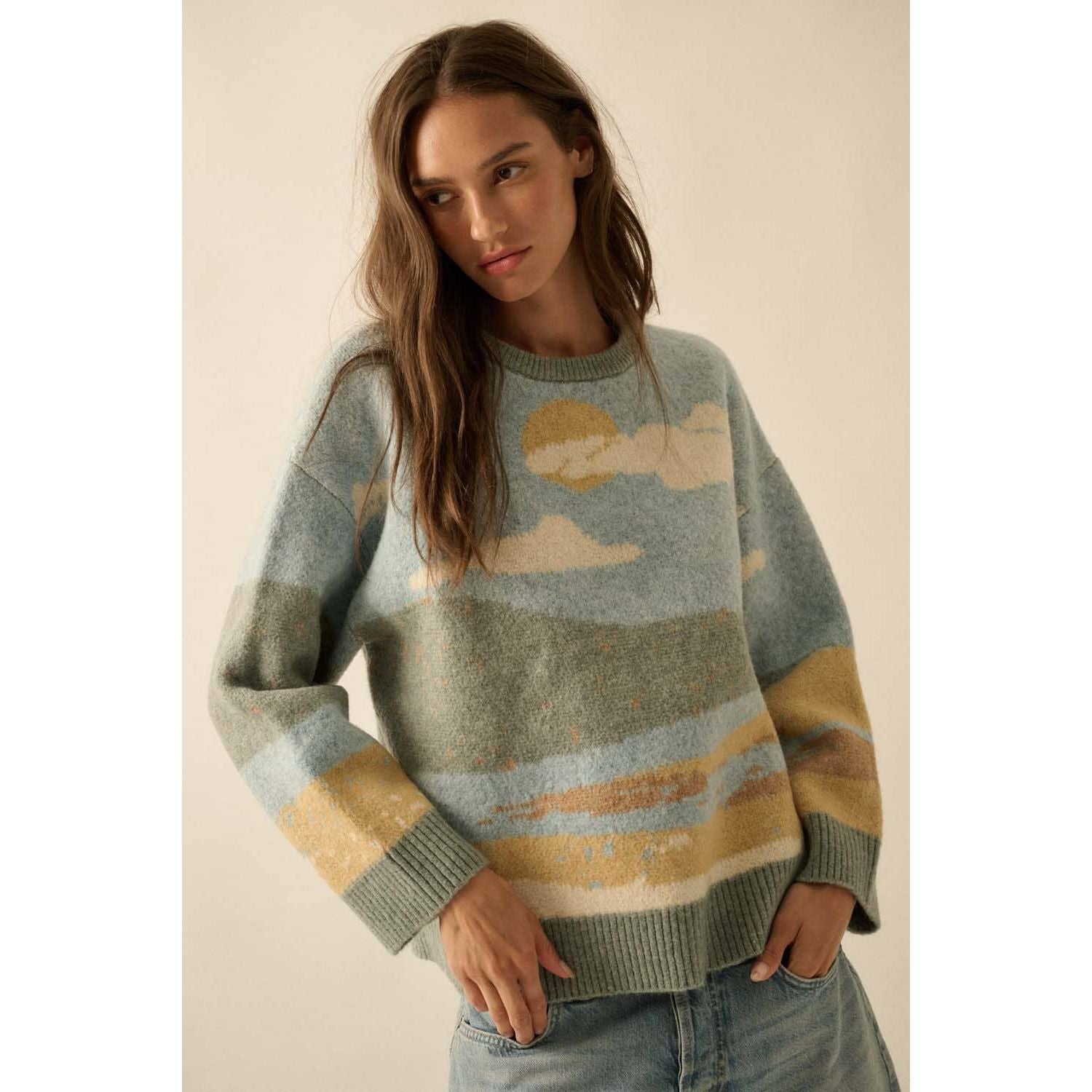 This cozy jacquard knit sweater showcases a charming beach landscape pattern all over. It features a comfy round neckline, long sleeves, and relaxed drop shoulders, making it perfect for laid-back days with a touch of seaside fun.
