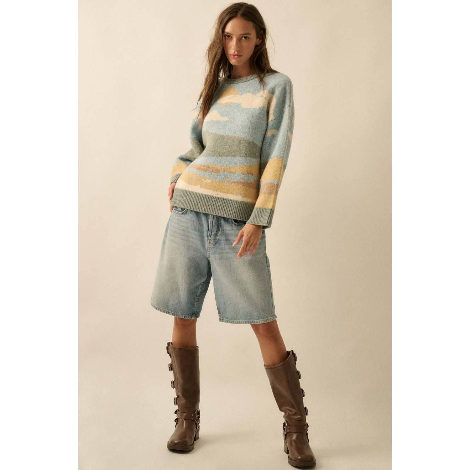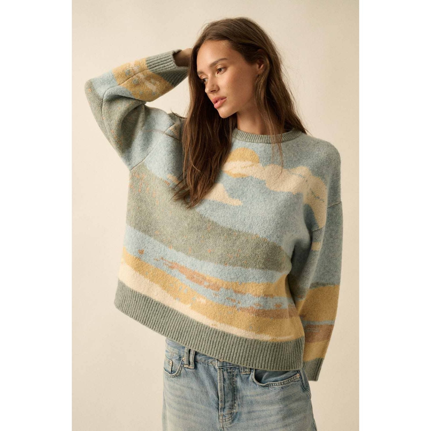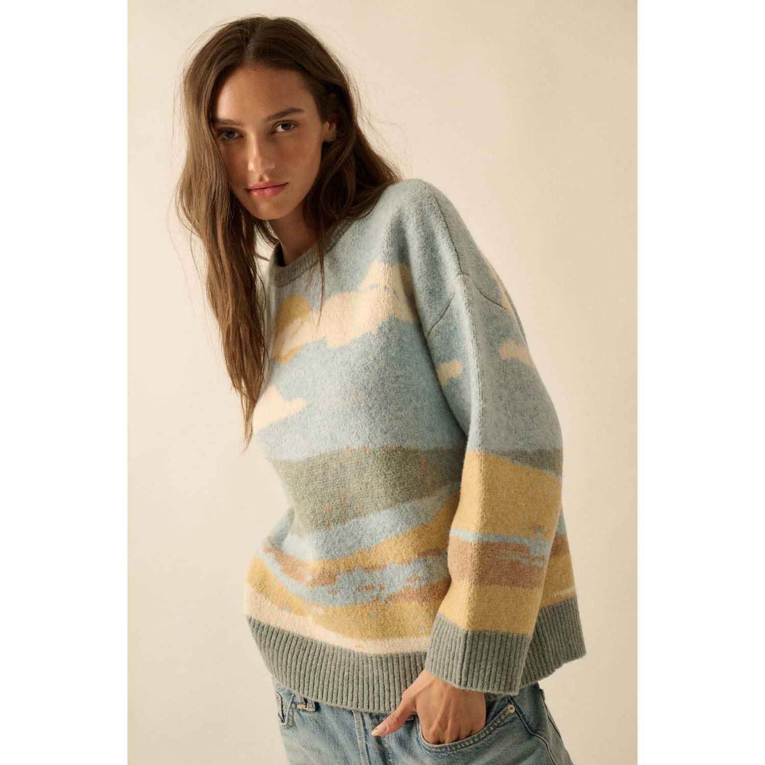 This cozy jacquard knit sweater showcases a charming beach landscape pattern all over. It features a comfy round neckline, long sleeves, and relaxed drop shoulders, making it perfect for laid-back days with a touch of seaside fun.