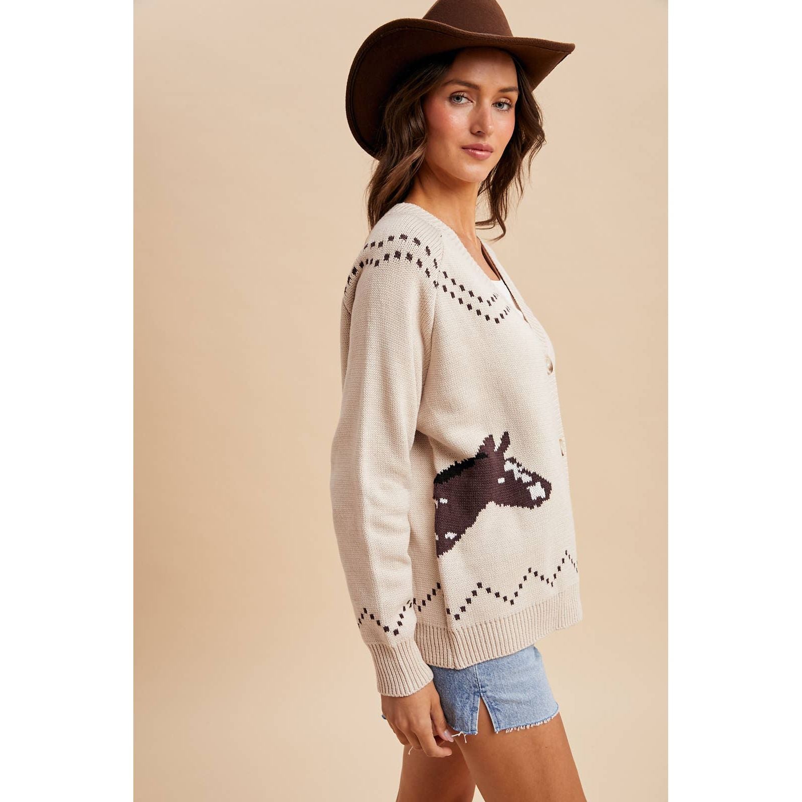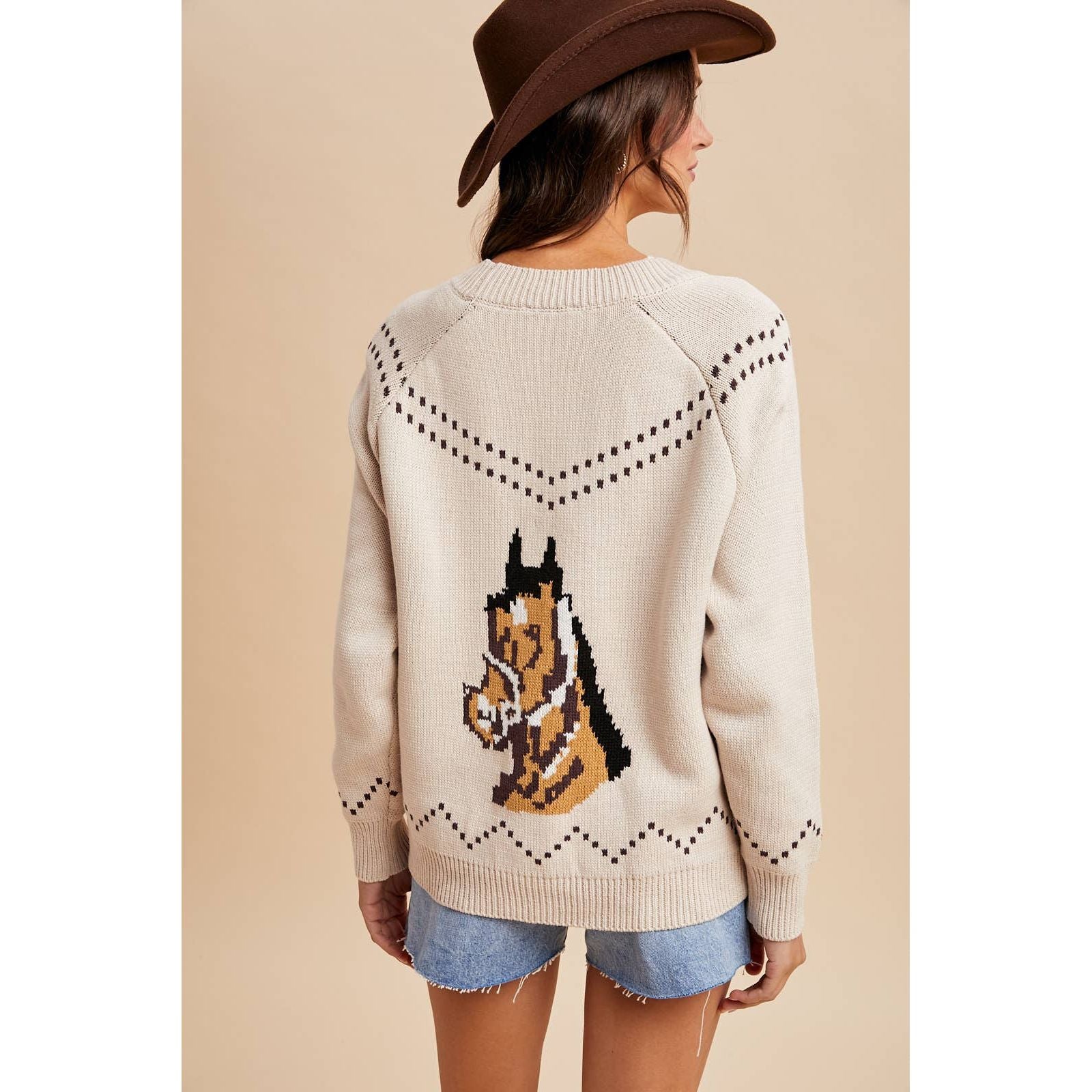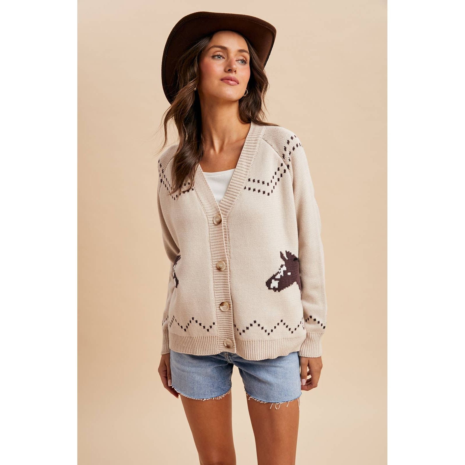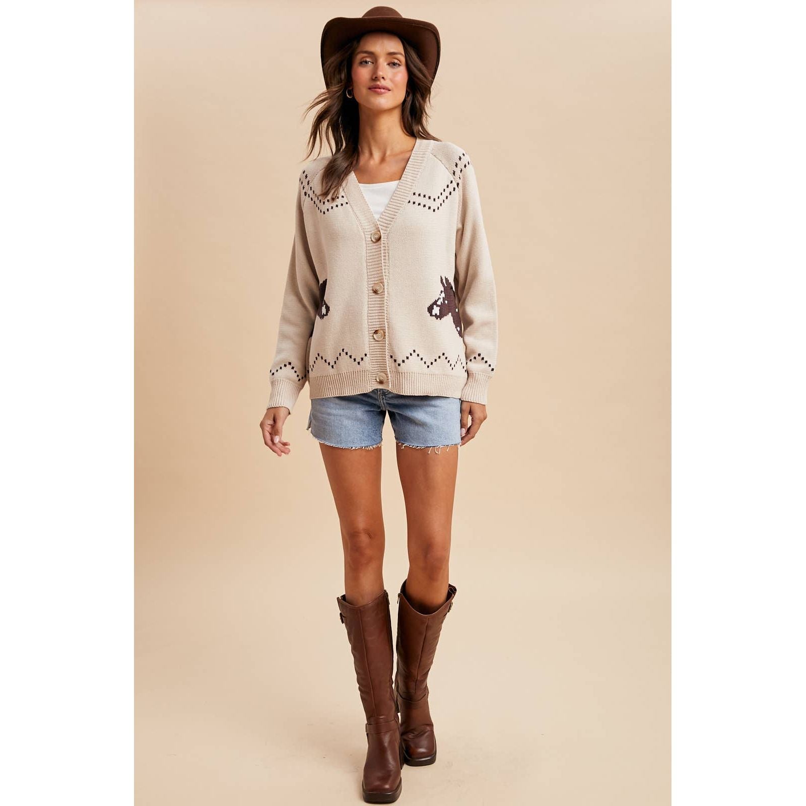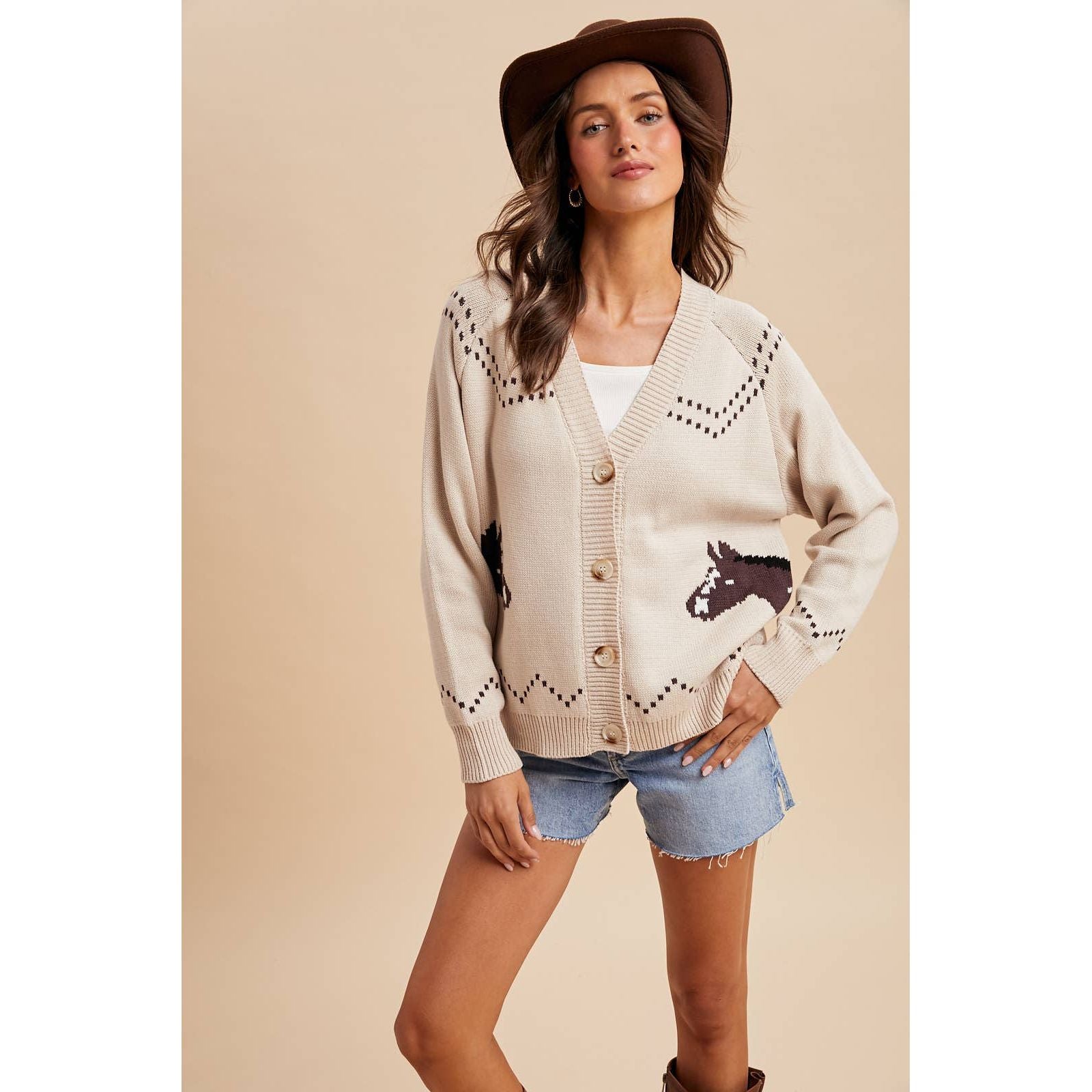 This playful knitted cardigan delights with jacquard horse designs on both the front and back, complemented by charming decorative borders, round tortoise shell buttons, and cozy ribbed edges.