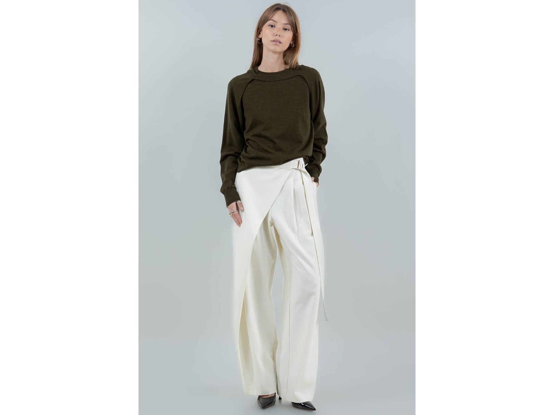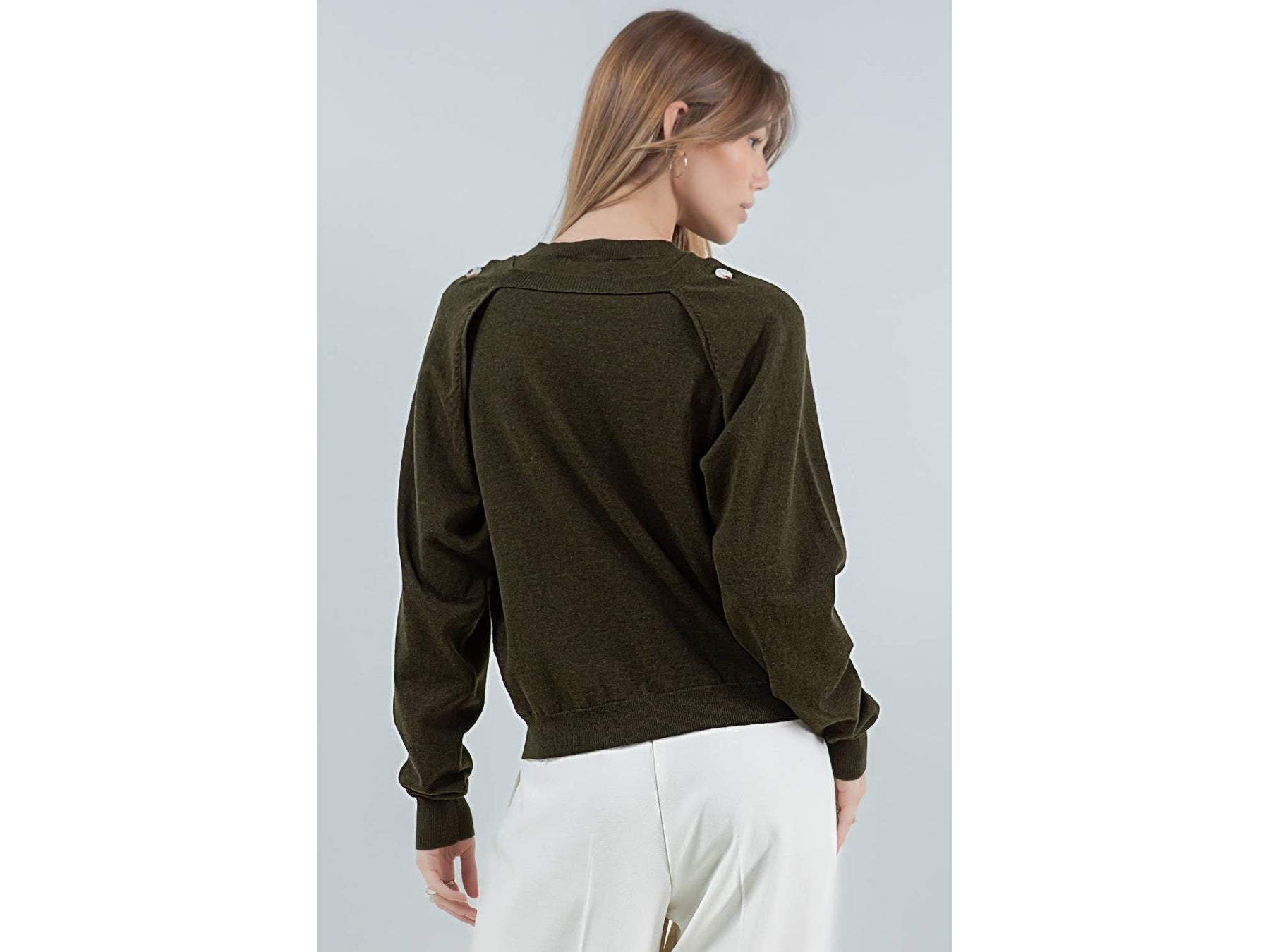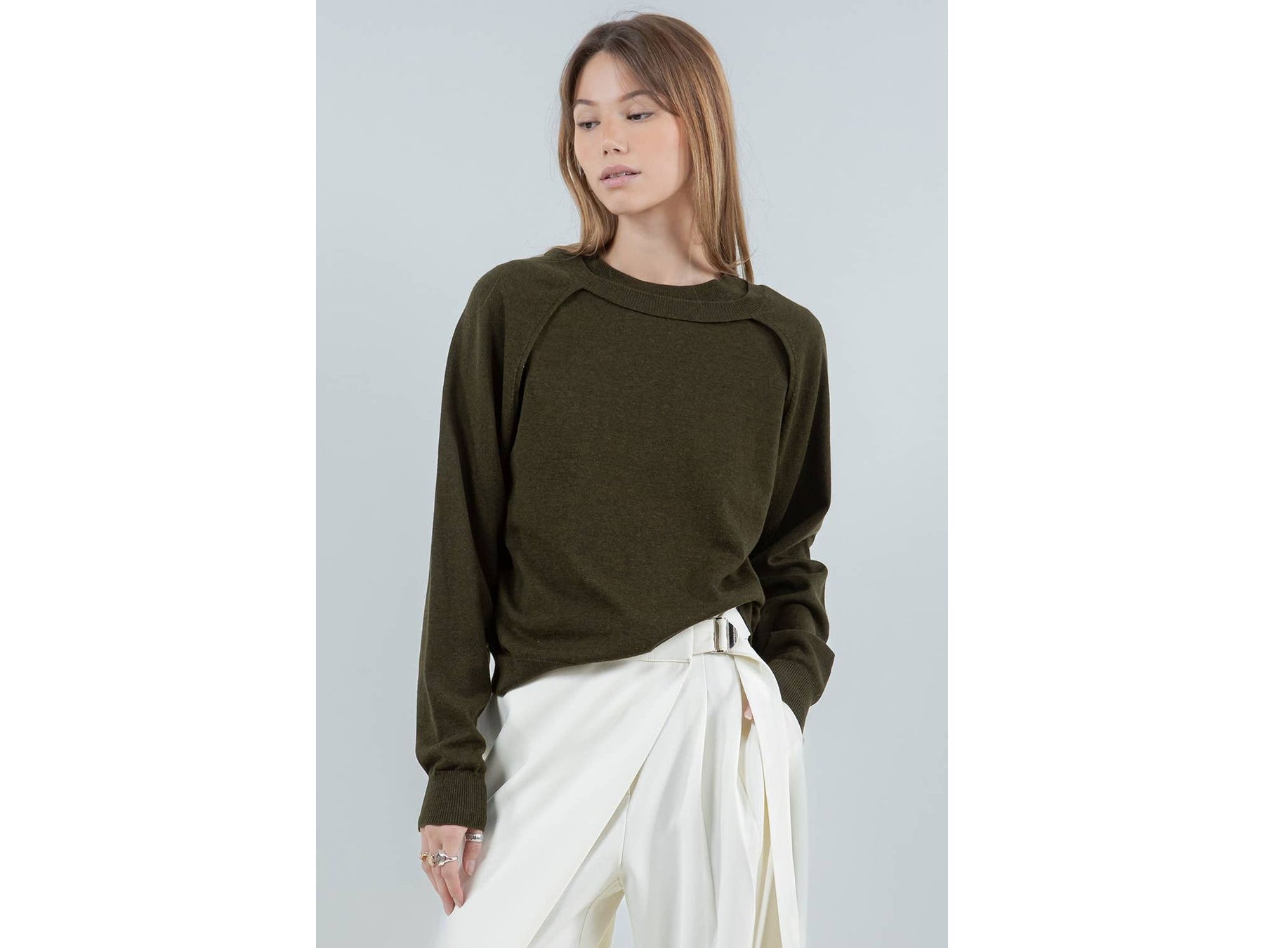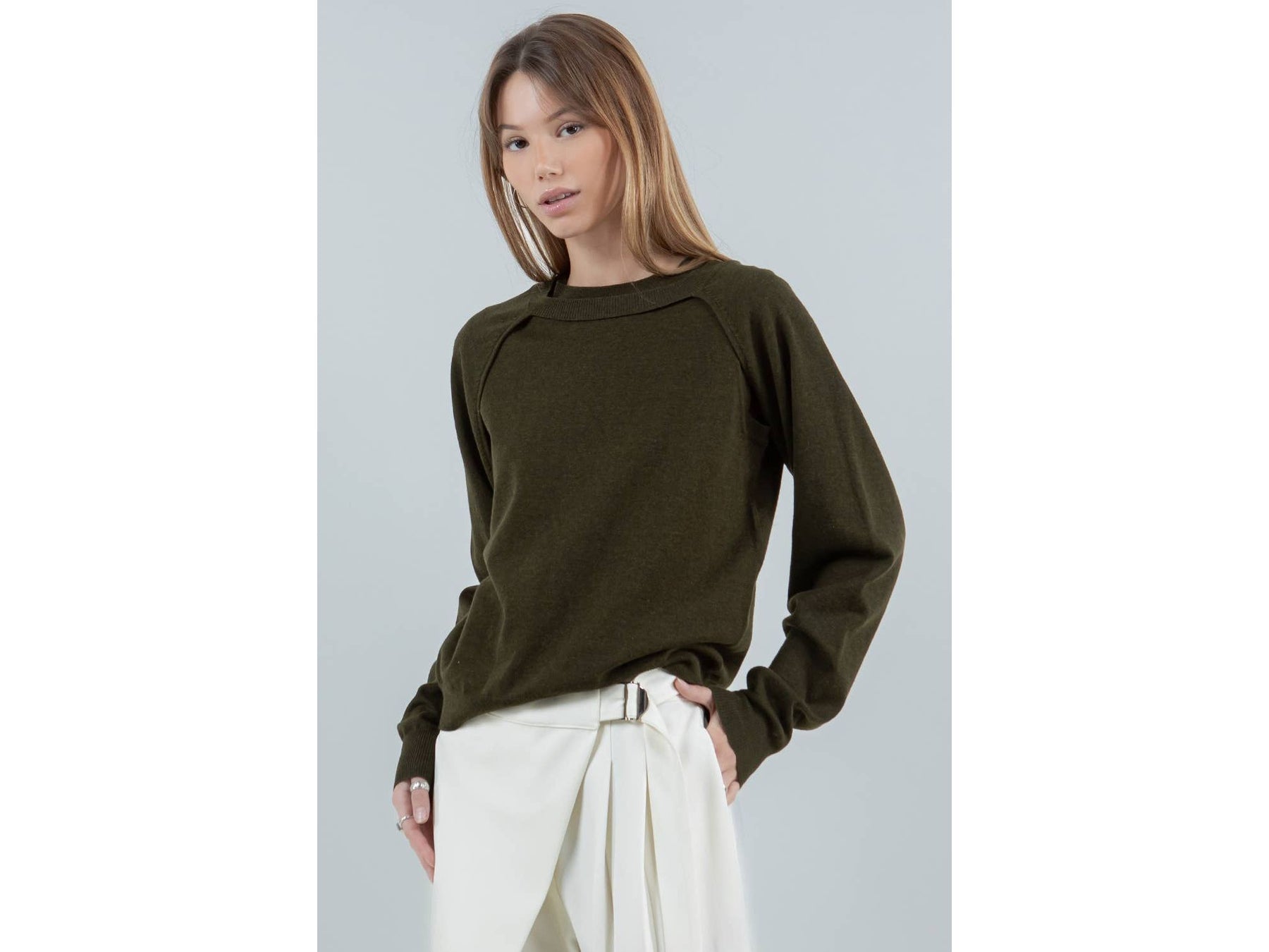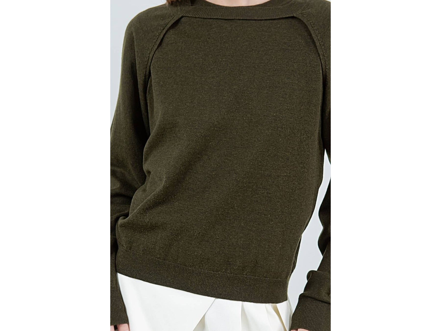 Introducing the sweater that does it all - your new favourite piece for every occasion. Crafted in a gorgeous olive tone, this knit features elegant raglan shoulders that create a relaxed, flattering fit without the fuss. The crew neckline and cozy ribbed edges give it that effortless polish you're after. Pair it with tailored pants for the office, layer it over a tee for weekend vibes, or wear it solo with your go-to jeans. Lightweight and endlessly versatile, this is the kind of sweater you'll find yourself reaching for again and again, season after season.