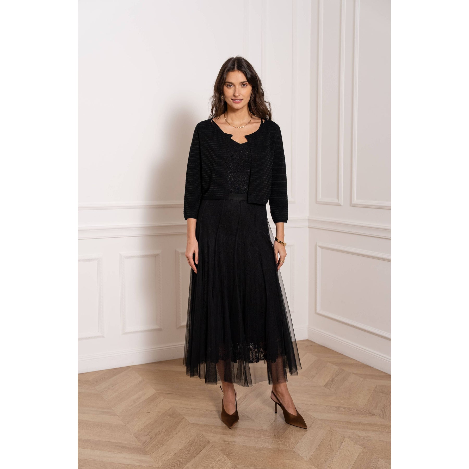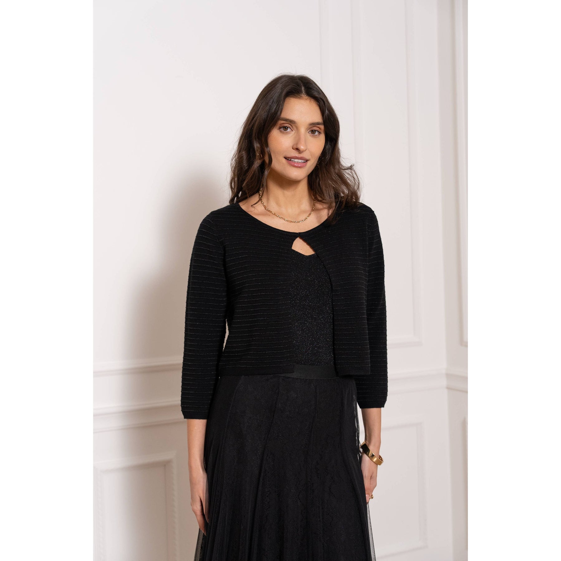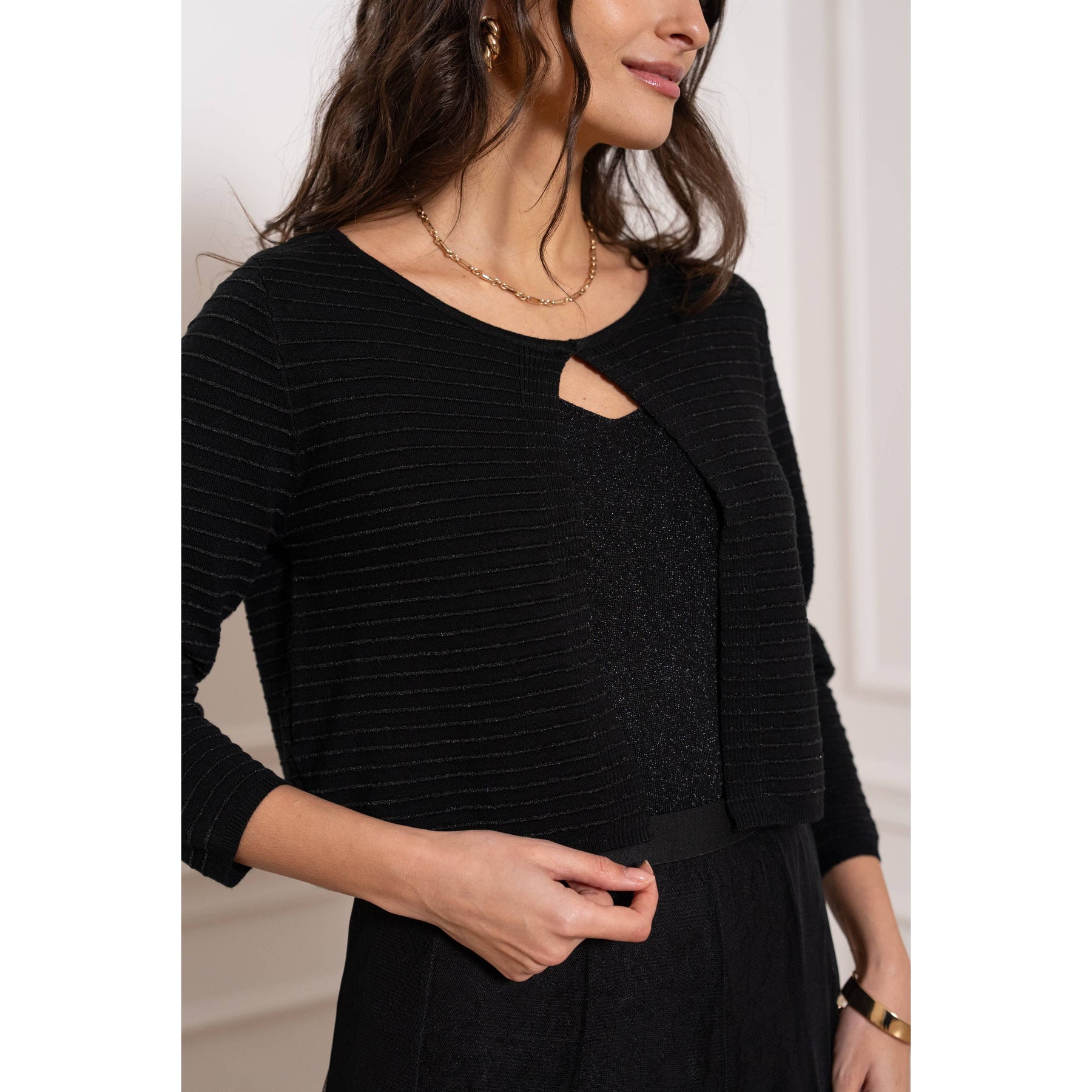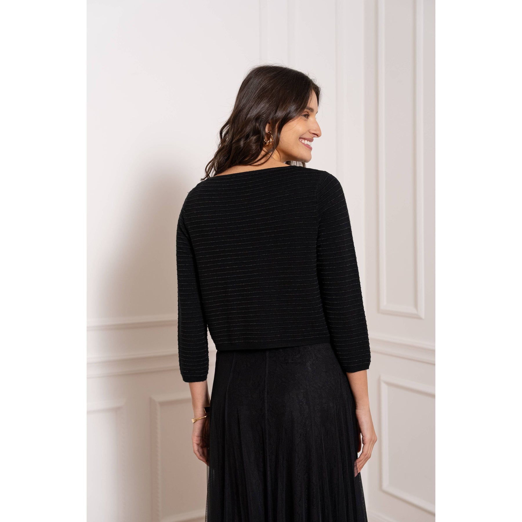 Meet the new Eve cardigan! This bolero-style piece features fine knit lurex stripes, 3/4 sleeves, and a handy button closure. Perfectly pairs with our lurex knit tank top for a sparkling combo.