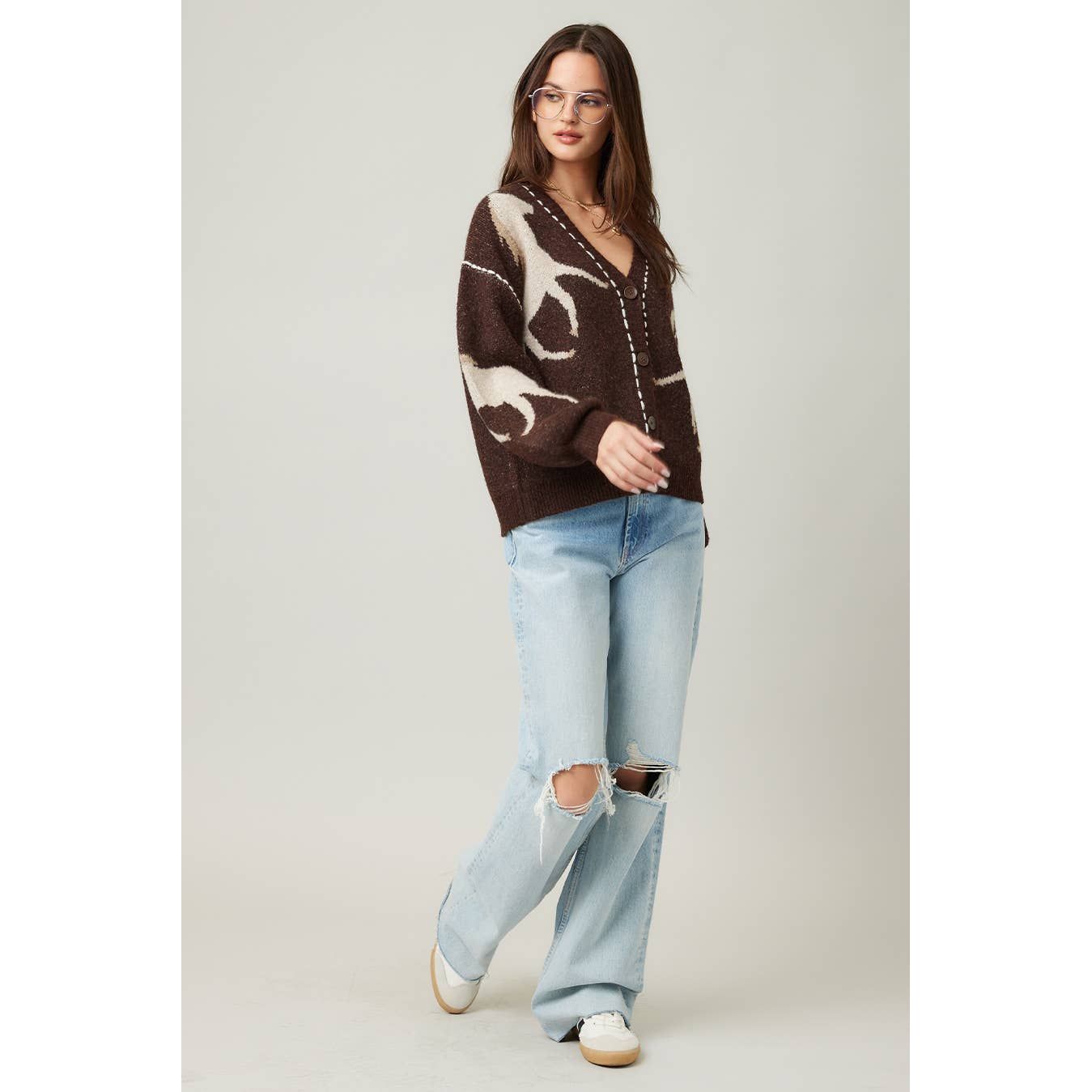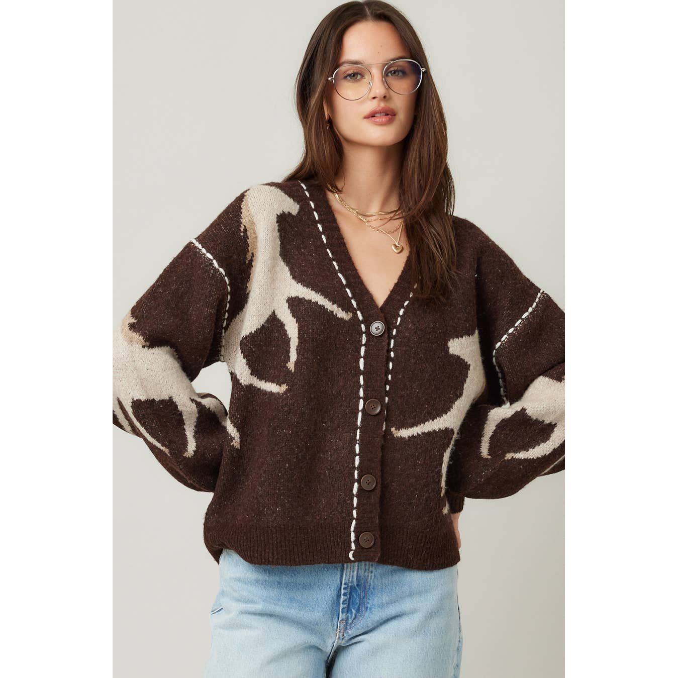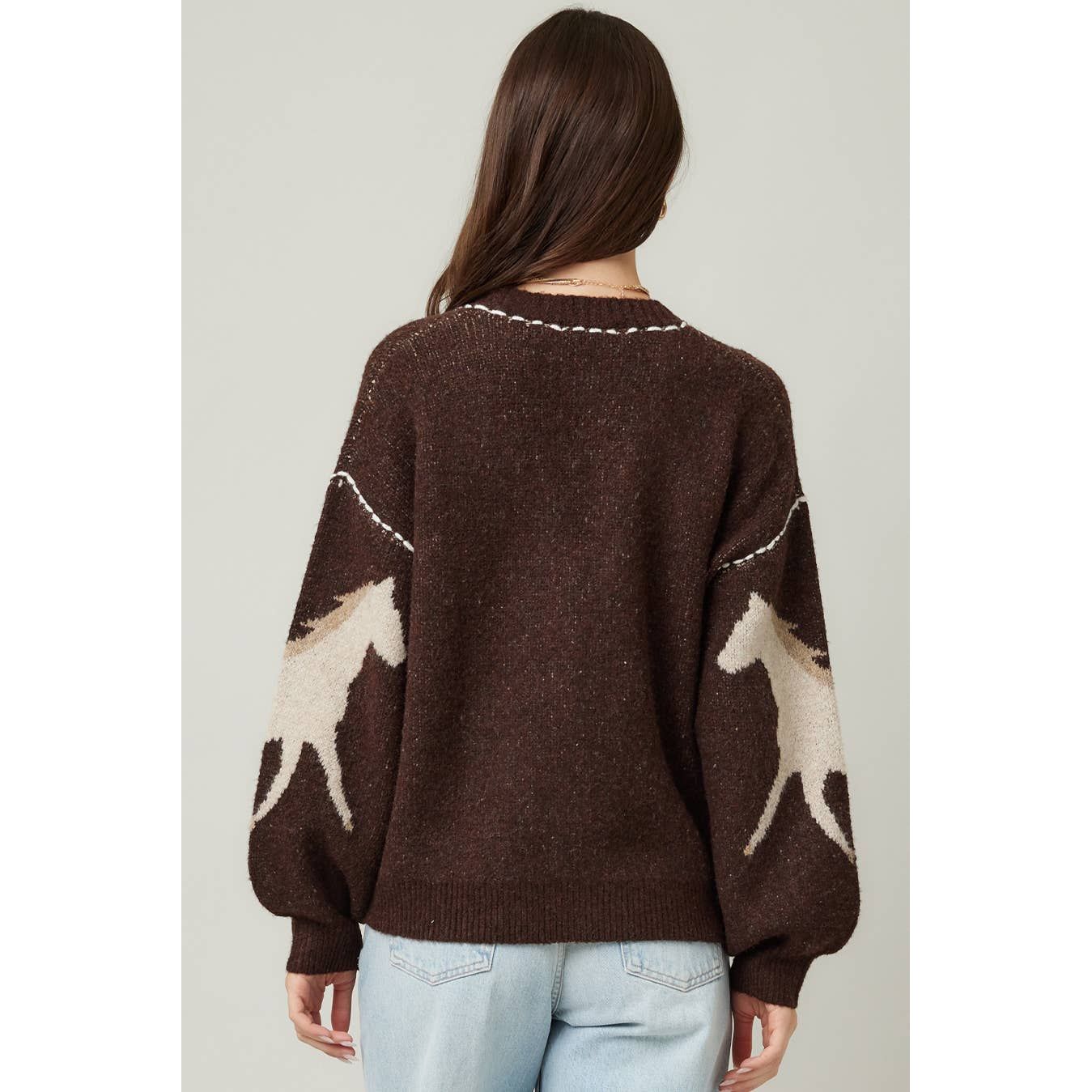 This cozy knit cardigan features snug long sleeves and a charming V-neck, highlighted by a unique horse graphic, front buttons, and standout contrast stitching, a fun way to stay comfy and stylish all season.