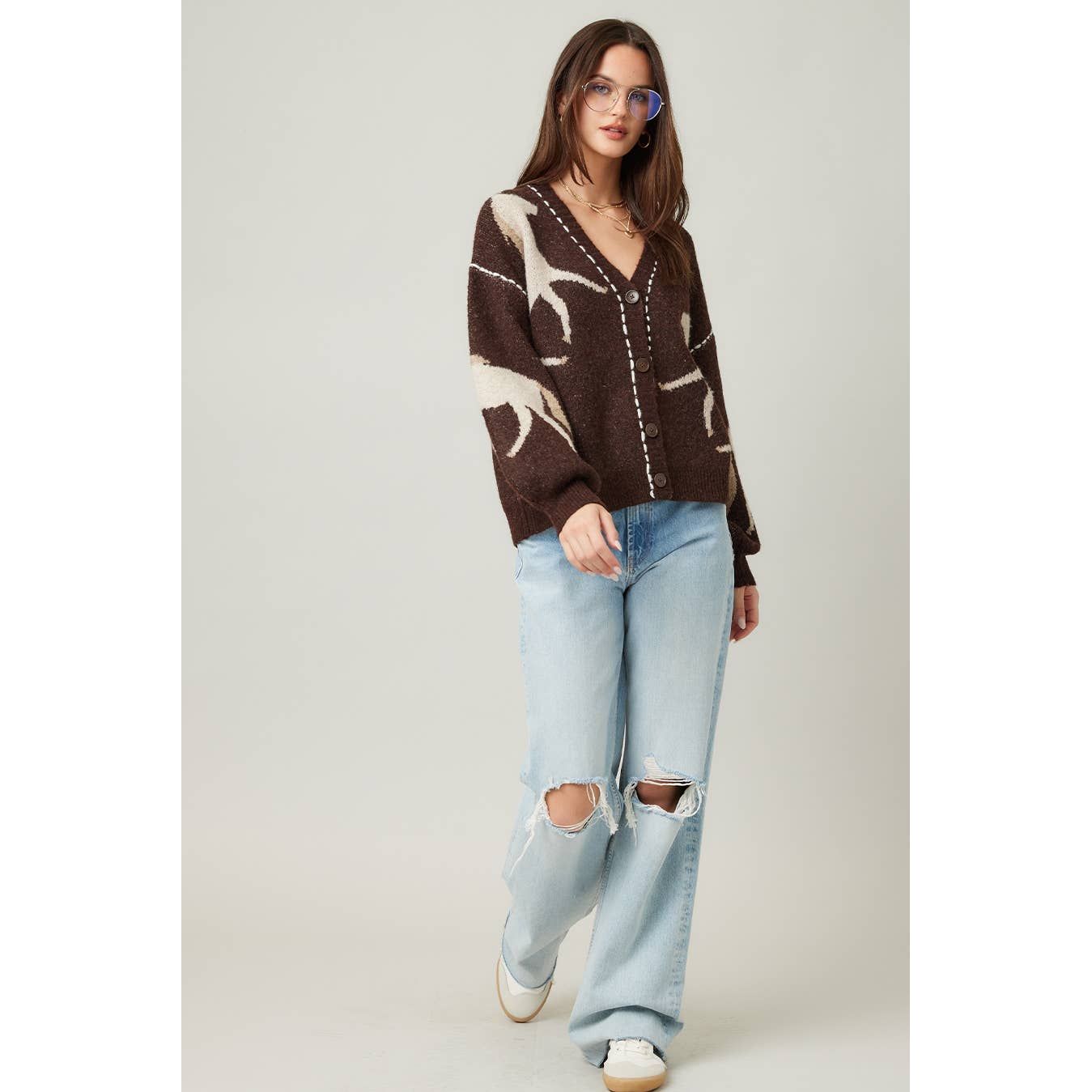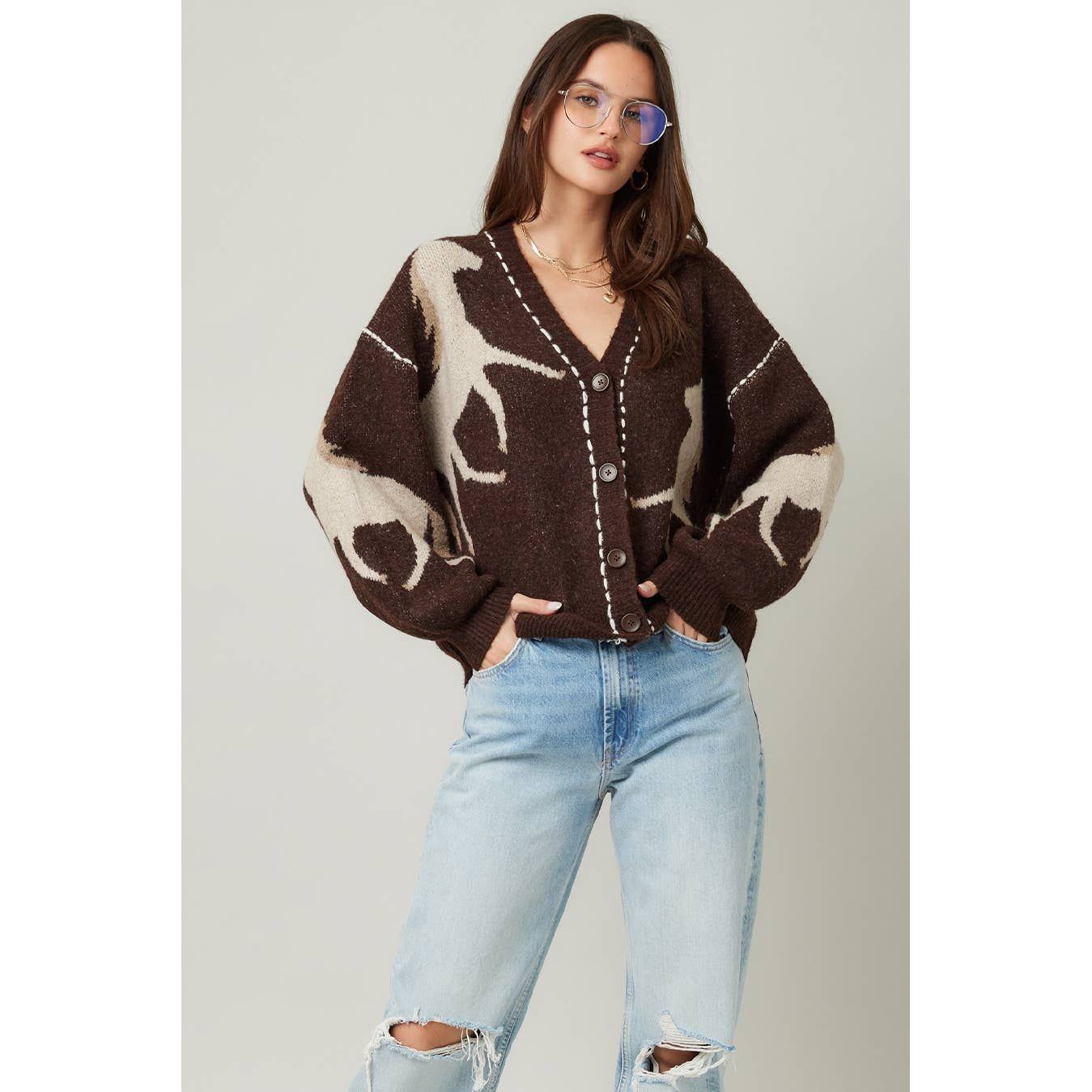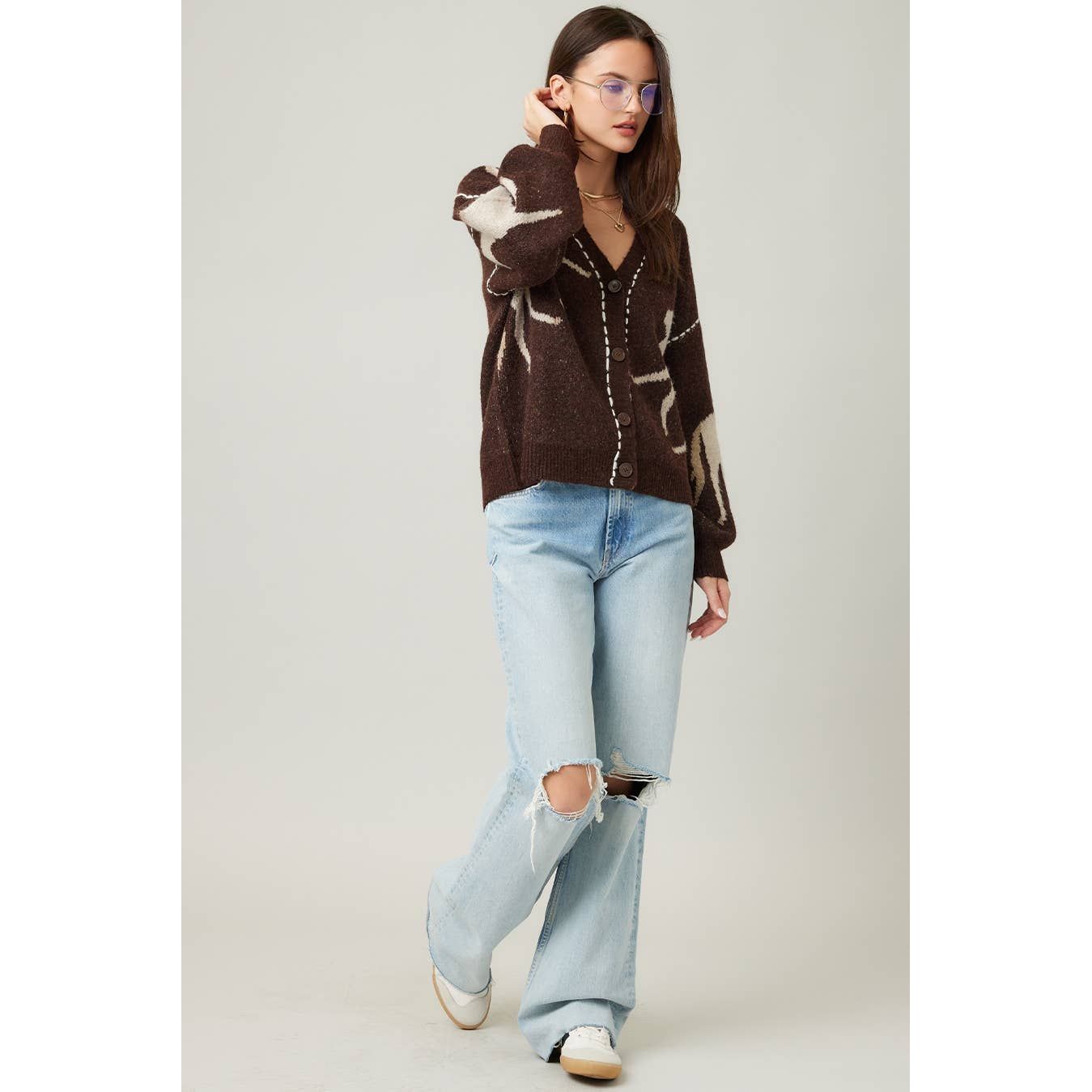 This cozy knit cardigan features snug long sleeves and a charming V-neck, highlighted by a unique horse graphic, front buttons, and standout contrast stitching, a fun way to stay comfy and stylish all season.