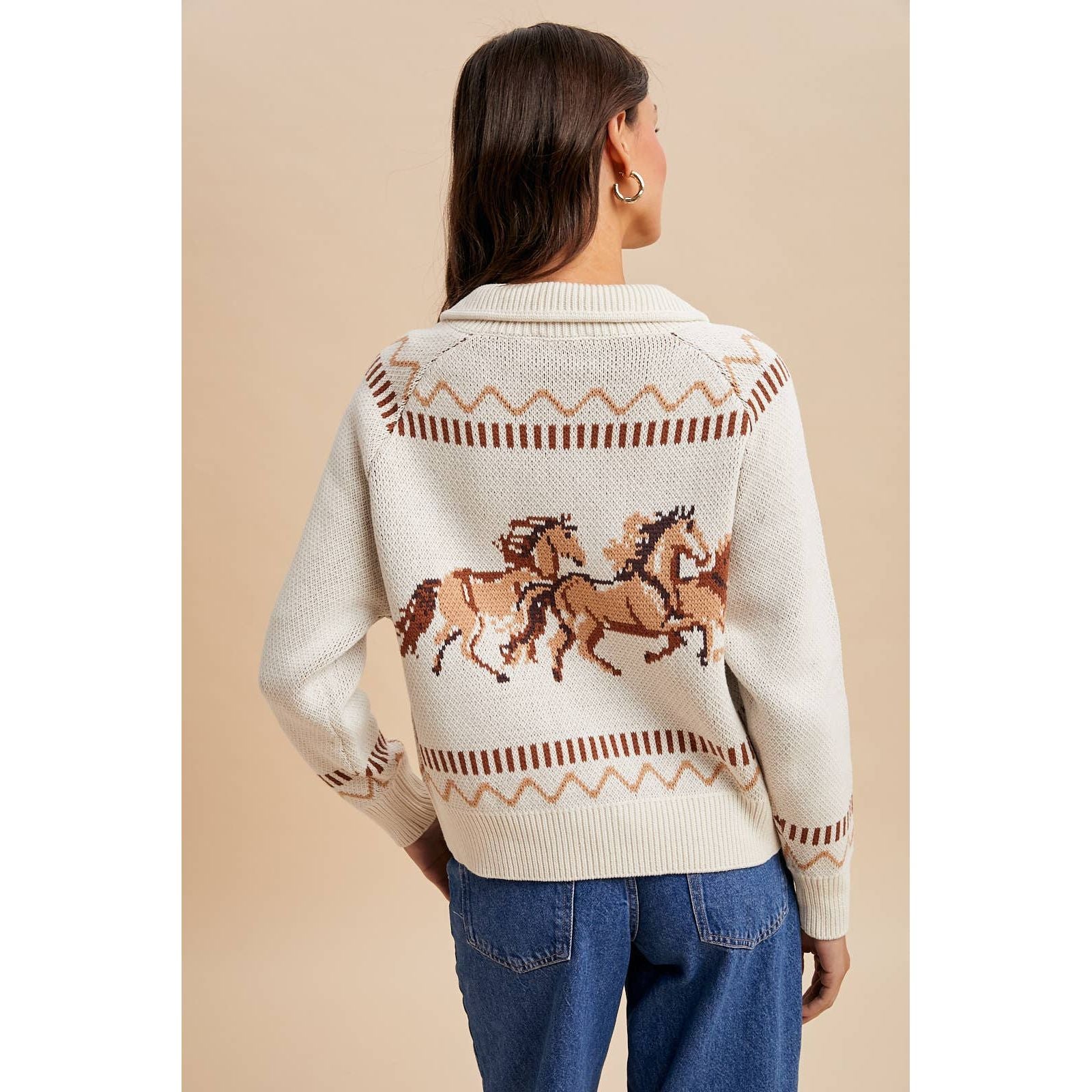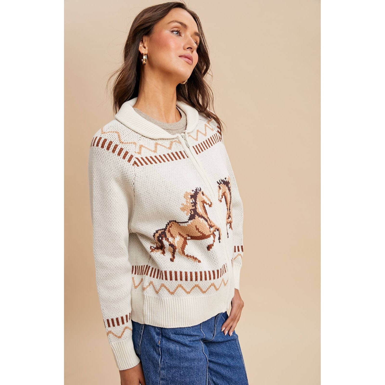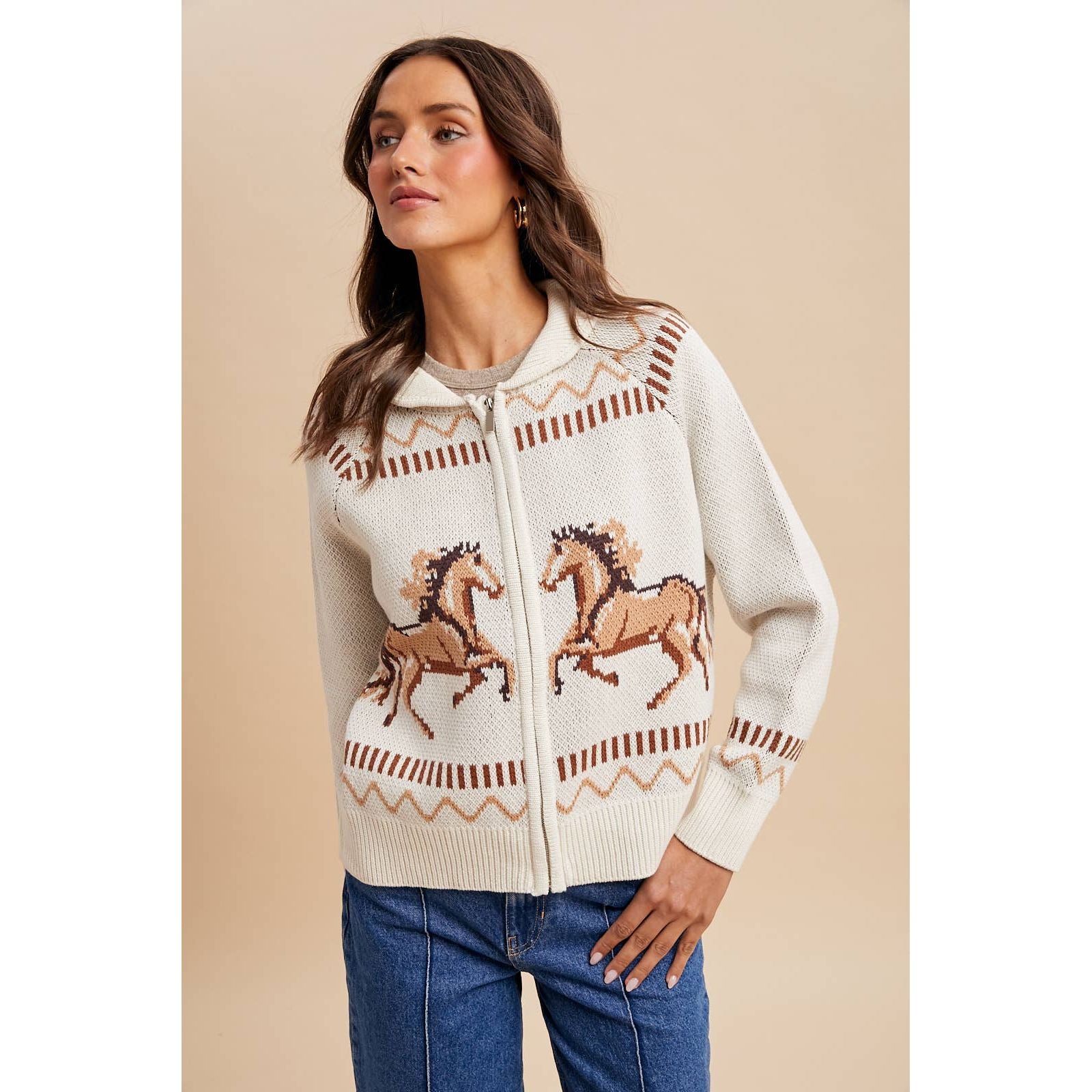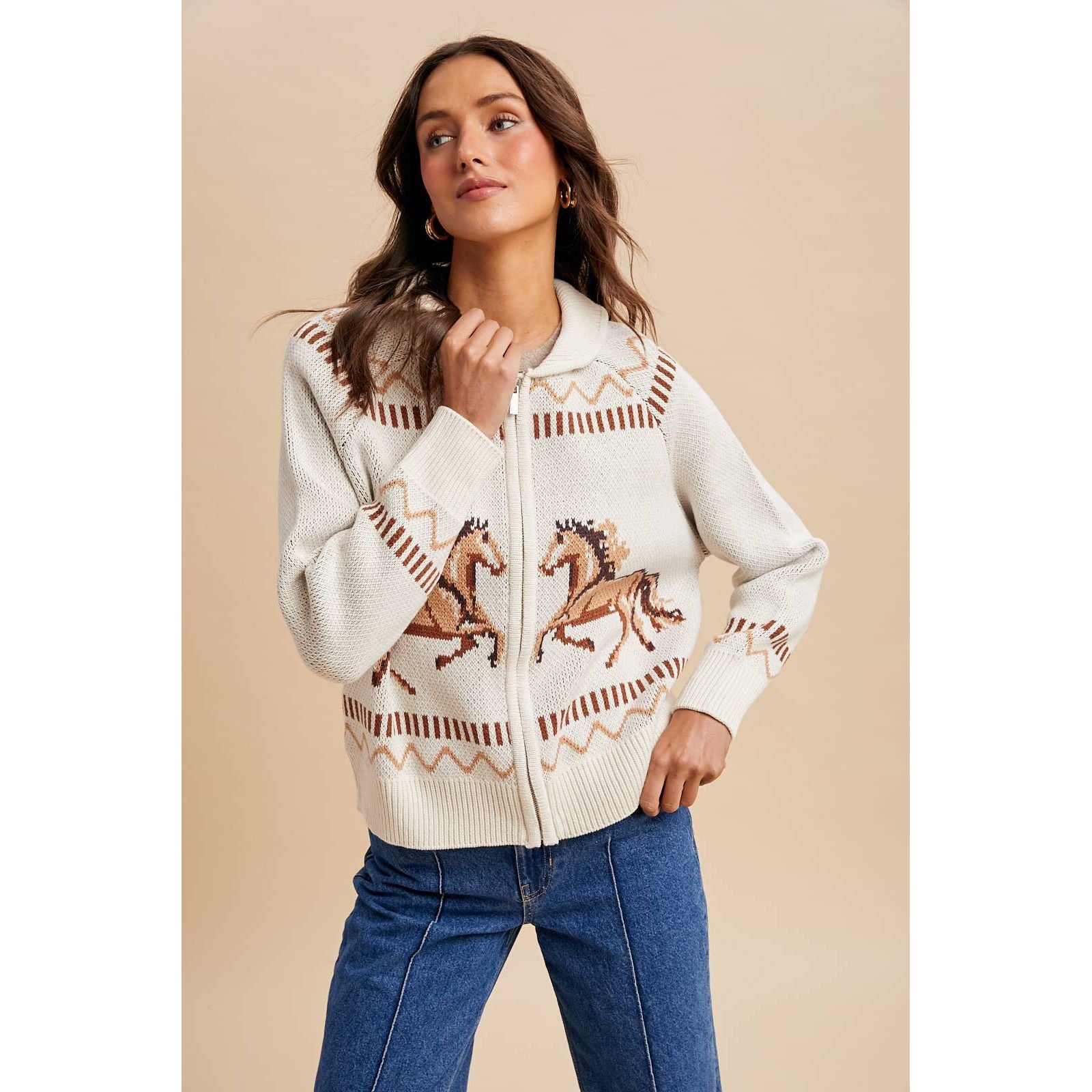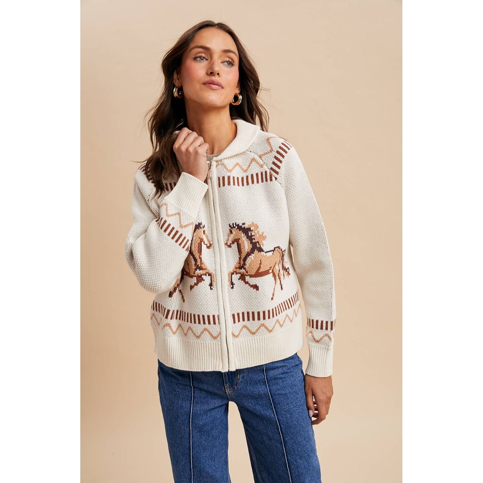 This playful western horse cardigan is crafted from knitted cotton jacquard, featuring a handy metal zip pull, a cozy round collar, and a ribbed banded hem for extra comfort.