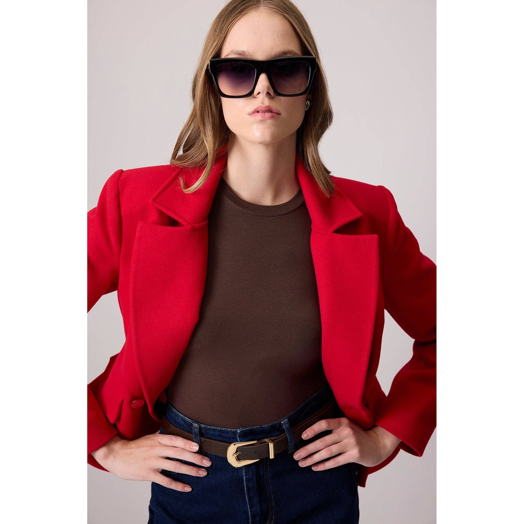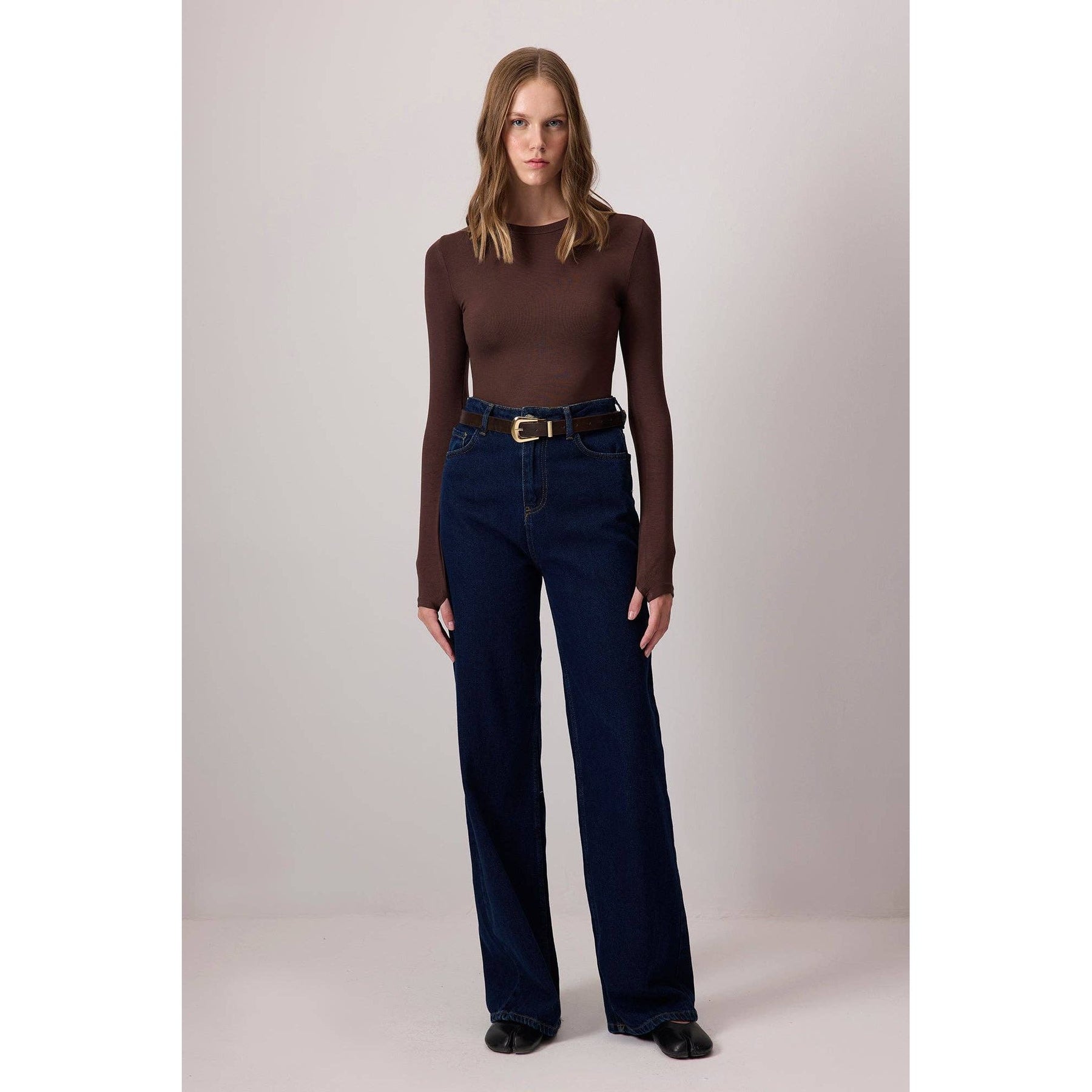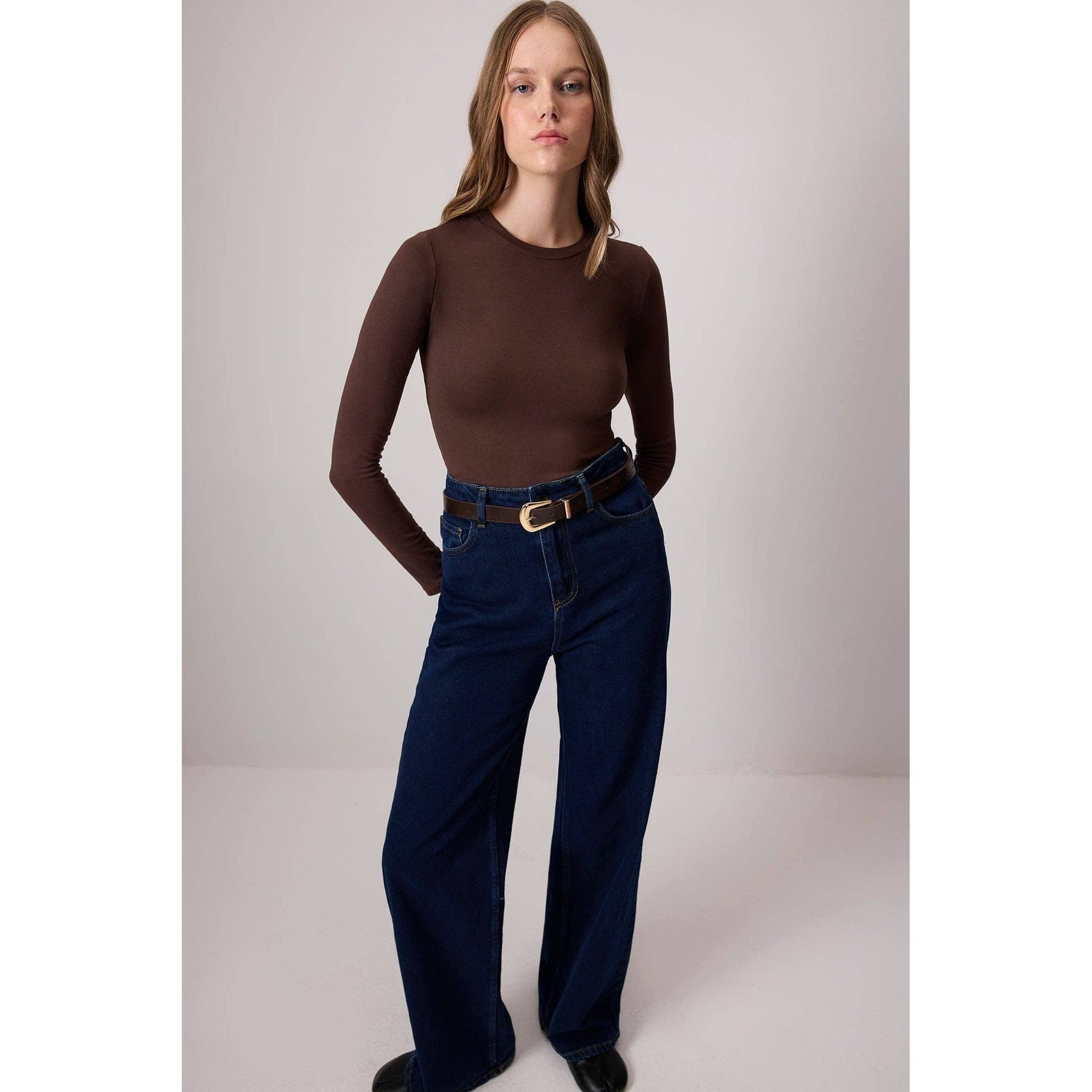 Elevate your essentials with this sleek long sleeve top made from a luxurious modal-polyester blend. Designed for a second-skin fit, it features a classic round neckline, ultra-soft ribbed texture, and just the right amount of stretch for all-day comfort. The rich chocolate brown hue adds a sophisticated touch, making it a versatile layering piece for cool-weather styling or chic solo wear. Pair it with high-rise denim, tailored trousers, or layer under jackets and vests for effortless transitional looks. Ideal for capsule wardrobes, this timeless top is your go-to for minimalist yet polished styling.