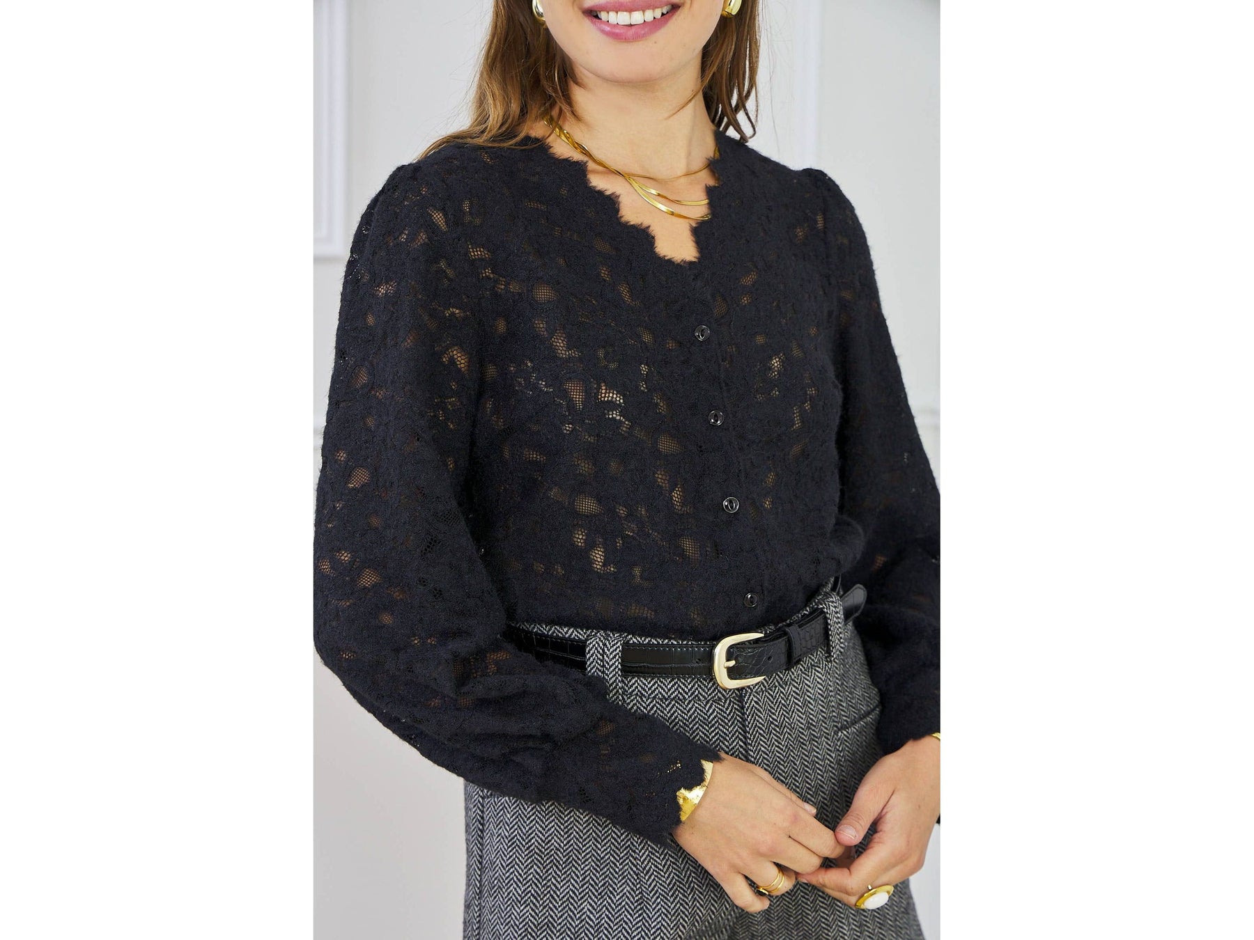 Romantic and refined, the lace button-down blouse adds a touch of effortless femininity to any outfit. Offering both comfort and sophistication with its delicate lace texture and subtle transparency.