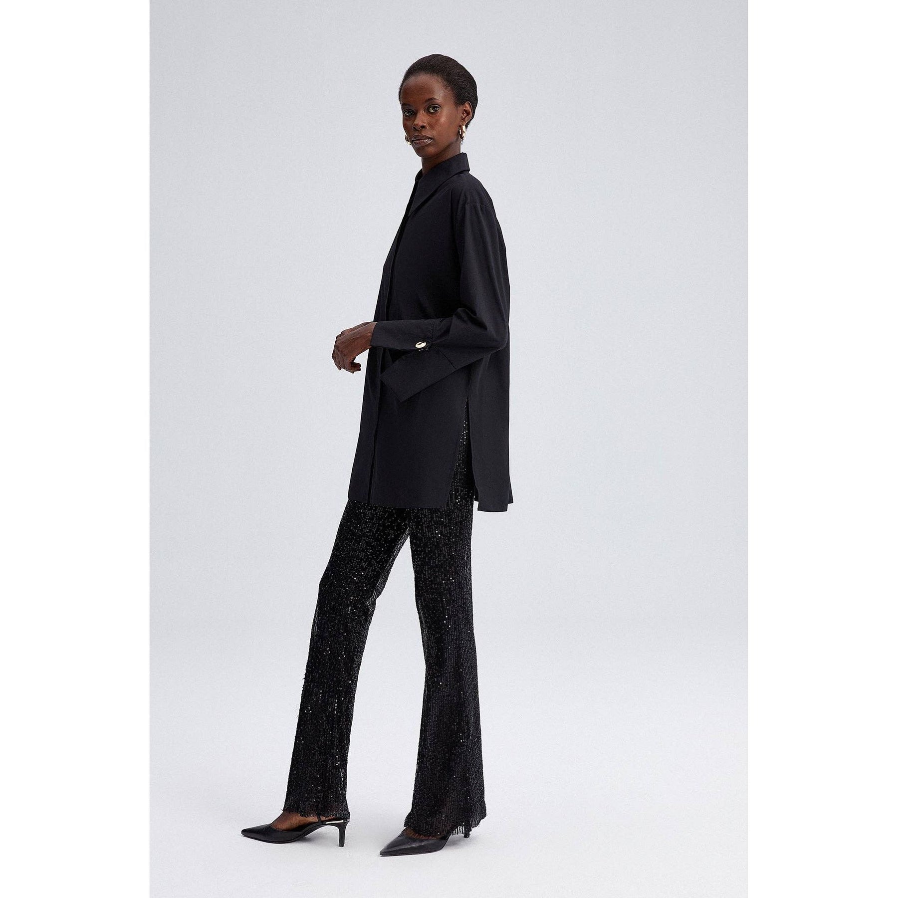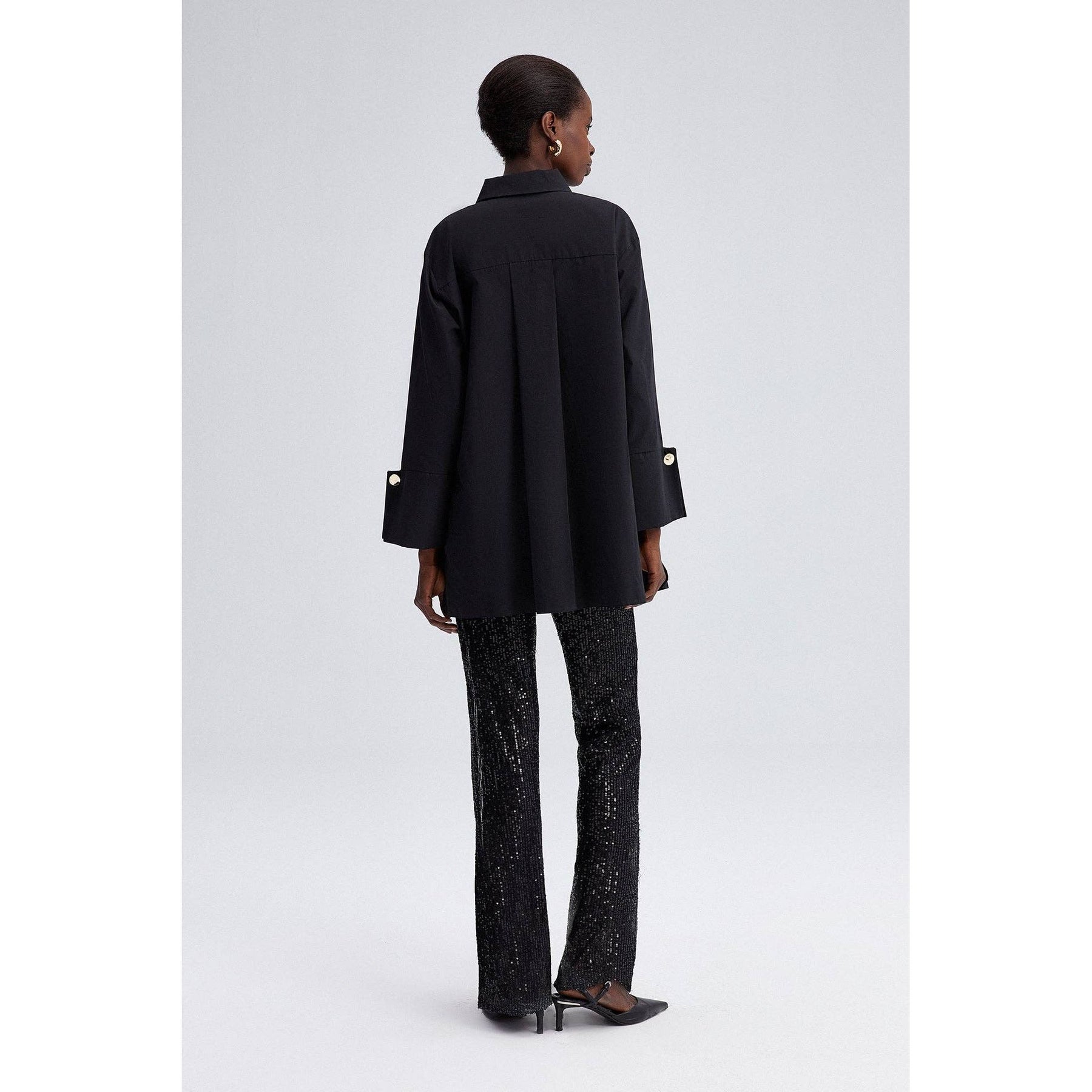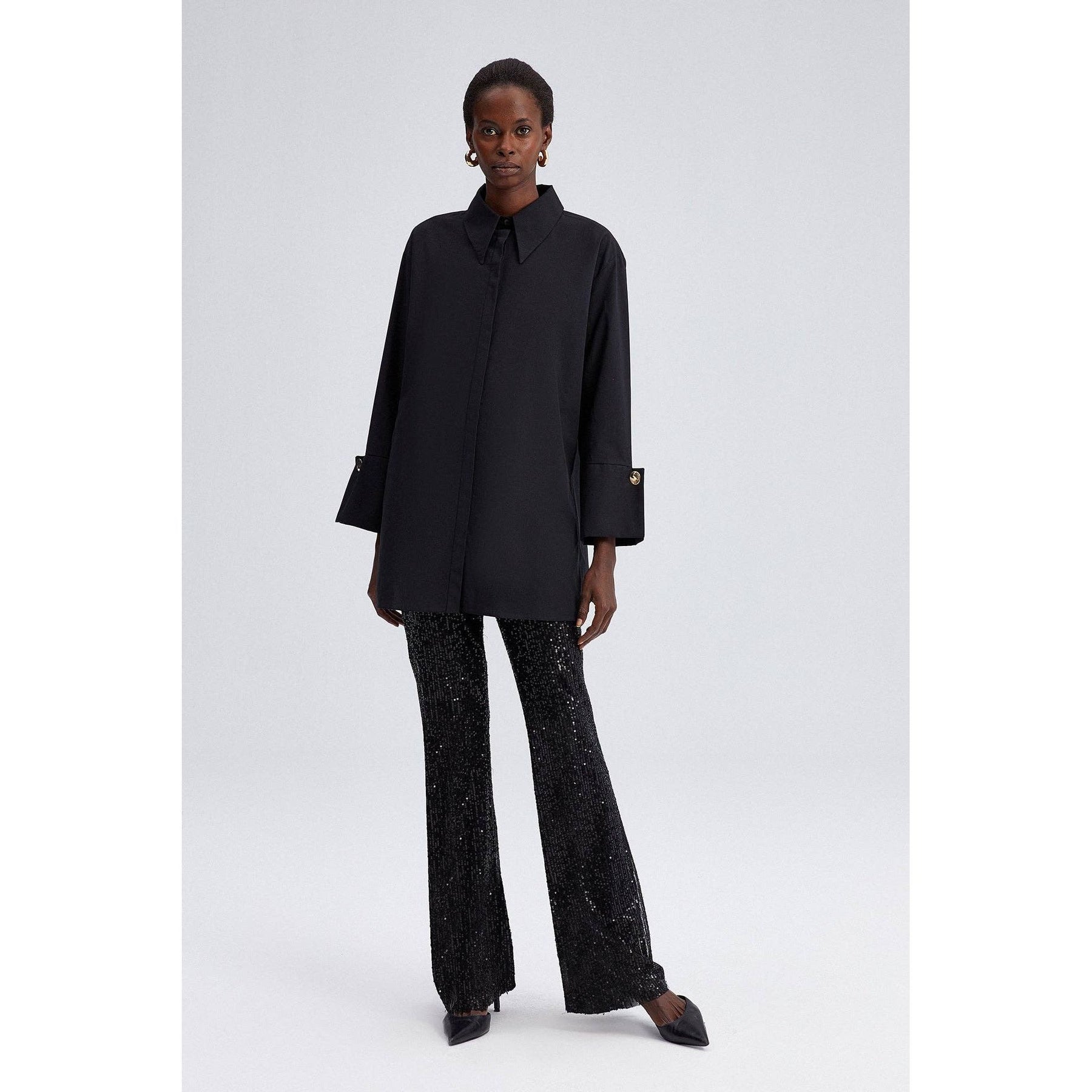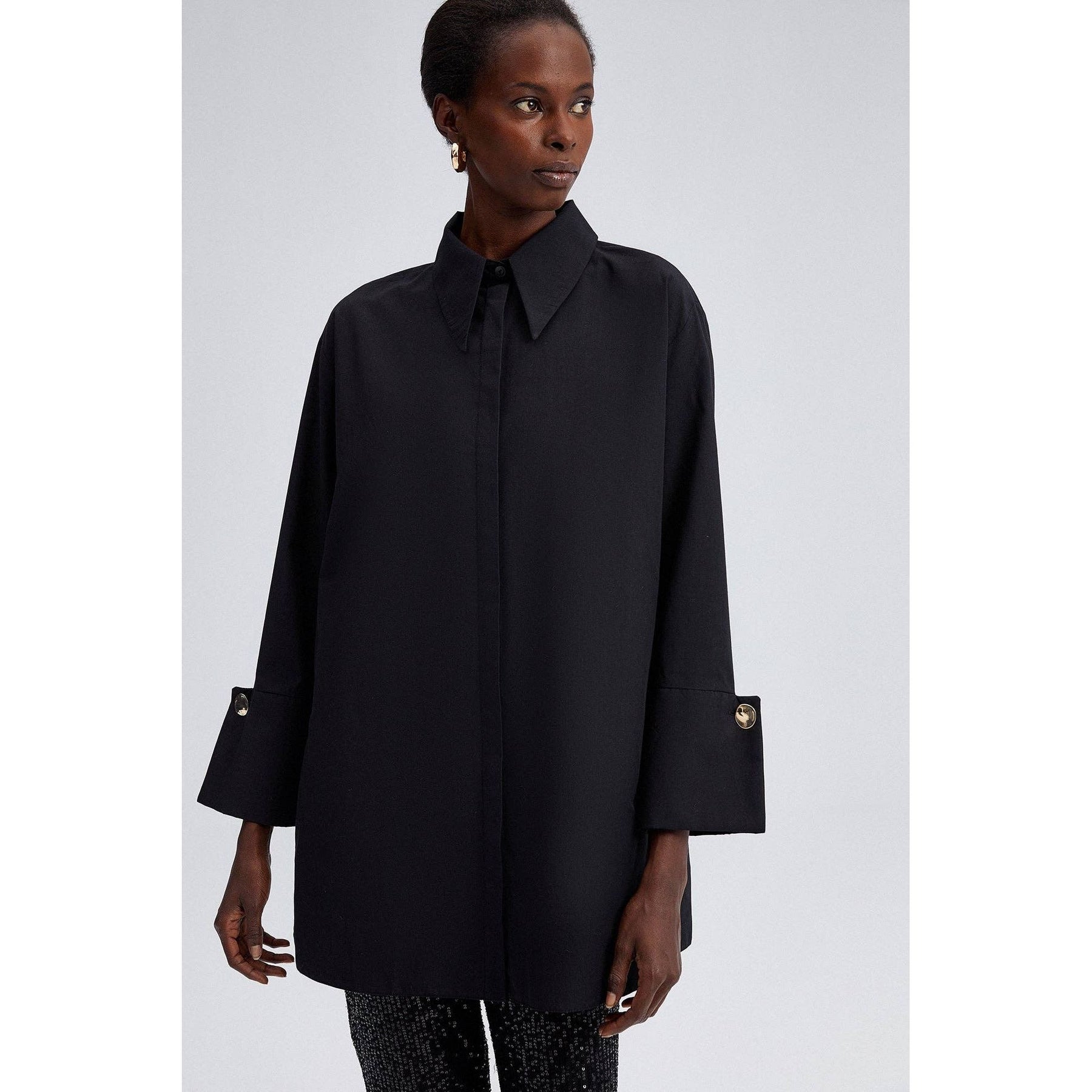 Elevate your smart-casual and evening ensembles with this sophisticated black poplin shirt featuring bold wide cuffs and polished gold-tone buttons. Its relaxed, tunic-length silhouette drapes effortlessly while maintaining structure with a classic shirt collar and hidden button placket. Designed with high side slits for easy layering, this versatile shirt pairs seamlessly with tailored trousers or statement sequin pants for an effortlessly elegant look.