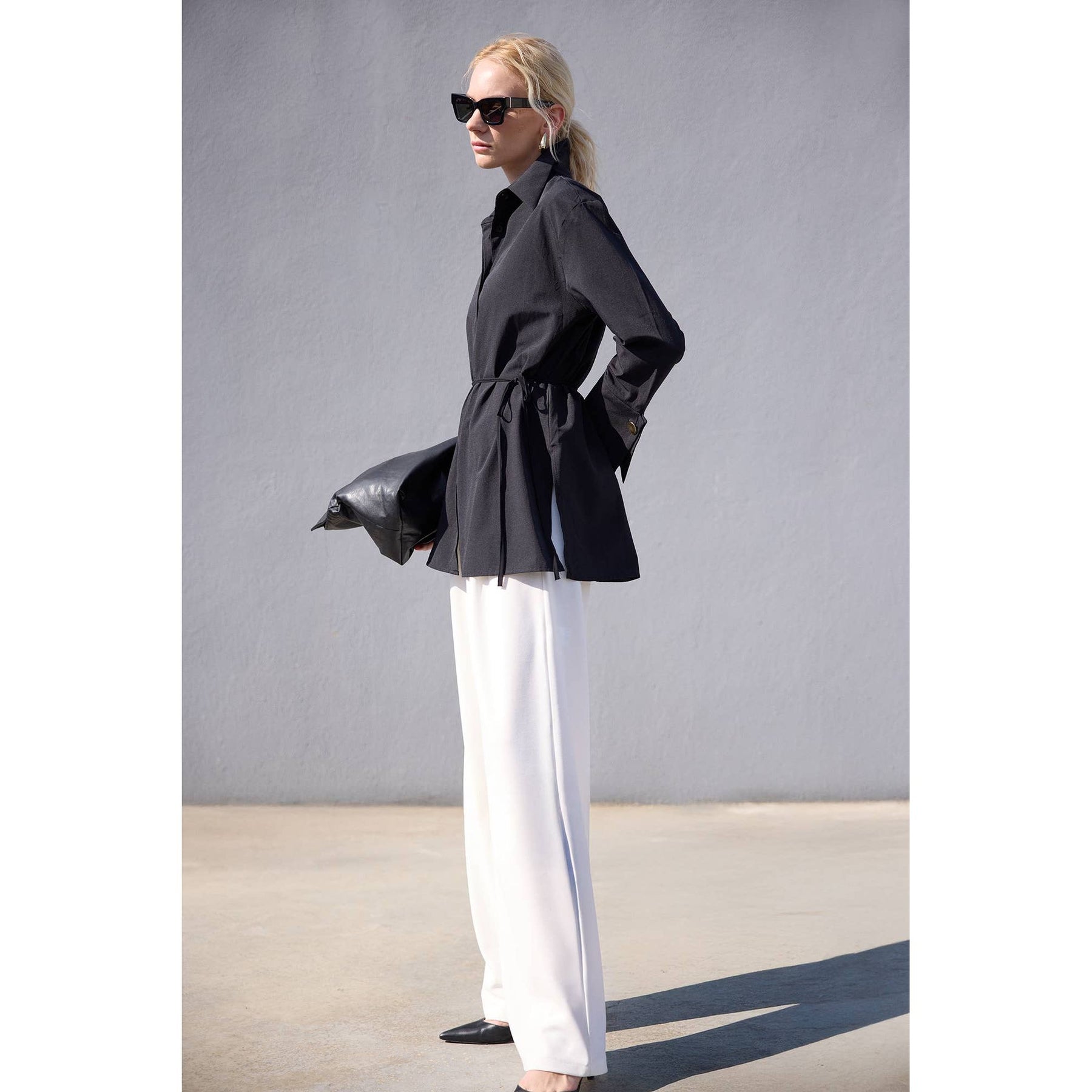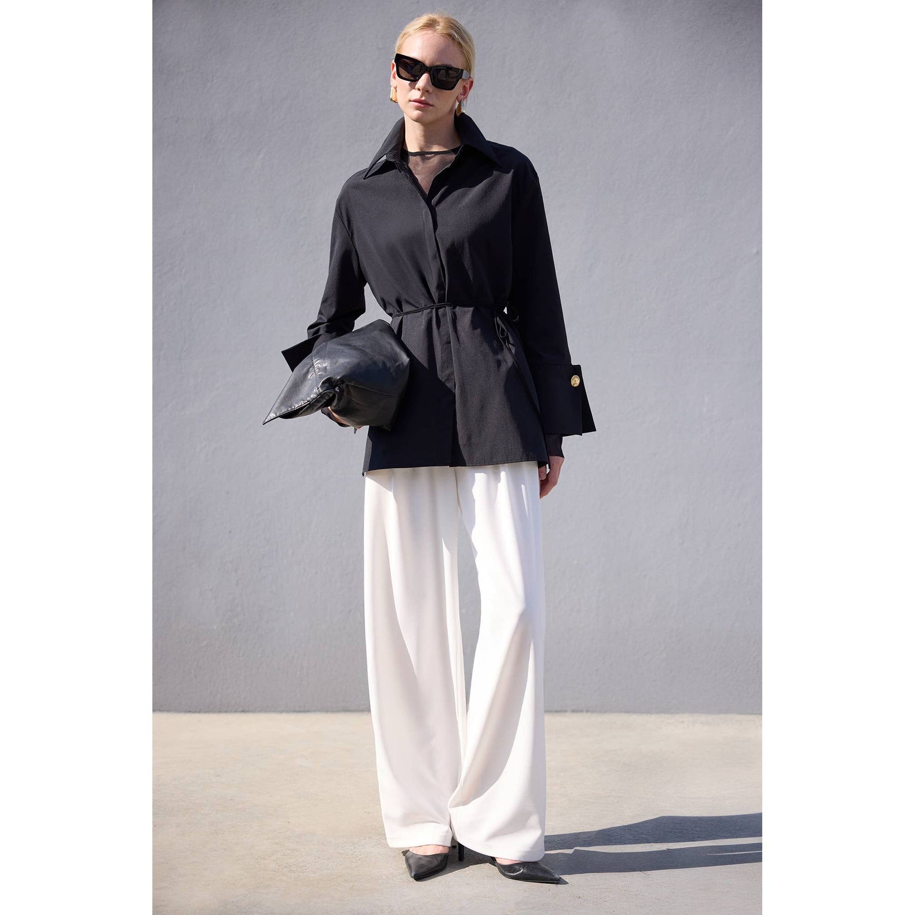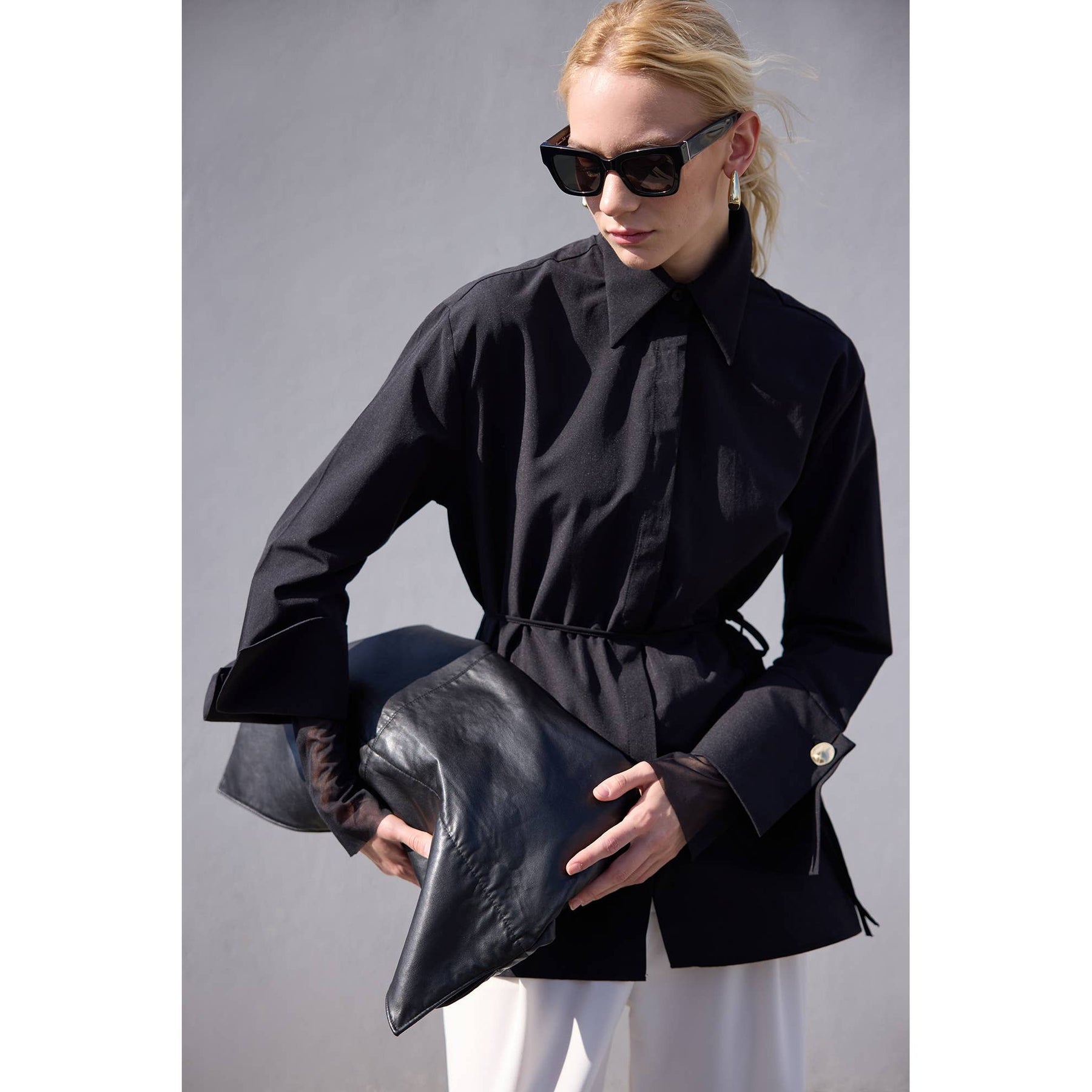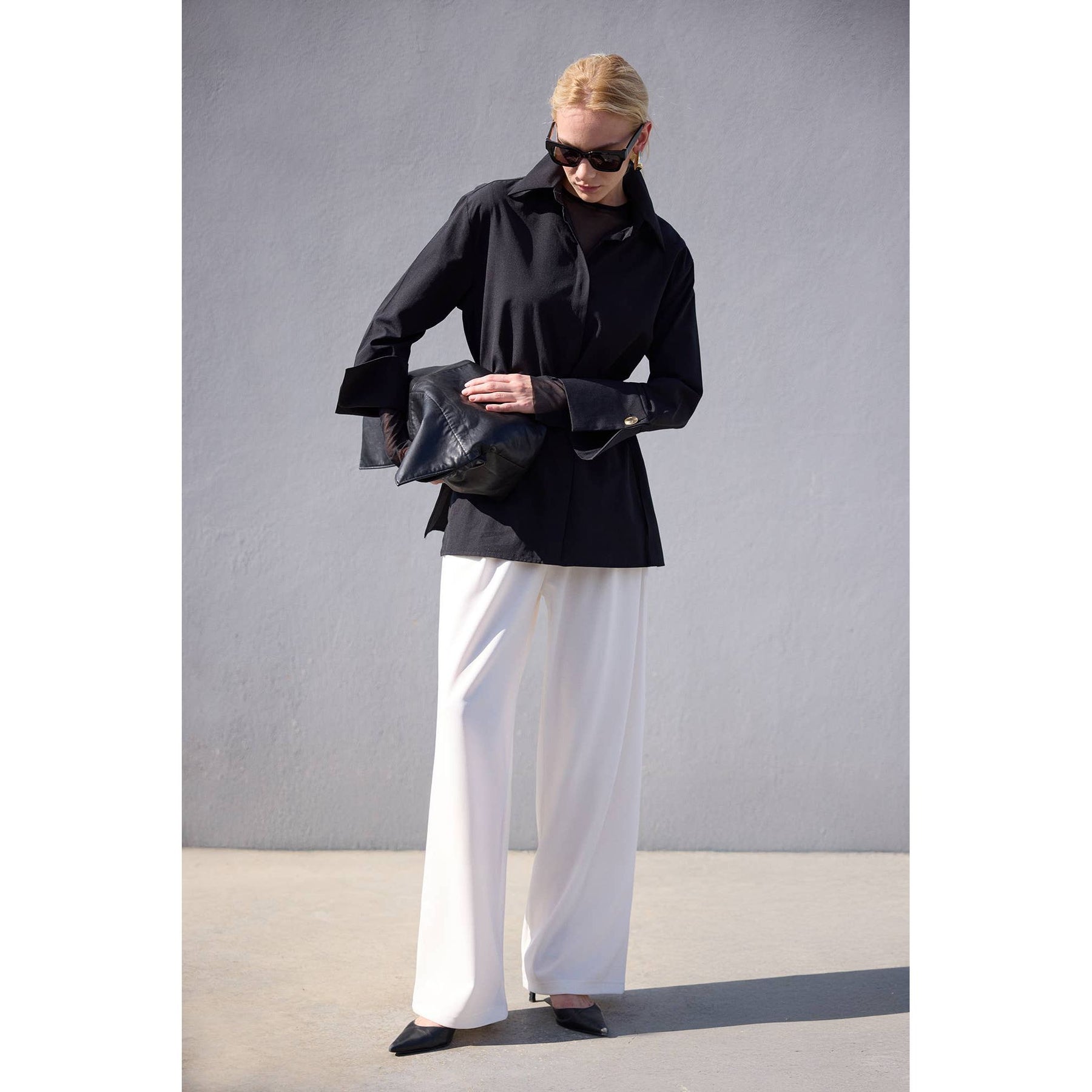 Elevate your smart-casual and evening ensembles with this sophisticated black poplin shirt featuring bold wide cuffs and polished gold-tone buttons. Its relaxed, tunic-length silhouette drapes effortlessly while maintaining structure with a classic shirt collar and hidden button placket. Designed with high side slits for easy layering, this versatile shirt pairs seamlessly with tailored trousers or statement sequin pants for an effortlessly elegant look.